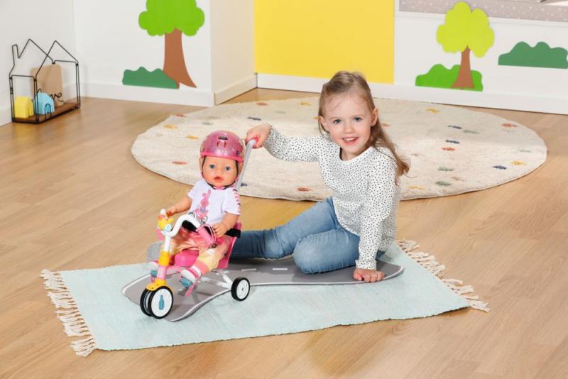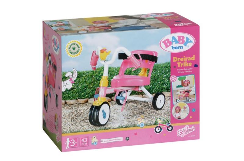 Pozor, prichádza BABY born! Na svojej novej trojkolke preteká s medvedíkom Teddym a kamarátkou Evou. Vďaka funkčným kolieskam môže BABY born na svojej trojkolke jazdiť ako na skutočnej trojkolke. Klaksón v tvare kačičky Berty sa postará o to, aby sa jej nikto nepriplietol do cesty. Pútka na pedále a bezpečnostné pásy zaisťujú bezpečnú jazdu. Aby BABY born nemohla jednoducho sama odísť, je k dispozícii odnímateľná 45 cm dlhá vodiaca tyč, ktorú je možné k trojkolke pripevniť. To znamená, že BABY born je možné na trojkolke tiež voziť na prechádzky a tlačiť ju, pokiaľ má príliš unavené nohy. V animovanom seriáli pre deti sa BABY born Emma na trojkolke vydáva na dobrodružnú cestu s kamarátkou Evou a medvedíkom Teddym a spoločne vyrážajú za padajúcou hviezdou. Ak chcete zažiť vzrušujúce dobrodružstvo s nimi, pozrite sa na náš kanál BABY born v češtine na YouTube