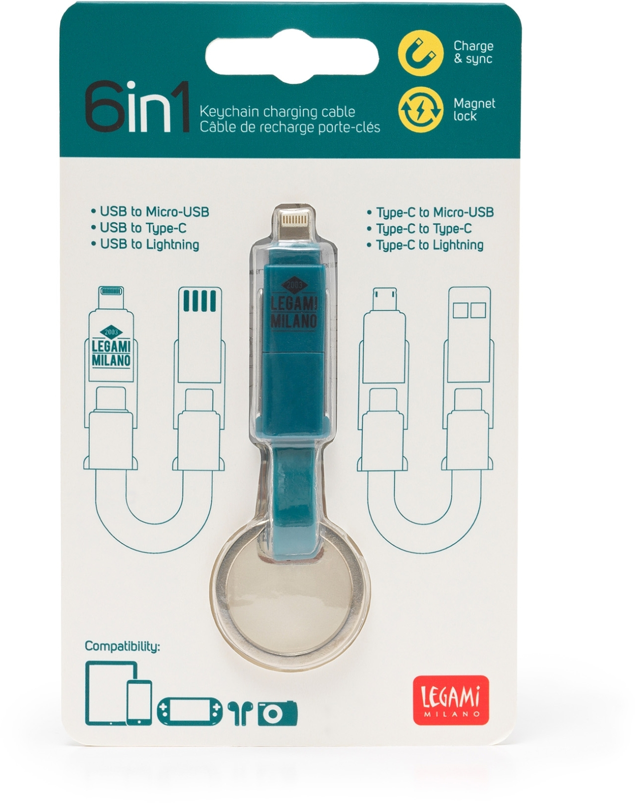 Nabíjací kábel Legami 6 v 1 pre kľúče. Kombinuje 6 rôznych káblov v jednom, nabíja všetky vaše zariadenia a dokonca umožňuje synchronizovať dáta medzi smartfónom a notebookom. Nabíjanie môžete prenášať aj z jedného zariadenia do druhého, pričom ako zdroj môžete použiť stranu s konektorom USB.