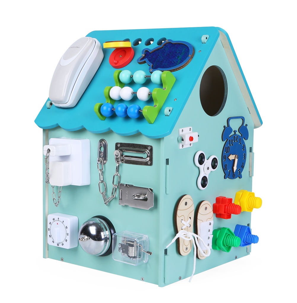 Farba domčeka na fotografii je ilustratívna, v skutočnosti sa farebné tyrkysové odtiene môžu trochu líšiť. Od zvončeka až k telefónu! Tento domček prináša množstvo zábavy, vďaka ktorej bude môcť Vaše dieťa rozvíjať svoju zručnosť, zvedavosť a najmä jemnú motoriku. Zámky, opasky a šnúrky dávajú dieťaťu možnosť precvičovať rôzne viazanie, spájanie, otáčanie či otváranie a pripraviť sa tak zábavným spôsobom na každodenné úkony. Okrem aktivít zapájajúcich zmyslové schopnosti doska disponuje aj edukatívnymi prvkami ako je počítadlo alebo hodiny. Domček sa dodáva zložený v krabici. Hlavné vlastnosti: podporuje nezávislosť, jemnú motoriku a koordináciu ruka-okopodnecuje kreatívne myslenie a vývoj predstavivostitelefónne slúchadlo neobsahuje kábel, čo eliminuje riziko uškrteniasenzorická stimuláciaedukácia cez hrudomček sa dodáva zložený v krabici