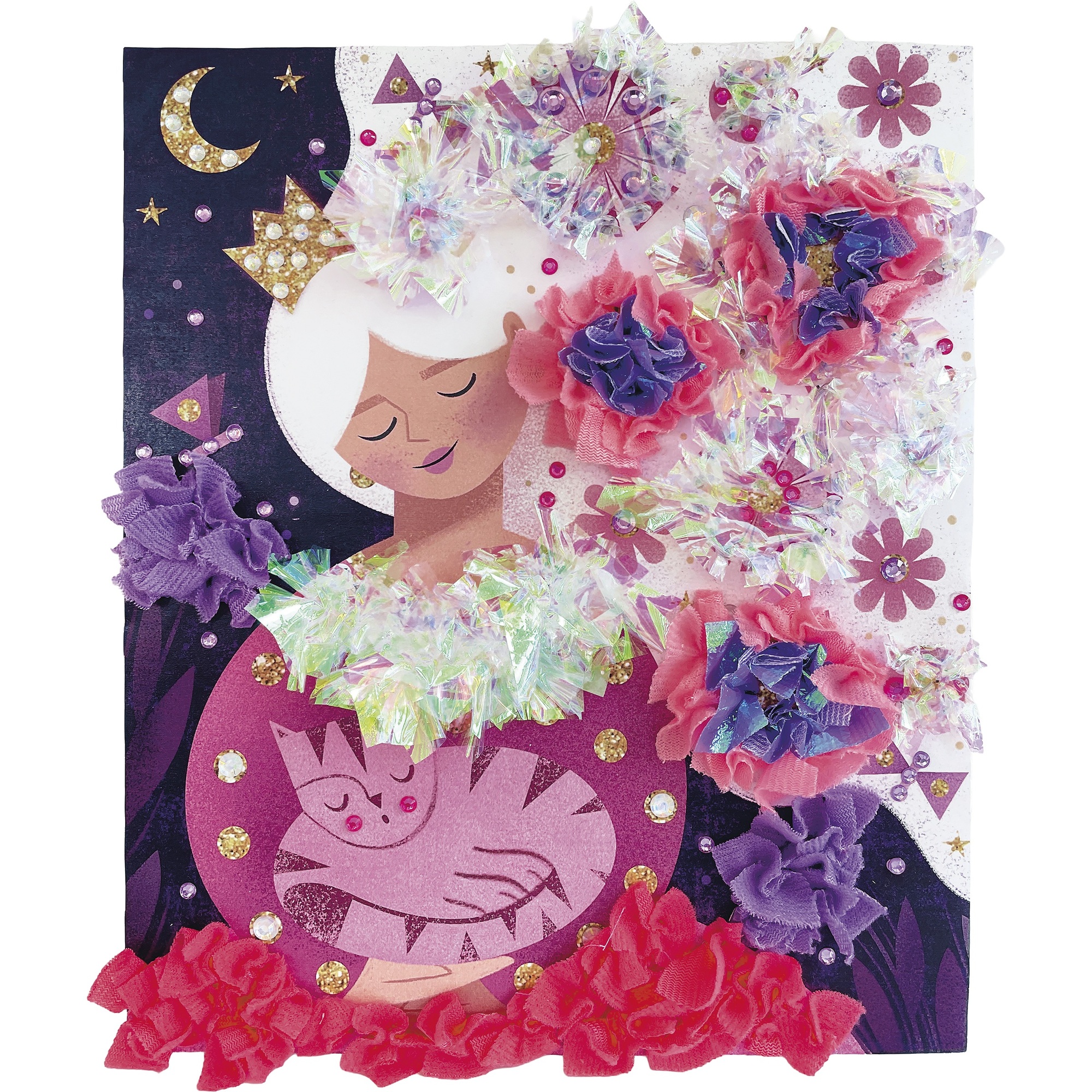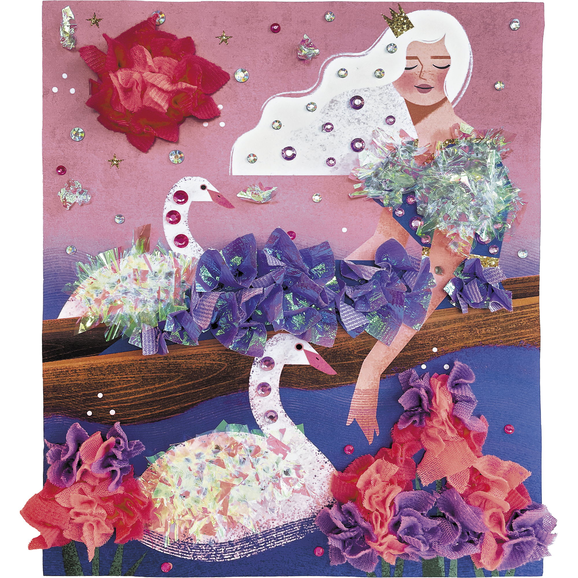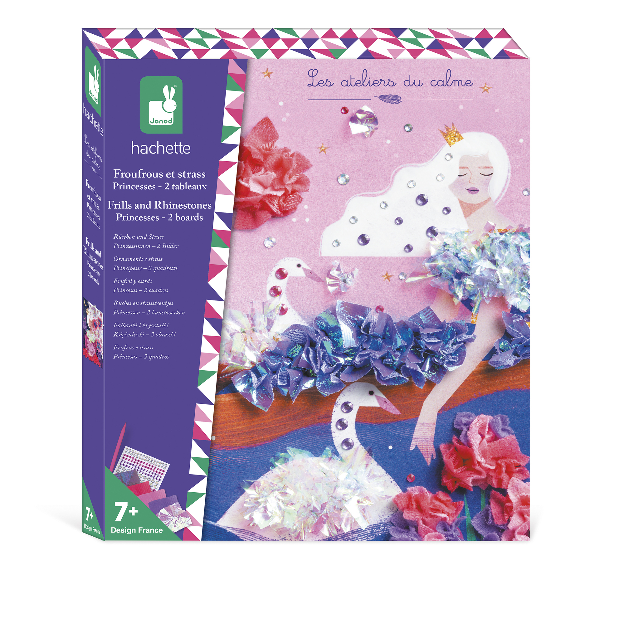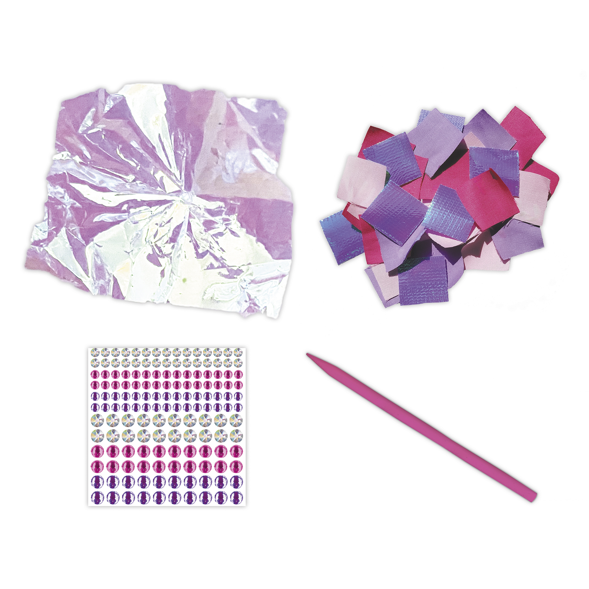 Vytvorte si volánikové šaty pre princeznovku! Táto sada na tvorenie obsahuje 2 obrázky, ktoré sa dajú ozdobiť štvorcovými kúskami hodvábneho papiera. Obsahuje 2 penové podložky (hrúbka 5 mm, 26 x 24,3 cm), preddierované otvory v tvare Y na prepichnutie hodvábneho papiera, 200 štvorcov hodvábneho papiera na prepichnutie, 200 štvorcov dúhového hodvábneho papiera na prepichnutie, 1 plastový nástroj na prepichnutie kúskov hodvábneho papiera do podložiek, 150 kamienkov (3 farby a 3 rôzne veľkosti) a 1 brožúrku s návodom a vzormi. Táto aktivita, ktorá pomáha rozvíjať trpezlivosť a kreativitu, trvá približne 40 minút. Je ideálna pre deti od 7 rokov.