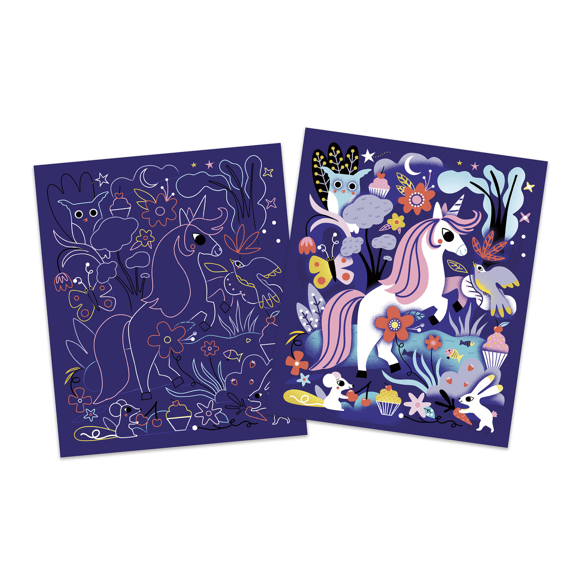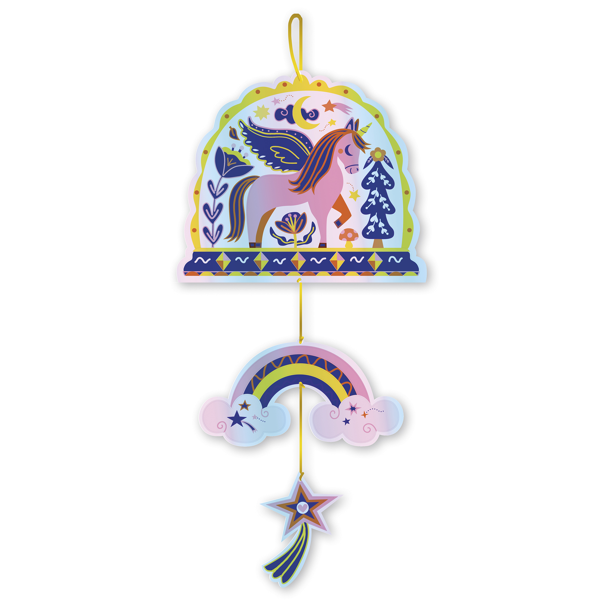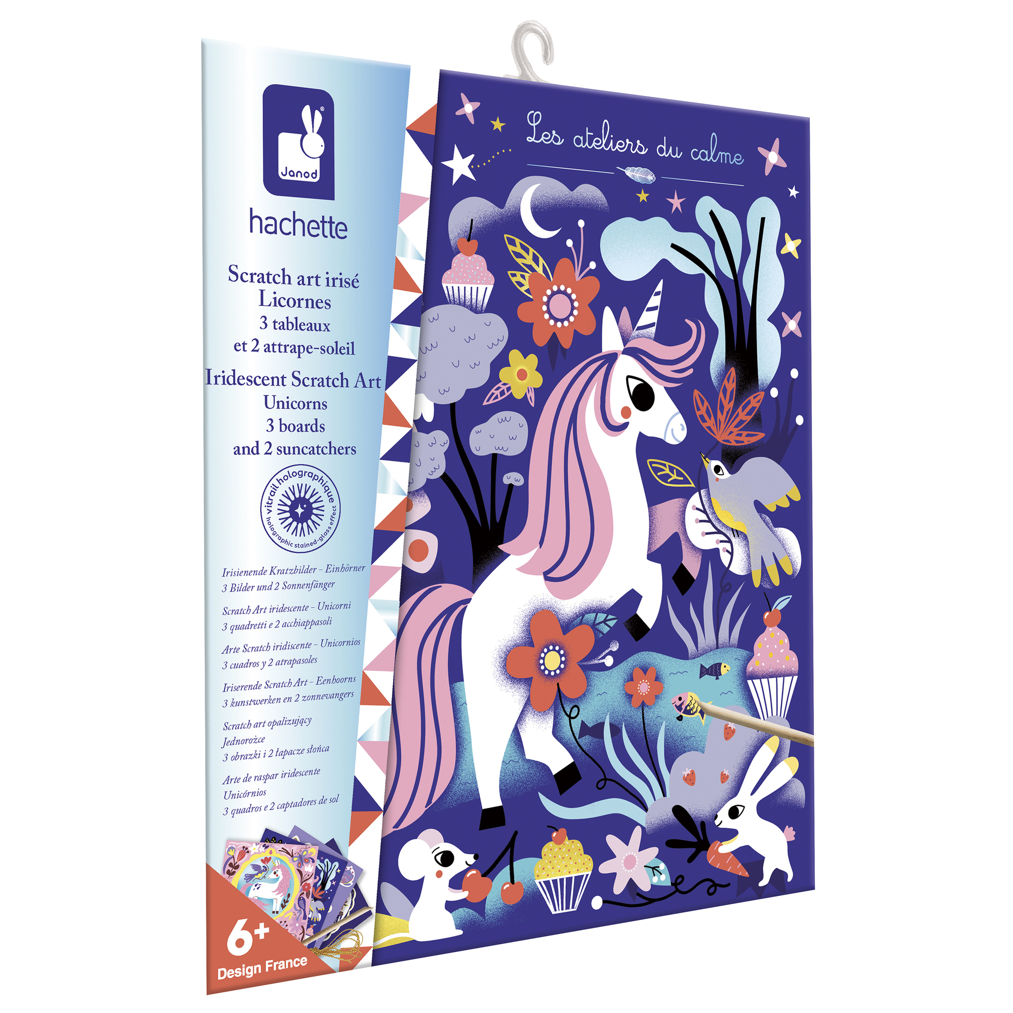 Dúhové jednorožce! Táto sada na tvorenie umožňuje vytvoriť 2 holografické závesné prvky a 3 obrázky! Obsahuje niť, drevené škrabadlo, 2 vopred vyrezané holografické podložky s potlačou PET so stieracím atramentom a 3 podložky potlačené v 4 farbách. Nádherný dúhový holografický efekt je zaručený! Táto aktivita, ktorá pomáha rozvíjať trpezlivosť, trvá približne 1 hodinu a 10 minút a je ideálna pre deti od 6 rokov.