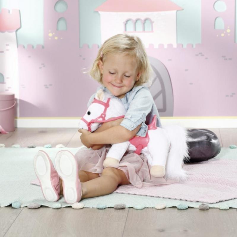 Čo by to bolo za princeznú bez koňa? Malé roztomilé princezné potrebujú malých roztomilých poníkov. Biely poníček má kráľovskú uzdu s trblietavou korunkou. Za ňou má poník pozorne nastražené smiešne ušká. Po stlačení pravého uška poník zaerdží alebo zafuní. Po stlačení ľavého uška začujete dupot kopýt. Bábika Baby Annabell Little je zamilovaná do svojho zvieracieho miláčika a často mu dáva pusinku na noštek. Poník odpovedá zvukom bozku. Malá princezná pri vychádzke sedí pohodlne v sedle. Perfektne formované jazdecké sedlo zabezpečí, že v ňom má bábika pri jazde potrebnú stabilitu. • Originálne doplnky pre originálnu bábiku Baby Annabell. • So zvukovými efektmi. • Hra s bábikou a príslušenstvom prebúdza chuť k hre s bábikou a podporuje rozvoj empatie a zmyslu pre zodpovednosť u detí od jedného roka. • Funguje na batérie (nie sú súčasťou balenia). Baby Annabell Little Sweet Poník pre bábiky veľkosti 36 cm so zvukovými efektmi. Súčasťou je sedlo formované na upevnenie bábiky a uzda.