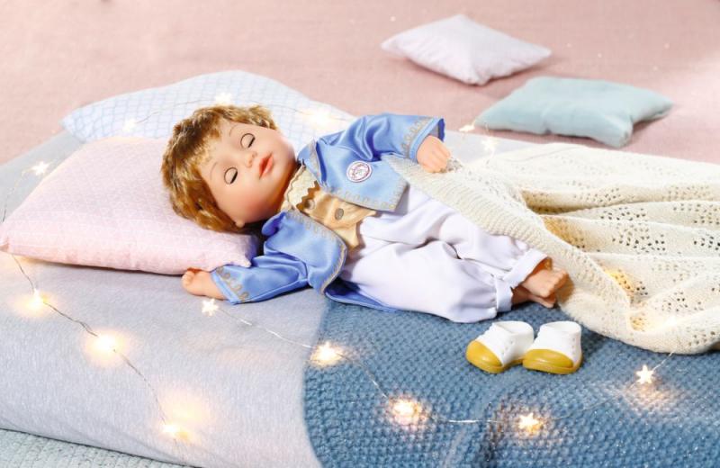 V krásnom malom princovi našla princezná Little Annabell konečne partnera na tréning kráľovského valčíka. Bábika - chlapec veľkosti 36 cm nosí zlato-biele topánky, ktoré sú to pravé na tanečný parket. Biele nohavice sú zboku potlačené zlatým prúžkom. Horná časť oblečenia je 2v1: zlatá vesta s kráľovsky modrým kabátikom a našitou čipkovou náprsenkou. Oblečenie je ušité v strihu „easy fit“ a jeho prezliekanie hravo zvládnu aj najmenšie ručičky. Vysoko kvalitné vlásky na vinylovej hlavičke vyzerajú vždy dokonale, bez ohľadu na to, ako zapálene princ tancuje. Akonáhle lekcia tanca skončí, princ si vždy rád zdriemne a sníva o budúcom plese na kúzelnom zámku. Keď sa princ s látkovým telíčkom položí na chrbát, zavrie oči. • Originálna bábika Baby Annabell. • Model pre najmenších (36 cm) s mäkkým telíčkom. • Oblečenie v strihu „easy fit“ pre ľahké prezliekanie. •So žmurkajucimi očami. • Pozvoľna prebúdza chuť k hre s bábikou a podporuje rozvoj empatie a zmyslu pre zodpovednosť u detí od jedného roka. Baby Annabell Little Sweet Princ je bábika veľkosti 36 cm v 2v1 tope, nohaviciach a topánočkách.