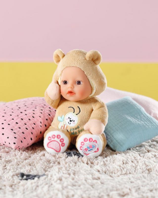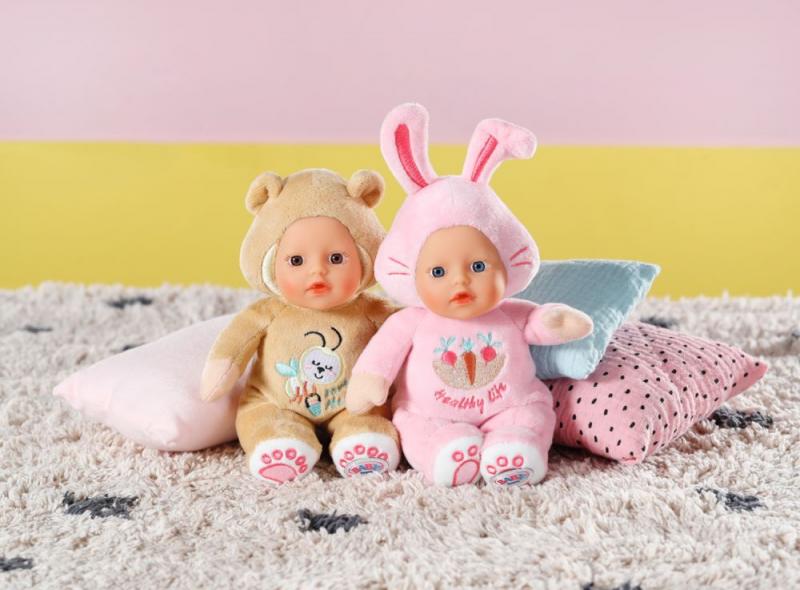 Tieto bábiky sú zvieracími kamarátmi pre najmenšie deti už od narodenia. Bábiky veľkosti 18 cm majú optimálnu veľkosť pre malé detské ručičky. Deti môžu skúmať mäkkú látku, ťahať zvieratká za roztomilé ušká a chvostíky a objavovať šušťanie fólie vo vnútri. Plyšový kožúšok medvedíka a zajačika zdobia hravé výšivky. Z nich je jasné, že medvedíkovi záleží hlavne na mede a včelích kamarátoch. Zajačik sa vyzná v otázkach zdravej výživy a zaujíma ho mrkva a červená repa. Za pozornosť stoja aj zlaté výšivky labiek na chodidlách. A keby sa trochu divočilo, možno oboboch ľahko vyprať v ruke na 30 ° C. • Originálna bábika BABY born. • Model „pre najmenších“ (18 cm) s veľmi mäkkým telíčkom. • Vhodná aj pre najmenšie deti už od narodenia. • So šuštivou fóliou vo vnútri. • Možno ručne prať. BABY born for babies Maznáčik je bábika veľkosti 18 cm so šuštivou fóliou vo vnútri. Na výber zajačik alebo medvedík.