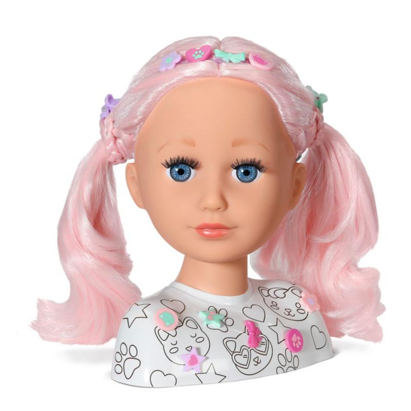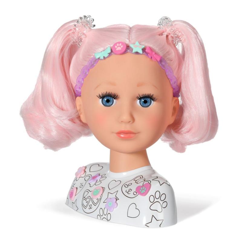 S BABY born Kreatívnou česacou hlavou sa fantázii a kreativite medze nekladú. Česaciu hlavu vysokú 22 cm je možné nalíčiť a namaľovať pomocou dodaných fixiek a šablóny. Ale to nie je všetko: vyfarbiť sa dá aj tričko bábiky. Tričko môžete tiež dozdobiť niektorými z 10 nacvakávacích ozdôb. Zlatým klincom sú samozrejme dlhé ružové vlasy z vysoko kvalitného nylonu. Pomocou doplnkov z balenia je možné vykúzliť tie najúžasnejšie účesy. Čelenku do vlasov môžete tiež ozdobiť farebnými nacvakávacími ozdobami.