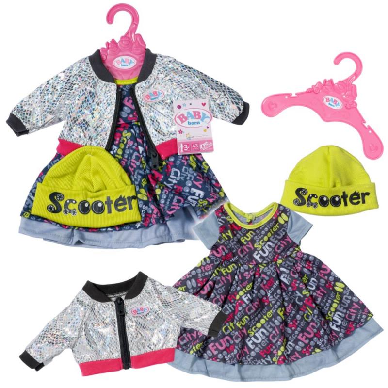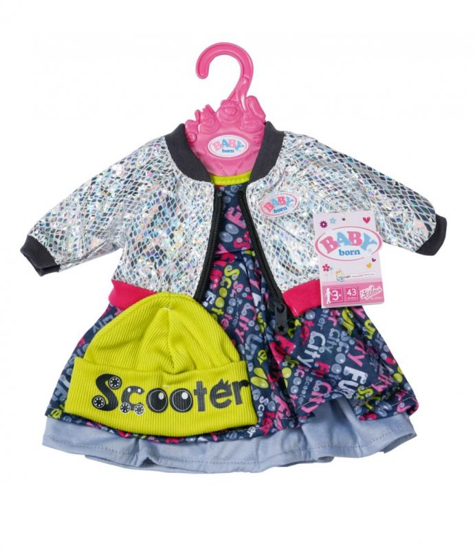 "Takýto výlet do mesta nie je len tak. Vždy treba zvoliť vhodné a hlavne štýlové oblečenie. A presne to spĺňa táto súprava. Vďaka vrstveným šatám vyzerá BABY born v rušných mestských uliciach veľmi elegantne. Do mesta BABY born vyráža na skútri. Aby jej prilba nezničila účes, nasadí si pod ňu ešte žltú čiapku. Ako ochranu proti vetru nosí bundu s lesklým strieborným vzorom. Kontrastné manžety a zips dokonale ladia s písmenkovou potlačou na šatách. • Kvalitné oblečenie pre originálnu bábiku BABY born. • Pre radosť z nápaditej, rozmanitej a dlhotrvajúcej hry. • Veľmi ľahké prezliekanie. BABY born Oblečenie na skúter pre bábiky veľkosti 43 cm. Súčasťou sú šaty, bunda a čiapka."