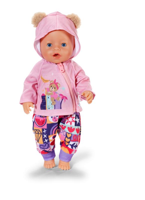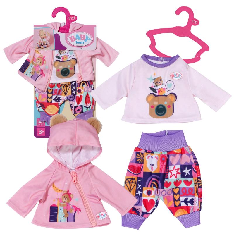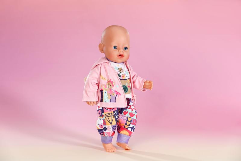 "Roztomilý oblečenie pre bábätko sa skladá z troch častí: farebných nohavíc s fialovými lemami a patchworkovým vzorom vo veselých farbách, svetlo fialového trička s dlhým rukávom ozdobeného obrázkom medvedíka a roztomilej ružovej bundy s kapucňou, ktorá má roztomilé hebké ušká. Vďaka tomuto outfitu je BABY born vždy krásne v teple. • Oblečenie pre bábätko skladajúce sa z nohavíc, trička a bundy • Nohavice s farebným patchworkovým vzorom • Tričko s dlhým rukávom vo svetlo fialovej farbe s motívom medvedíka • Bunda s kapucňou, zipsom a uškami medvedíka • Vhodné pre bábiky veľkosti 43 cm a pre medvedíkov BABY born Teddy • S ramienkom z recyklovaného materiálu • Kvalitný doplnok pre radosť z nápaditej, rozmanitej a dlhotrvajúcej hry"