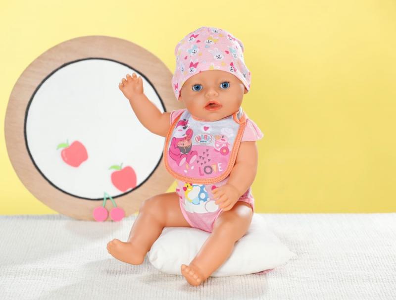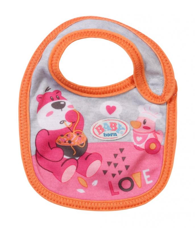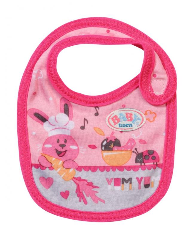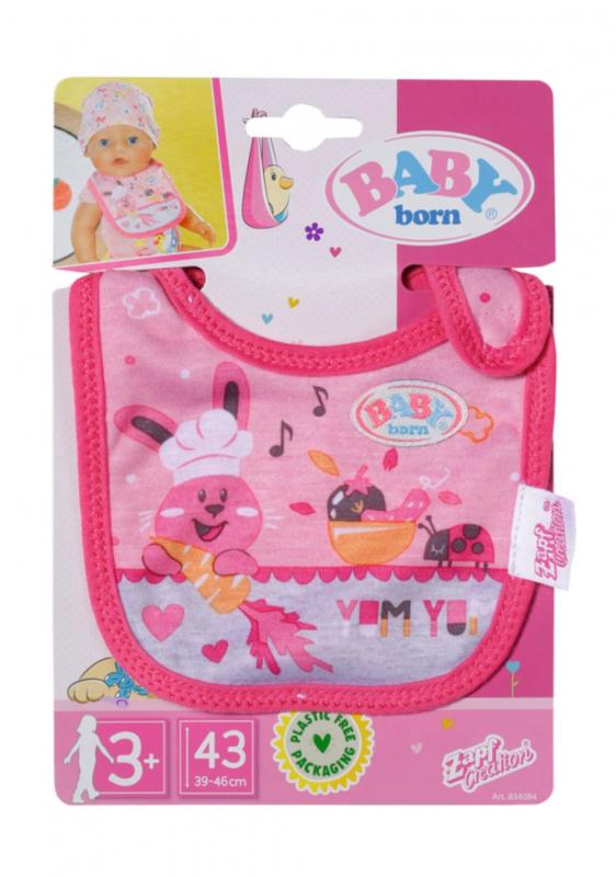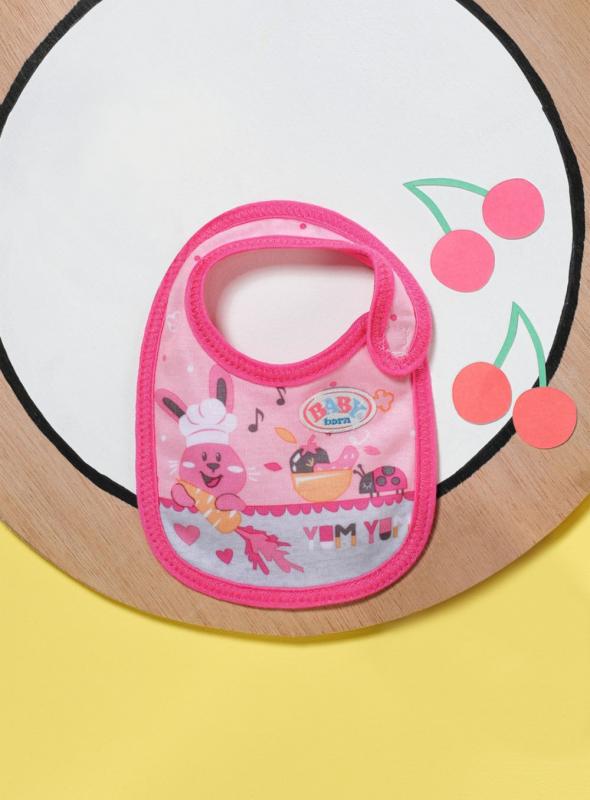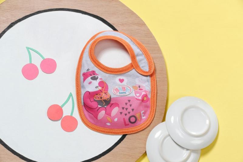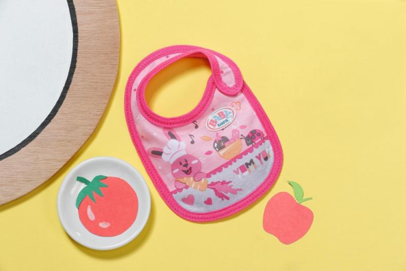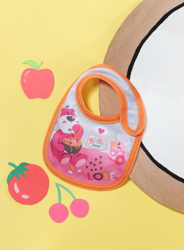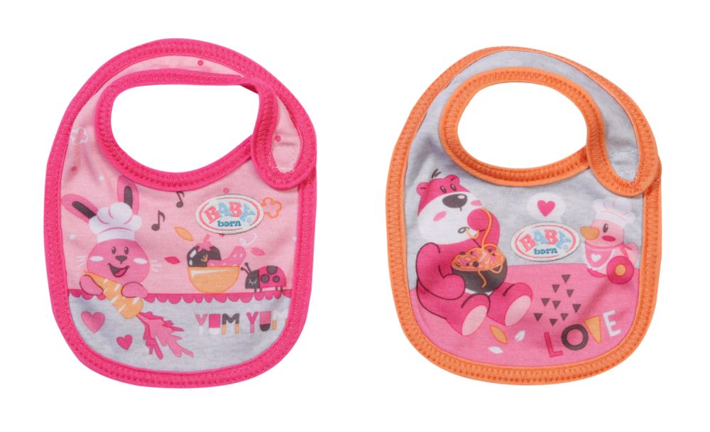 " Tu sa niekto ušpinil. Akonáhle BABY born pije mlieko alebo je kašičku, vždy sa niečo rozleje. Čím viac si jedlo užíva, tým viac sa zašpiní. Preto má malý papkáč pripravené dve náhradné podbradníky. Na ružovom podbradníku je obrázok zajačika Benna v kuchyni. Pozná tie najlepšie recepty na prípravu mrkvičky. Na oranžovom podbradníku spokojne hoduje medvedík Bruno. Chutia mu ale iba špagety, ktoré pripraví kačička Berta. • Kvalitný doplnok pre značkovú bábiku BABY born. • Pre radosť z nápaditej, rozmanitej a dlhotrvajúcej hry. • Vhodné pre bábiky veľkosti 36 a 43 cm. BABY born Podbradník pre bábiky veľkosti 36 cm a 43 cm v dvoch rôznych prevedeniach."
