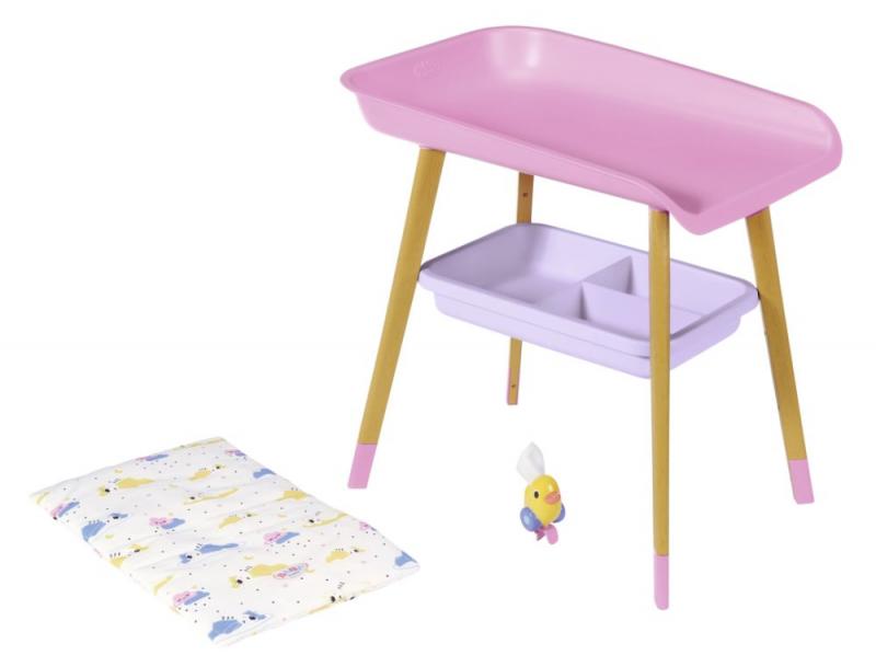 Zle prebalené? To sa s prebaľovacím stolom BABY born nemôže stať. Stôl v škandinávskom štýle má nohy vo vzhľade dreva a skvele sa hodí do detskej izbičky k Jedálenskej stoličke a Stojanom na oblečenie. Kým bábika BABY born leží na mäkkej prebaľovacej podložke, kačička Berta sleduje prebaľovanie a okrem toho, že BABY born utešuje, tiež ponúka obrúsky. V trojdielnej priehradke pod prebaľovacou podložkou je možné uložiť čisté plienky, oblečenie alebo hračky. • Kvalitný doplnok pre originálnu bábiku BABY born. • Pre radosť z nápaditej, rozmanitej a dlhotrvajúcej hry. • Vhodný aj pre menšie bábiky. BABY born Prebaľovací stôl s odnímateľným zásobníkom obrúskov.