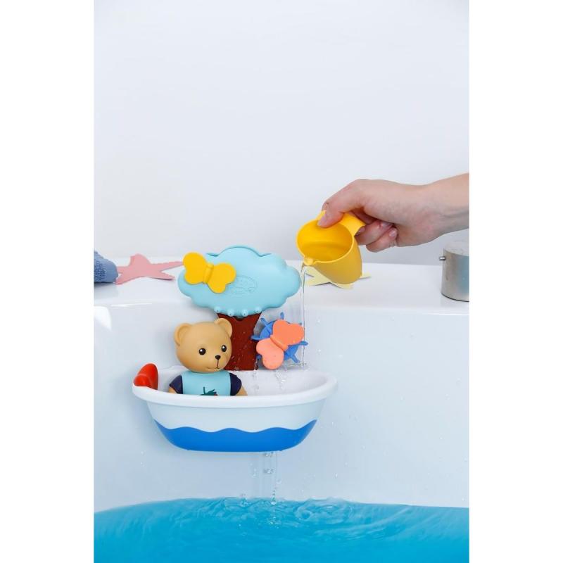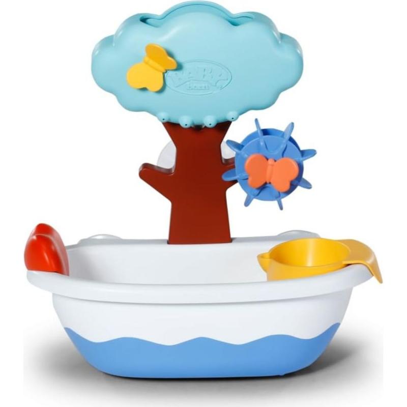"BABY born Splish Splash Teddy v kúpacom oblečení s funkciou plávania a s hračkou do vane. • BABY born medvedík Teddy má praktickú veľkosť 15 cm,vytlačené plavky a mechanickú funkciu plávania • Vanička so stromovou sprchou, otočným vodným kolesom a nádobkou na vodu a s motýlikmi • S prísavkami na upevnenie na vaňu alebo na sprchovú stenu • Vhodné pre deti od 1 roka"