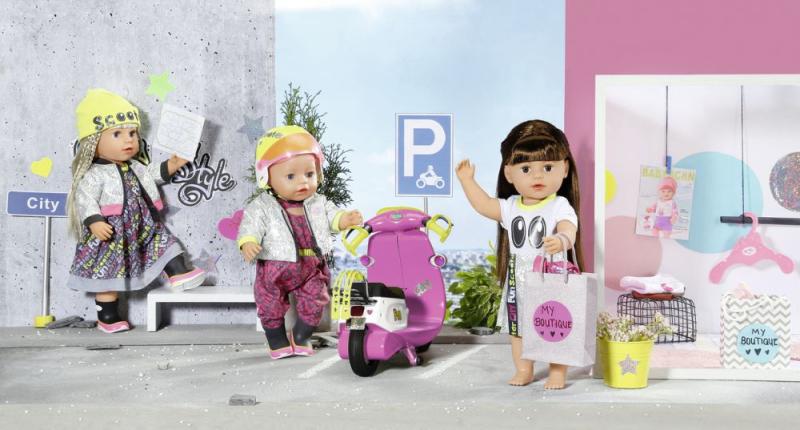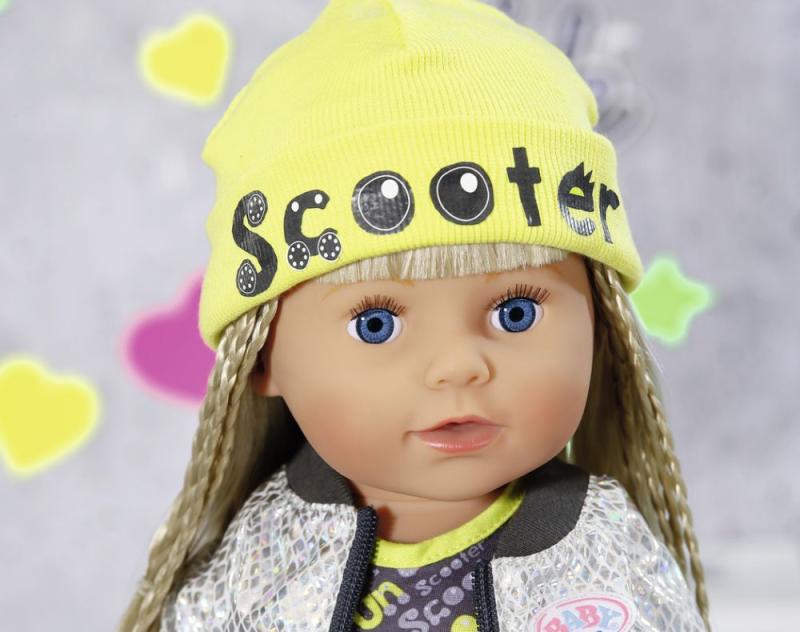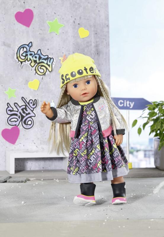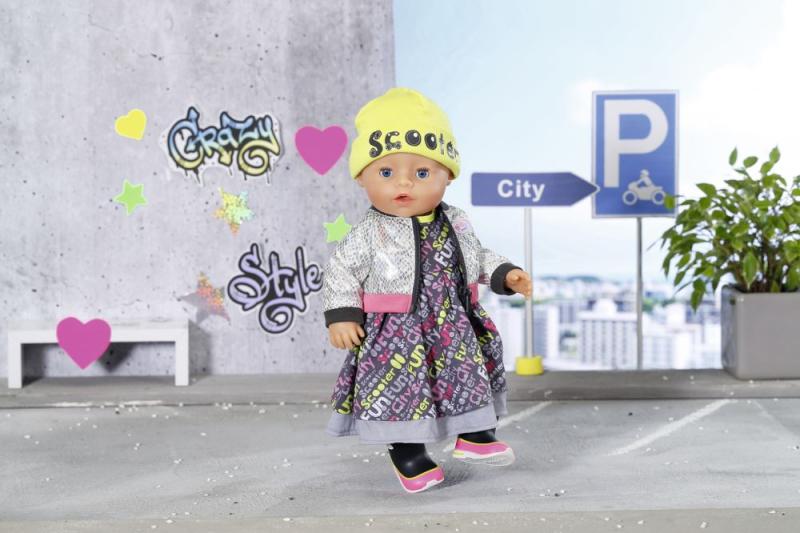 "Takýto výlet do mesta nie je len tak. Vždy treba zvoliť vhodné a hlavne štýlové oblečenie. A presne to spĺňa táto súprava. Vďaka vrstveným šatám vyzerá BABY born v rušných mestských uliciach veľmi elegantne. Starší braček ju obvykle vozí do mesta na skútri. Aby jej prilba nezničila účes, nasadí si pod ňu ešte žltú čiapku. Ako ochranu proti vetru nosí bundu s lesklým strieborným vzorom. Kontrastné manžety a zips dokonale ladia s písmenkovou potlačou na šatách. Parádne topánky hrajú farbami a dokresľujú celkový vzhľad. • Kvalitné oblečenie pre originálnu bábiku BABY born. • Pre radosť z nápaditej, rozmanitej a dlhotrvajúcej hry. • Veľmi ľahké prezliekanie. BABY born Súprava do mesta Deluxe pre bábiky veľkosti 43 cm. Súčasťou sú šaty, bunda, čiapka a topánky."