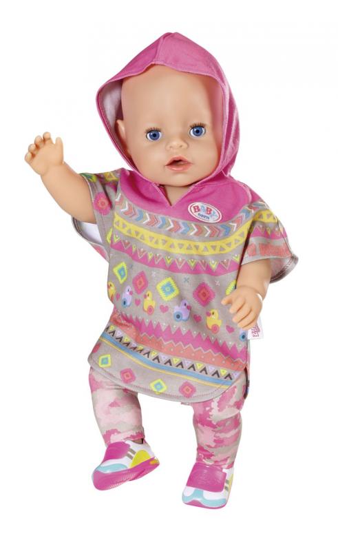 Toto pončo je trendy a pohodlné. Je ozdobené potlačami kačičky Berty a veľmi aktuálnych etno vzorov. Ponúka dostatočnú voľnosť pohybu a je rýchlo oblečené. Model to síce nie je práve nenápadný, ale aj tak sa k nemu skvele hodia nohavice s maskovacím vzorom v tmavo ružovej, svetlo ružovej a šedej farbe. Tomuto maskovaciemu vzoru sa hovorí kamufláž. Model dopĺňajú krásne tenisky. • Kvalitné oblečenie pre originálnu bábiku BABY born. • Pre radosť z nápaditej, rozmanitej a dlhotrvajúcej hry. • Veľmi jednoduché prezliekanie. BABY born Súprava s pončom Deluxe pre bábiky veľkosti 43 cm. Súčasťou je pončo, nohavice a topánky.