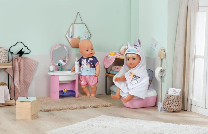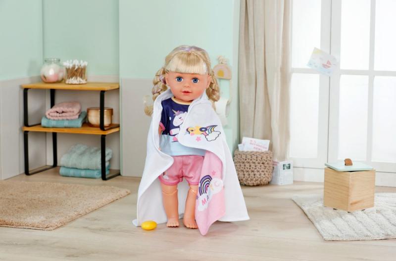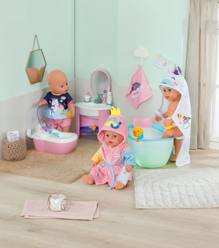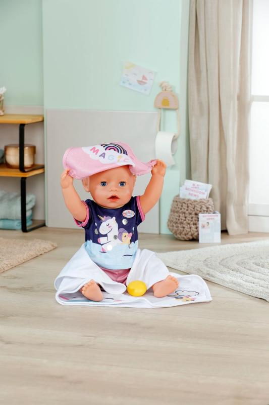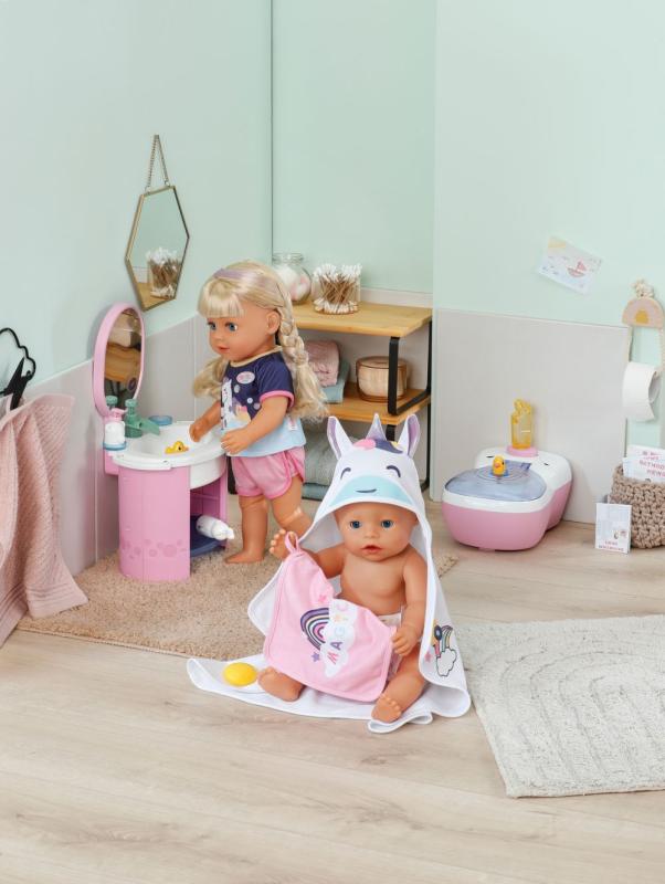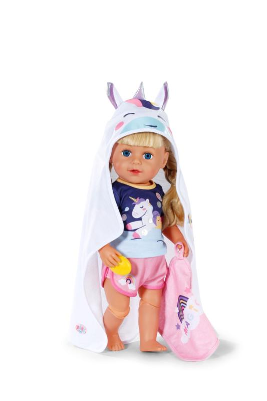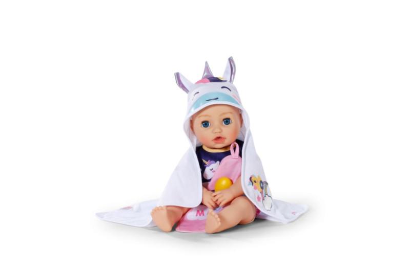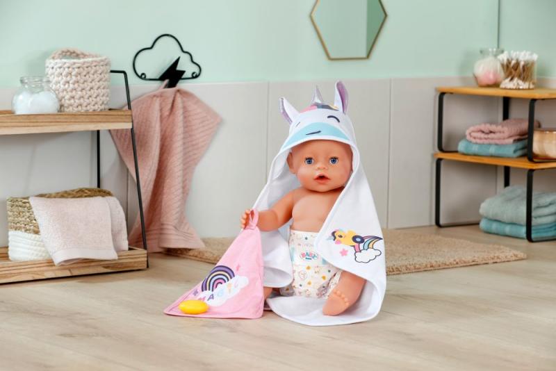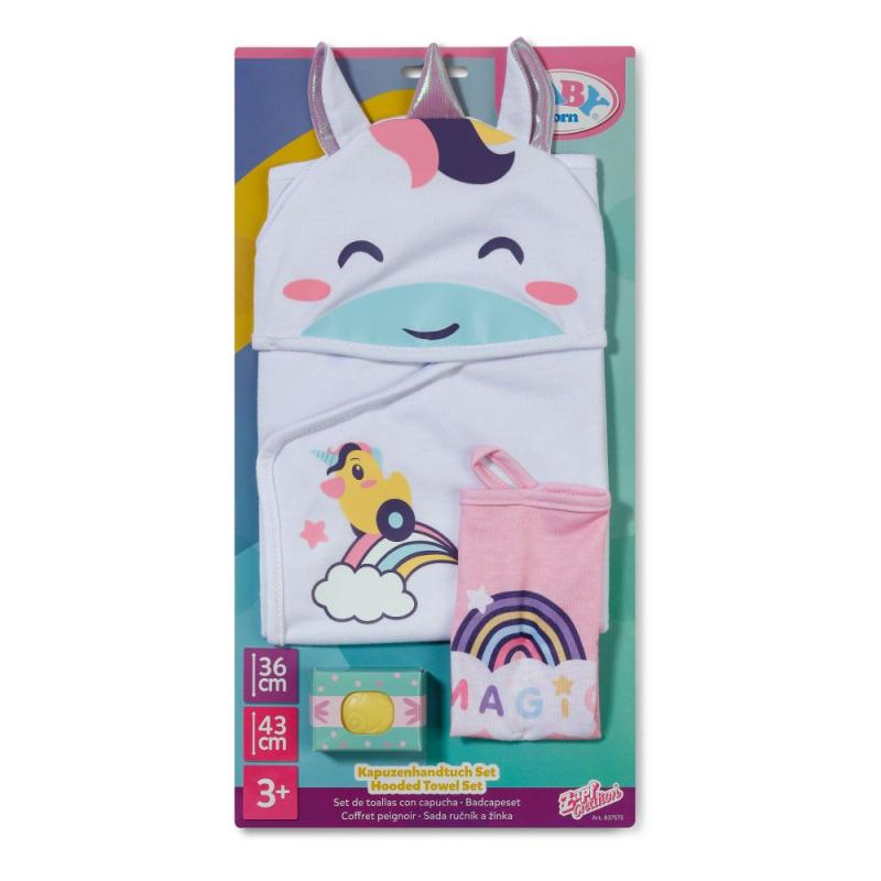 "BABY born Sada uterákov s jednorožcom a dúhou. • Dva uteráky s motívom jednorožca a dúhy • Kapucňa s potlačou jednorožca, dúhovým rohom a roztomilými uškami • Mäkký materiál: zaisťuje príjemný pocit po kúpeli • Pre bábiky veľkosti 36 cm a 43 cm"