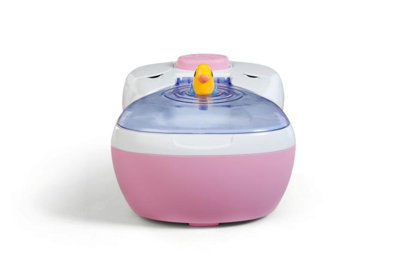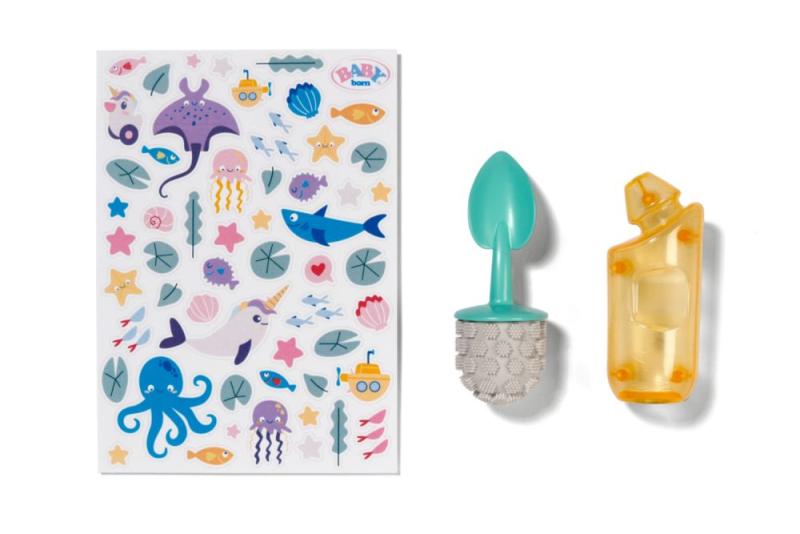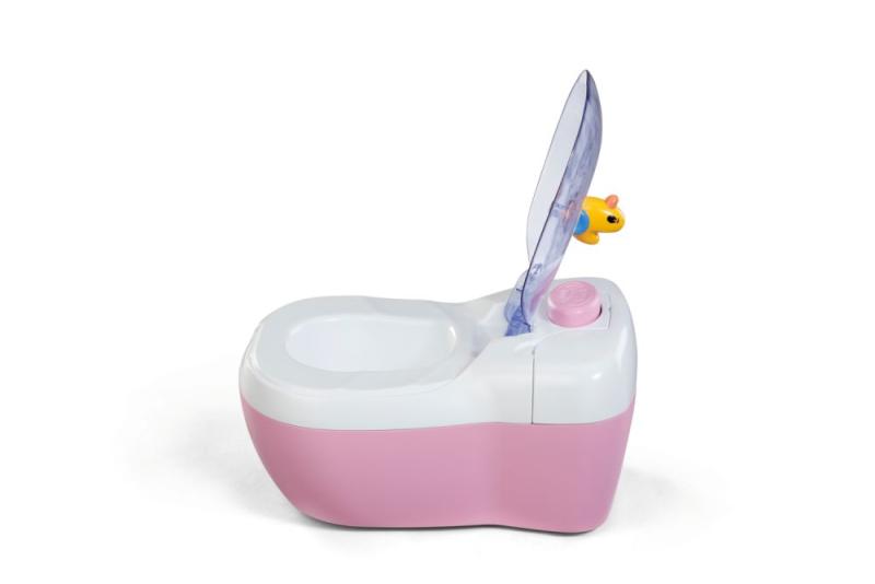 "BABY born toaleta s vodným prekvapením a smiešnymi zvukmi. • Zábavné zvuky a melódie: Akonáhle BABY born sedí na toalete, budete počuť špliechajúce zvuky. Pokiaľ zostane na toalete sedieť dostatočne dlho, začne hrať vtipná melódia. Potom zaznie zvuk splachovania. • Kúzlenie s vodou: Keď sa do toalety nakvapká voda, objaví sa v nej obrázok cikania a kakania. • Hravý tréning hygieny: WC kefa a fľaštička na čistiaci prostriedok pomáhajú udržiavať toaletu čistú a je možné ich uložiť do praktických priehradok. • Kreatívny dizajn: Farebné samolepky s obrázkami podvodného sveta slúžia na ozdobenie toalety."