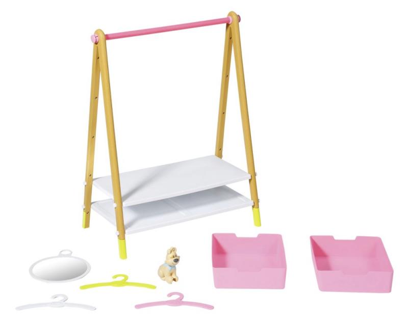 Psík Bello teraz pracuje pre módnu políciu. Z najvyššieho bodu stojanu na oblečenie doma stráži všetku módu pre BABY born a ostražito pozoruje nové modely. V zrkadle, ktoré je možné zložiť, si môže malá parádnica prezrieť svoje outfity na sebe. Stojan na oblečenie v škandinávskom štýle má vzpery vo vzhľade dreva. Na ružovom priečniku sú zavesené tri farebné vešiačiky na šaty. Okrem odkladacieho miesta na polici ponúkajú veľa miesta na doplnky a ďalšie maličkosti dve ružové priehradky. • Kvalitný doplnok pre originálu bábiku BABY born. • Pre radosť z nápaditej, rozmanitej a dlhotrvajúcej hry. • Vhodný aj pre menšie bábiky. BABY born Stojan na oblečenie so zrkadlom s odnímateľnou ozdobou v podobe psíka. Vrátane 3 vešiačikov na oblečenie a 2 zásuviek.