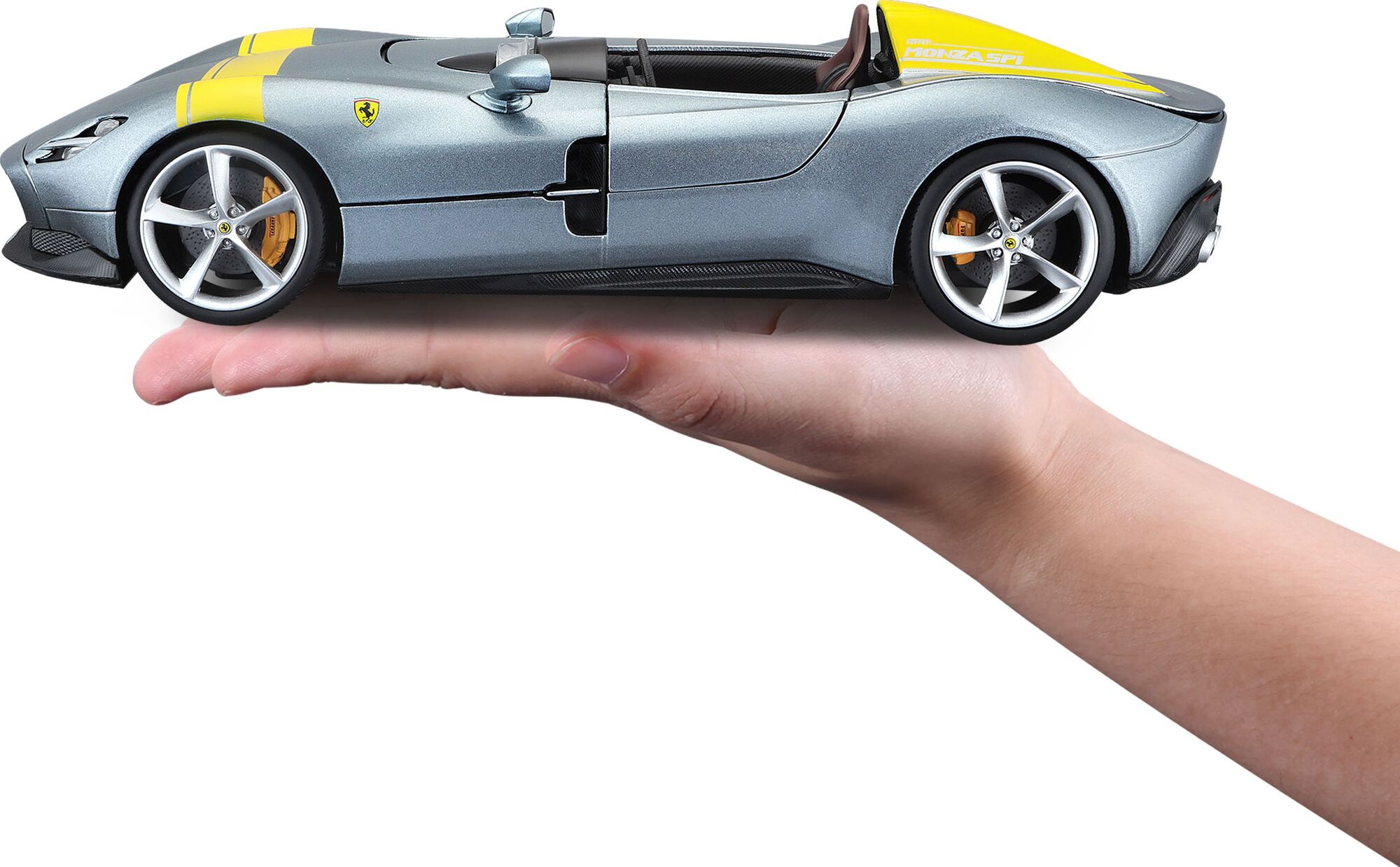 Bburago 1:18 Ferrari Monza SP1 Blue Kovový model auta 1:18 Bburago 18-16013 Ferrari Monza SP1 nielen pre zberateľov. Má odpruženú nápravu. Model je v špičkovej kvalite. Farba modelu je strieborná. Ferrari Monza SP1 a SP2 sú športové vozidlá vyrobené talianskou automobilkou Ferrari. Boli výroby v obmedzenom množstve, ktoré boli zavedené v roku 2018 pre modelový rok 2019. SP1 je jednomiestny Motor bol vyladený tak, aby generoval celkom 596 kW a max. rýchlosť 299 km/h. Podvozok voľne vychádza z modelu 812 a vozidlá SP1 a SP2 sú vybavené karosériou z uhlíkových vlákien. Vlastnosti Model má otváracie dvere a kapotu, natáčanie kolies volantom je plne funkčné. Karoséria je vyrobená zo zinkohliníkovej zliatiny. Karoséria je potlačená tampónovou tlačou kvalitnou farbou. Veľké množstvo detailov. Možné otvoriť dvere, kapotu. Detailne spracované svetlá a blinkre. Gumené pneumatiky.