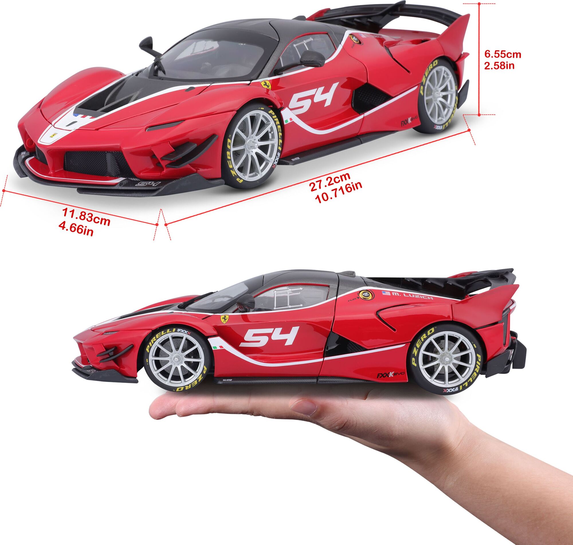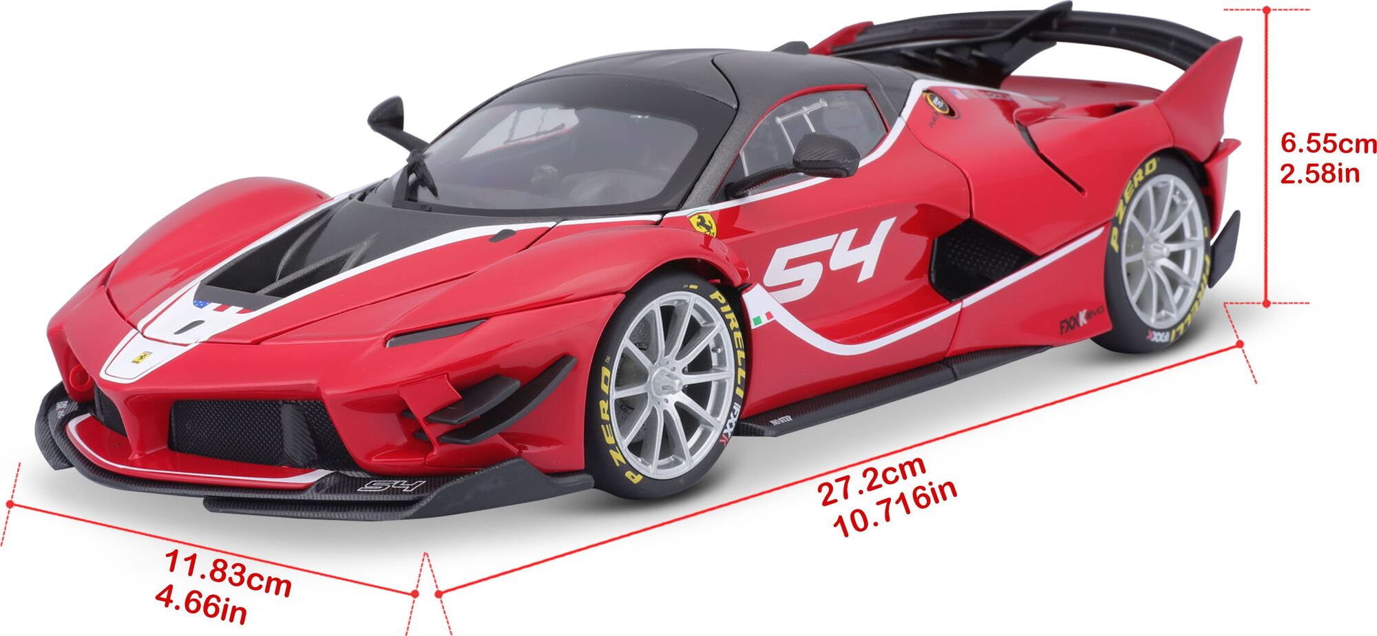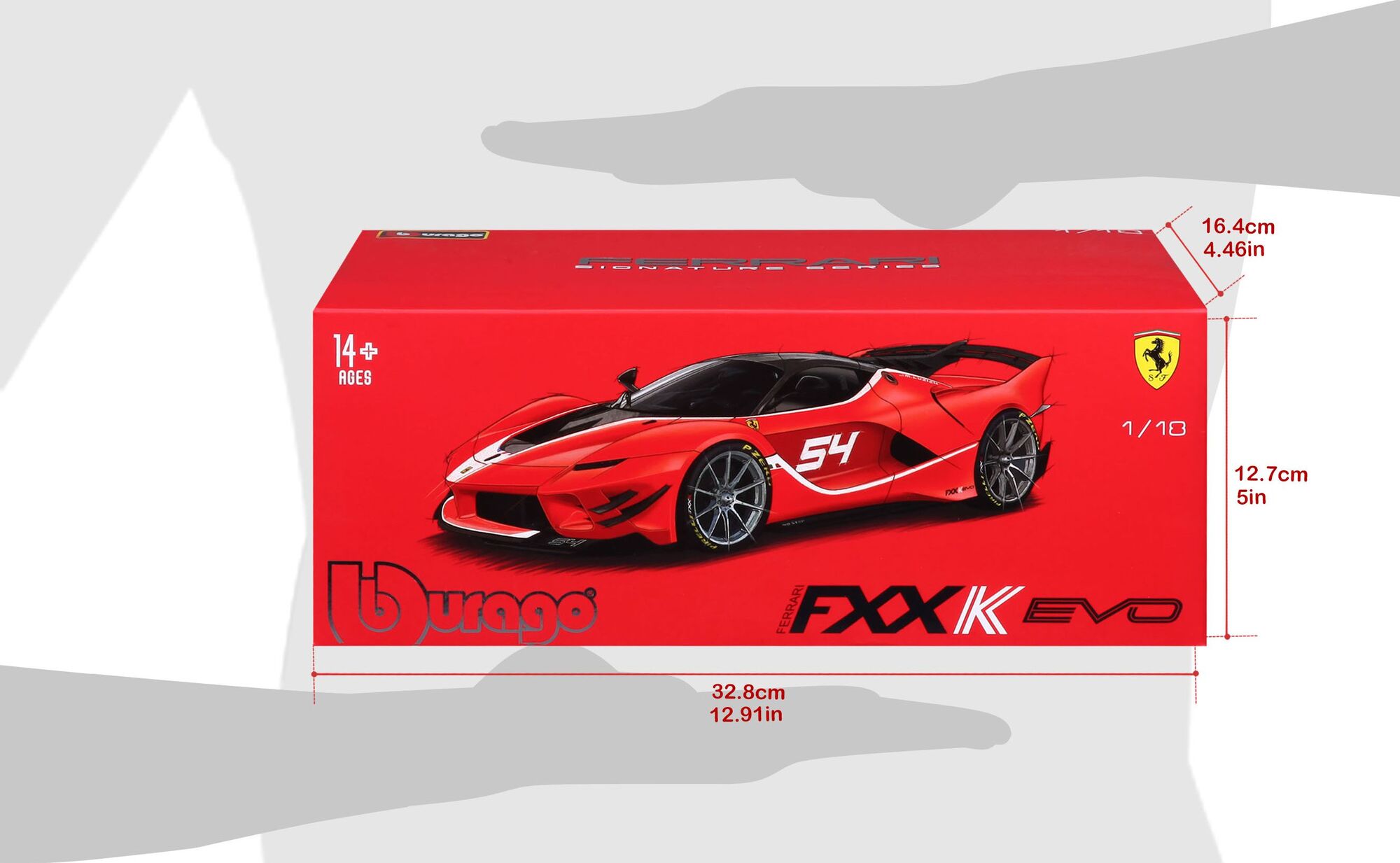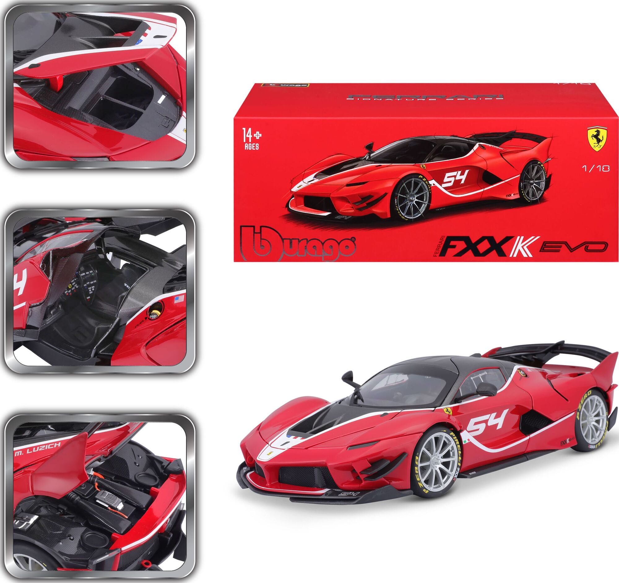 Bburago 1:18 Ferrari Sing FXX-K EVO No.54 (red) Model auta v mierke 1:18 vyrobený z kovových a plastových dielov.Balené v uzavretej papierovej krabičke, auto uložené v polystyrénovom výlisku.Hore výklopné dvere, otváracia predná a zadná kapota , natáčacie a odpružená kolieska.Dĺžka modelu cca 27 cm.