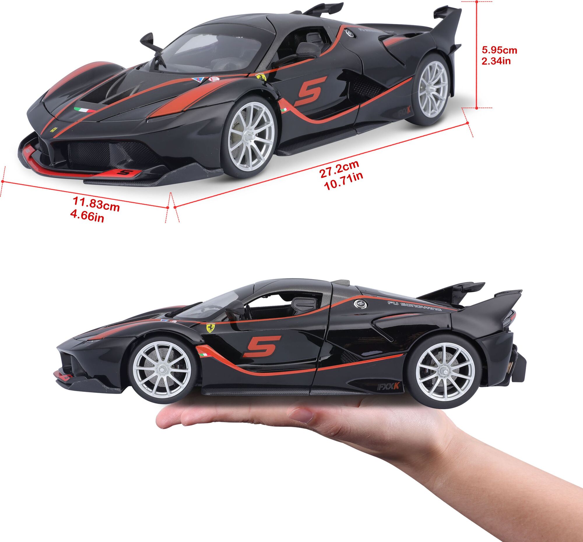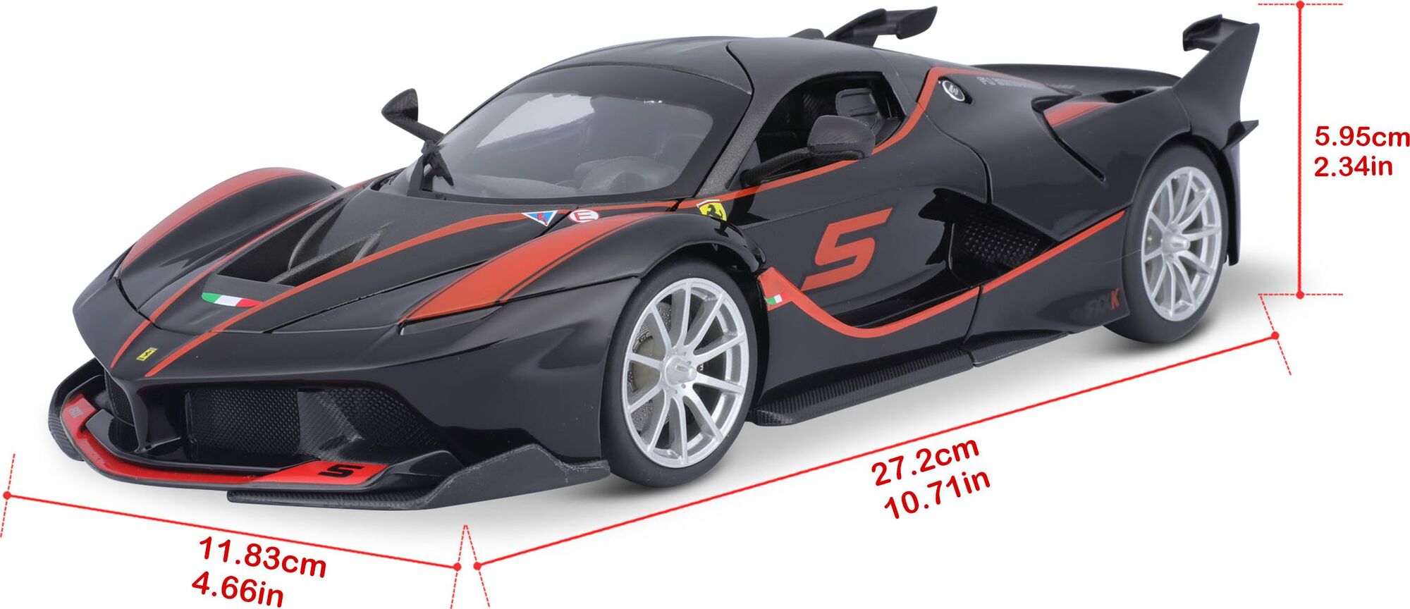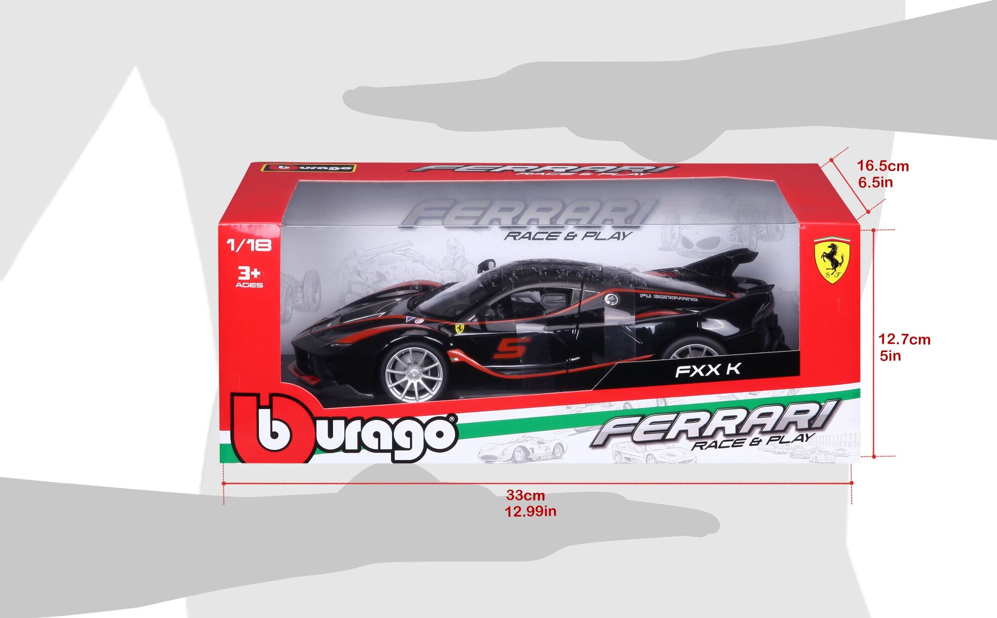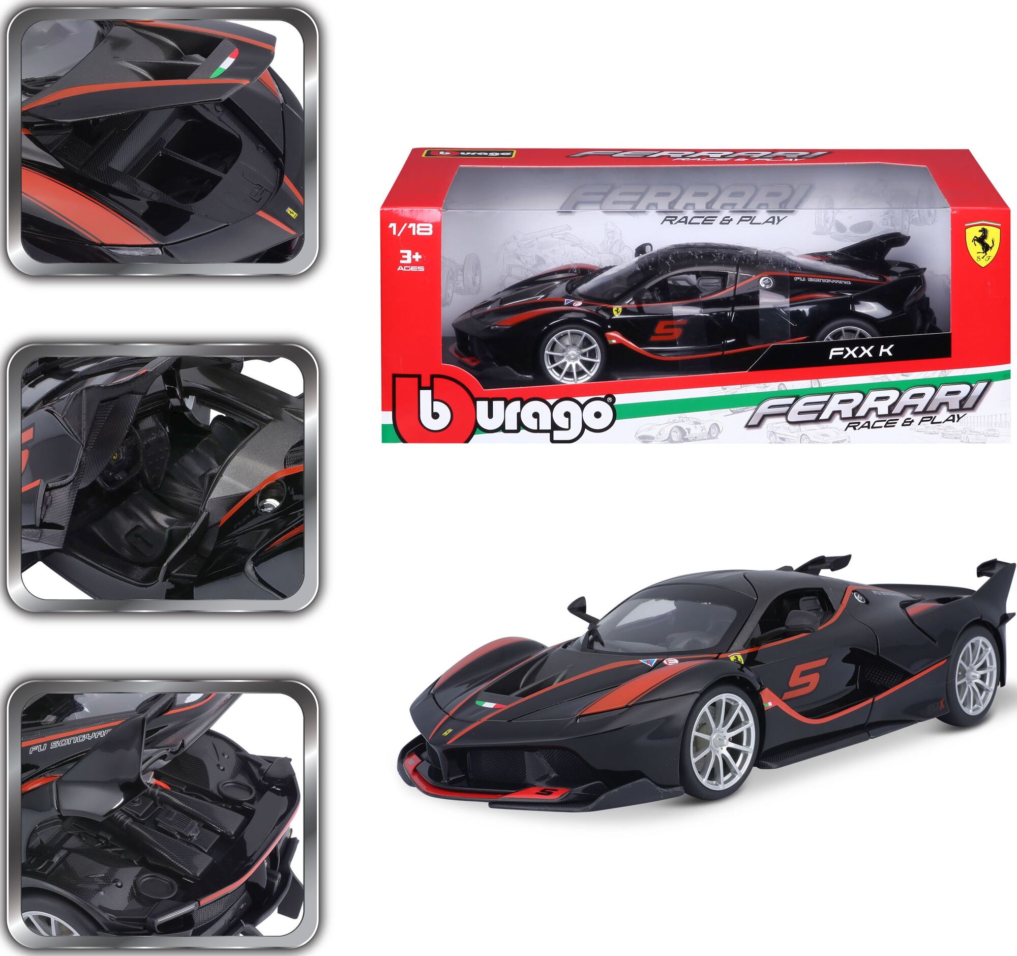 Autíčko Bburago 1:18 Ferrari TOP FXX K Black v reprezentatívnej kartónovej škatuli s plastovým priehľadom. Detailne spracované Ferrari má otváracie dvere, kufor aj kapotu motora. Realistický model Bburago poteší všetkých fanúšikov značky Ferrari aj motoršportu vôbec. Dĺžka autíčka je 27 cm. Rozmery balenia: 33 x 16,5 x 12,7 cm. Autíčka Bburago v mierke 1:18 potešia deti vo veku od 3 rokov, ale radosť urobia aj starším deťom a dospelým fanúšikom motoristického športu.