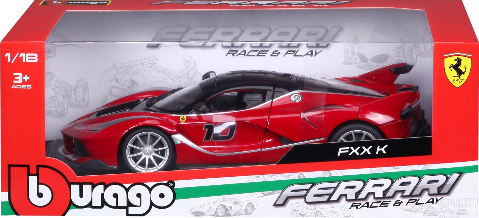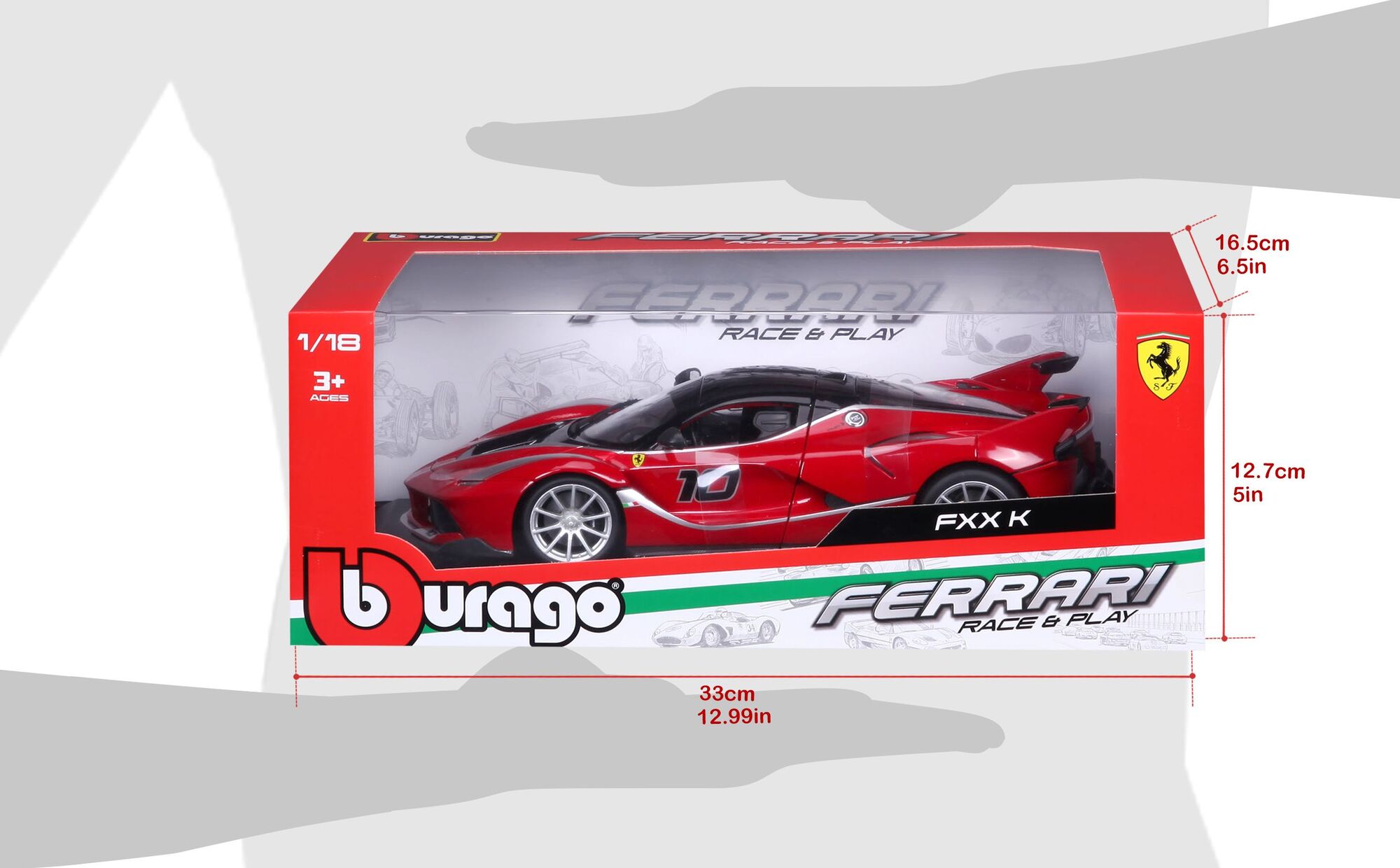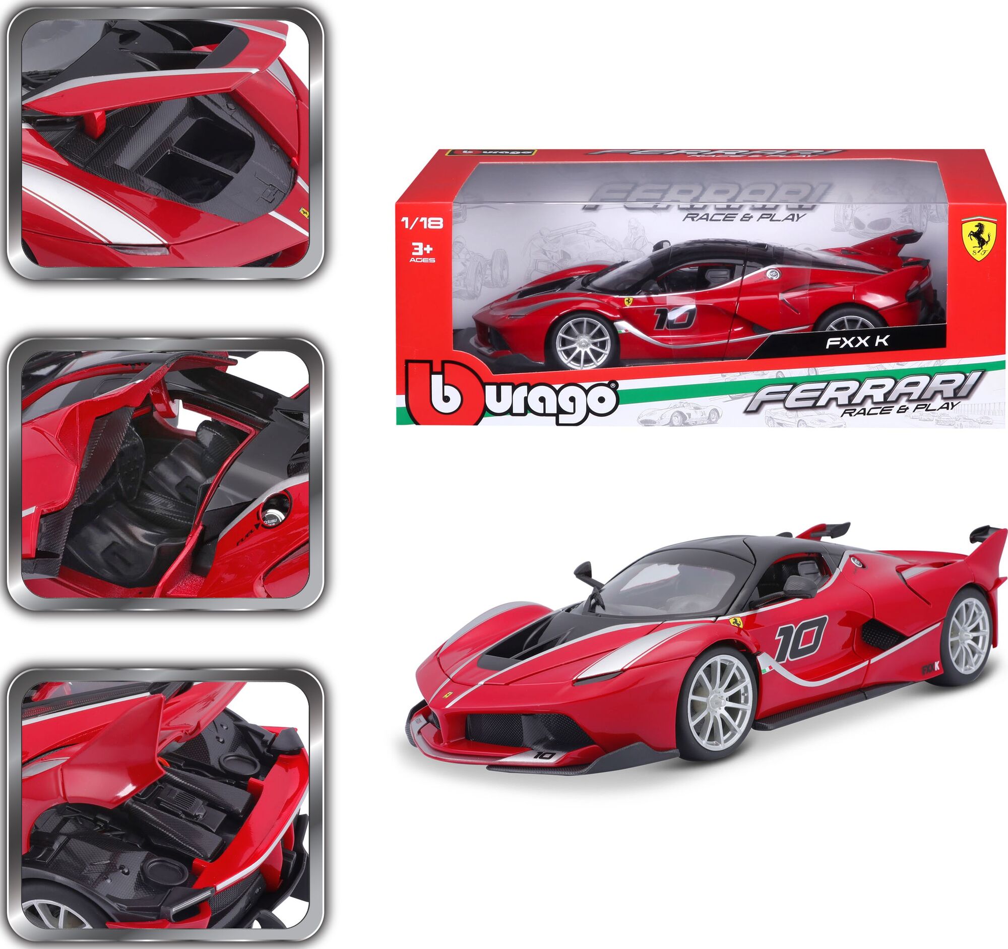 Bburago 1:18 Ferrari TOP FXX-K, výrobca Bburago. Špičkový model auta LaFerrari v mierke 1:18. Model má otváracie dvere a obe kapoty Volant je funkčný Zavesenie všetkých kolies Detailné vypracovanie interiéru Prvotriedna kvalita farbenia Detailné vypracovanie podvozku so samostaným výfukovým systémom Vysoká detailnosť kolies a emblémov Špeciálna zberateľská krabička Pre deti od 3 rokov