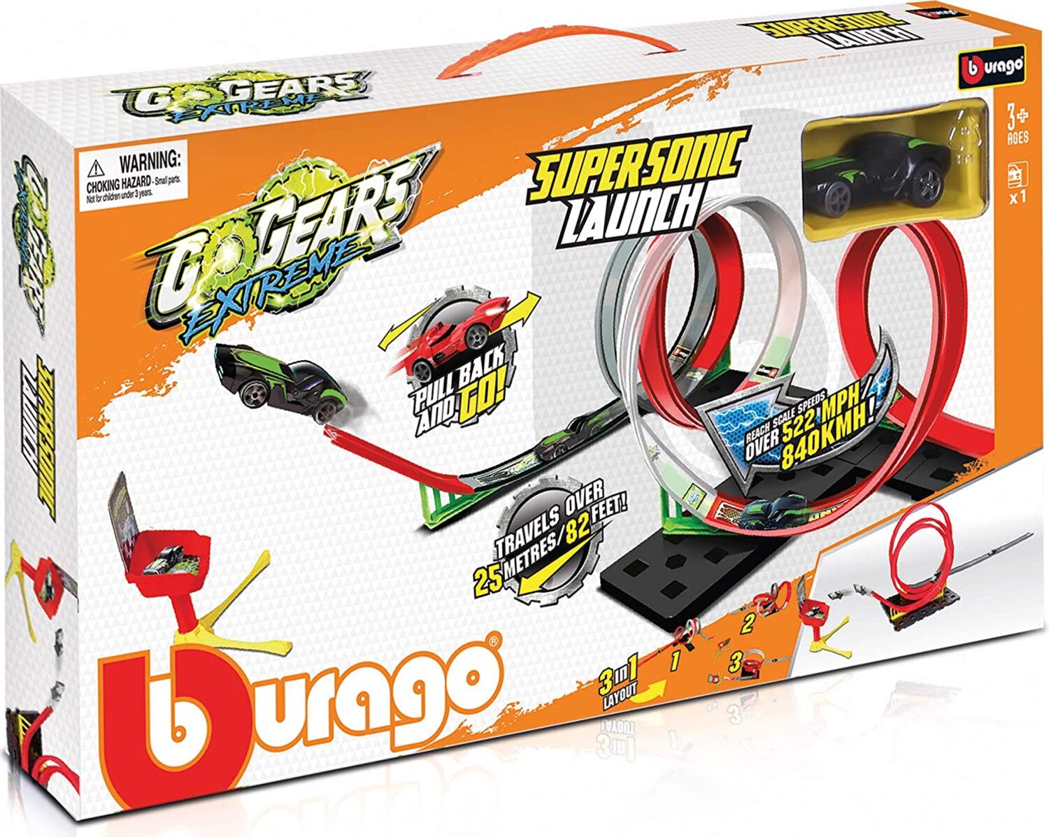 „Go Gears Extreme SuperSonic Launch“ od Bburago je nevyhnutnosťou pre mladých pretekárov. Hraciu súpravu 3 v 1 je možné zostaviť v troch rôznych variantoch. Množstvo loopingov, ako aj dĺžka trate zaručujú dlhotrvajúcu zábavu. Hracia súprava vrátane 1 vozidla je vhodná pre deti od 3 rokov.