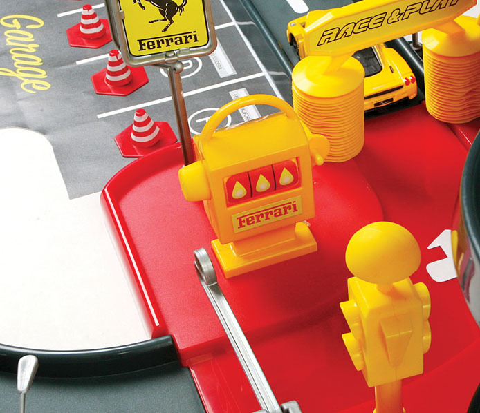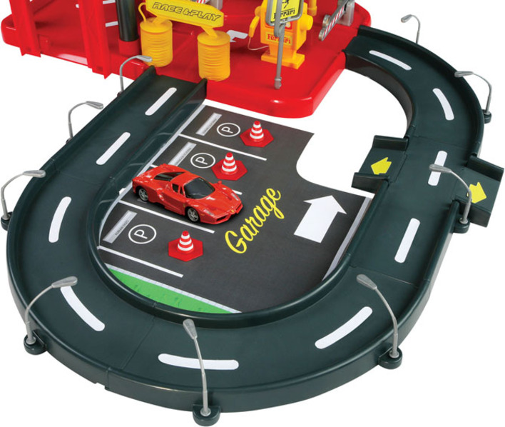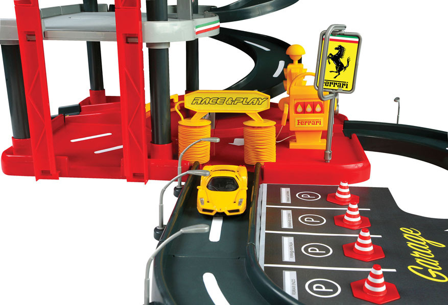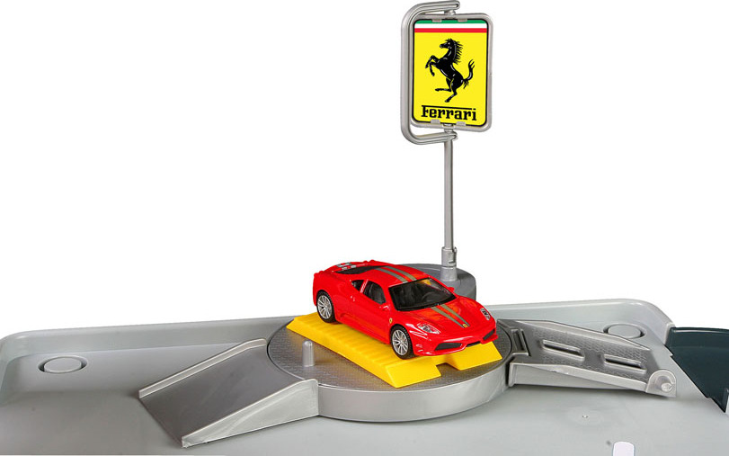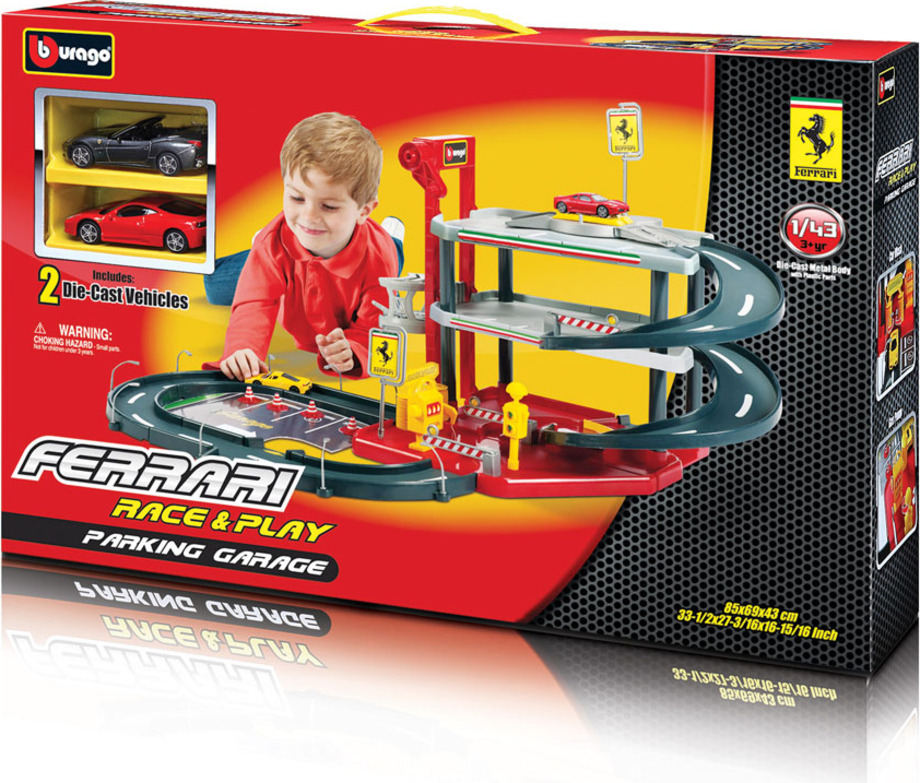 Bburago Ferrari Parking Garage s dvoma autíčkami 31204, výrobca BBurago. Trojposchodová garáž s príslušenstvom: funkčný výťahs množstvom príslušenstvas mechanicky pohyblivými časťami: zdvíhacia plošina, pohyblivá umyvárka, rampa...súčasťou sú dva kovové modely Ferrari 1:43 Pre deti od 3 rokov