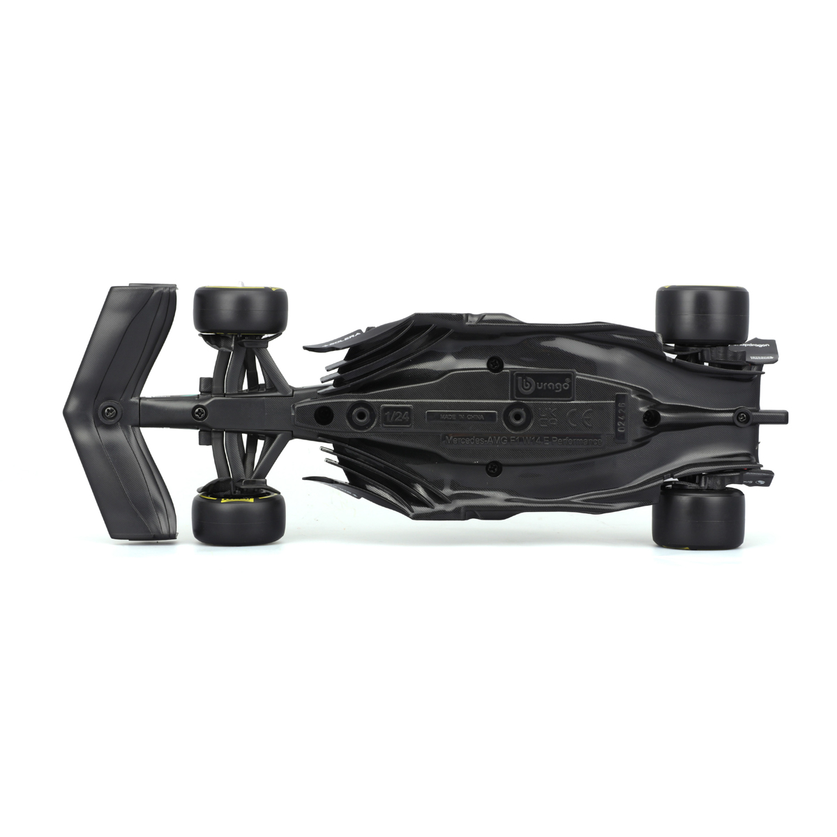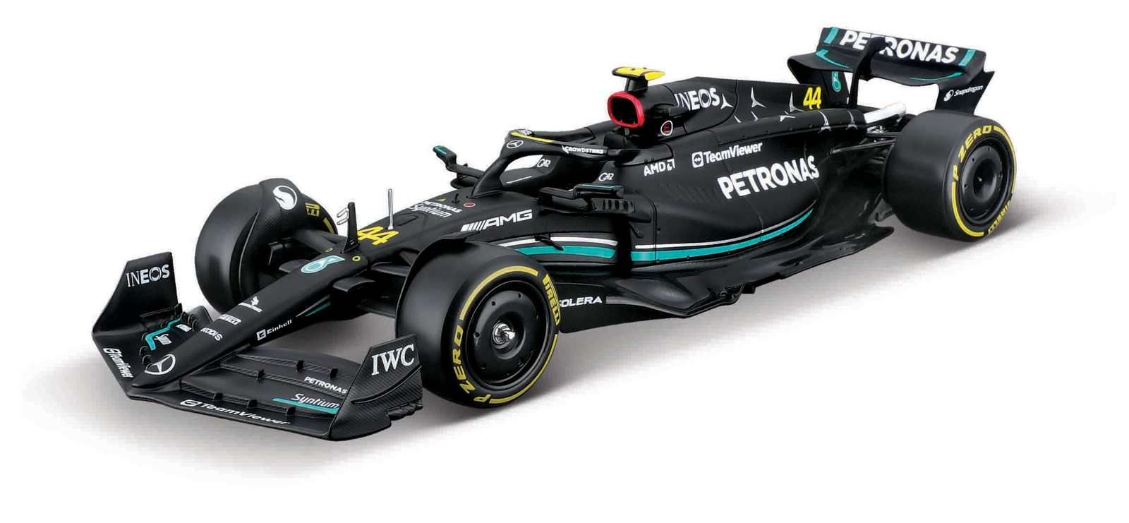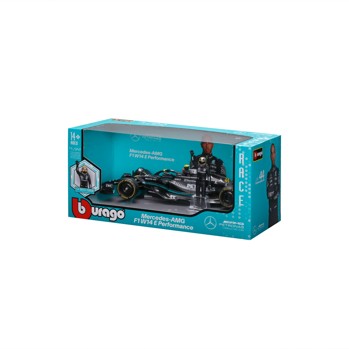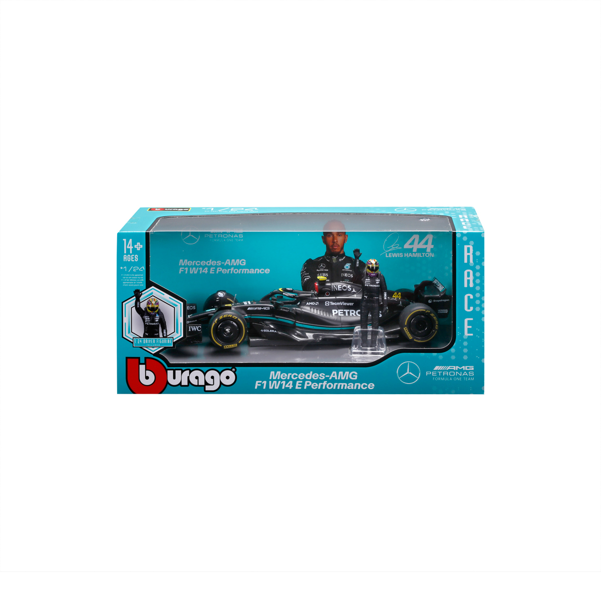 Bburago modely závodných vozidiel Formule 1 v mierke 1:24 z kolekcie RACE sú zbierkou krásneho designu s vysokým dôrazom na presnosť detailov. Súčasťou modelov je plastová figúrka jazdca F1 v majstrovskej póze. Modely F1 zo stajne Mercedes-AMG Petronas Team W14 E Performance (2023) sú vyrobené z liateho kovu s plastovými detailmi. Každý z modelov je v klasickom závodnom designe a so závodným číslom. Balené v krabičke. Nevhodné pre deti do 3 rokov. Rozmery balenia: 12,7 x 28 x 12,7 cm. Vek: 14+
