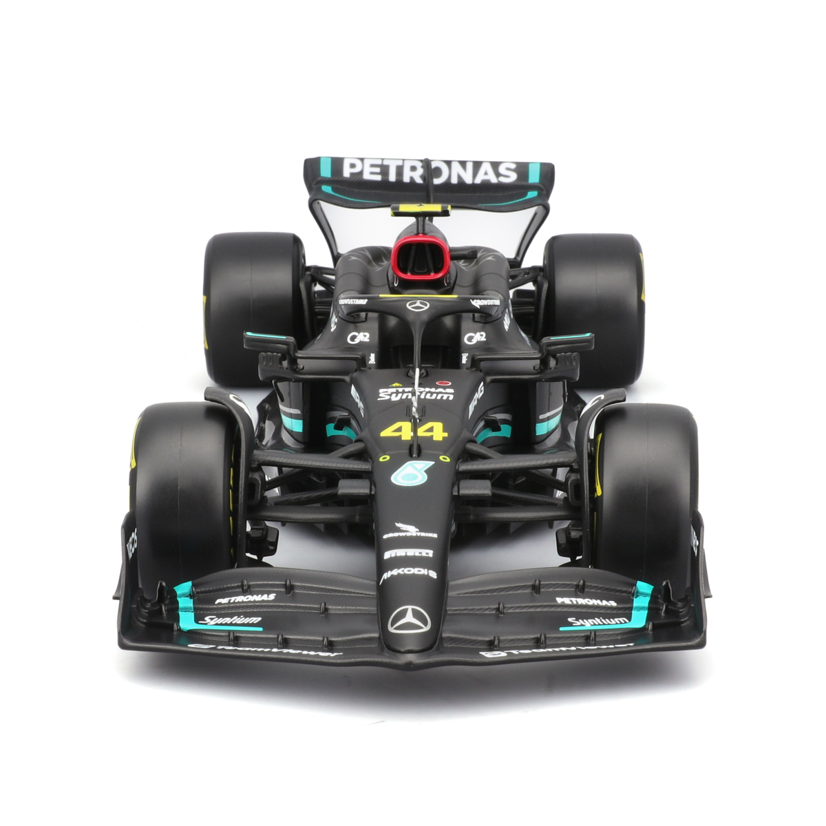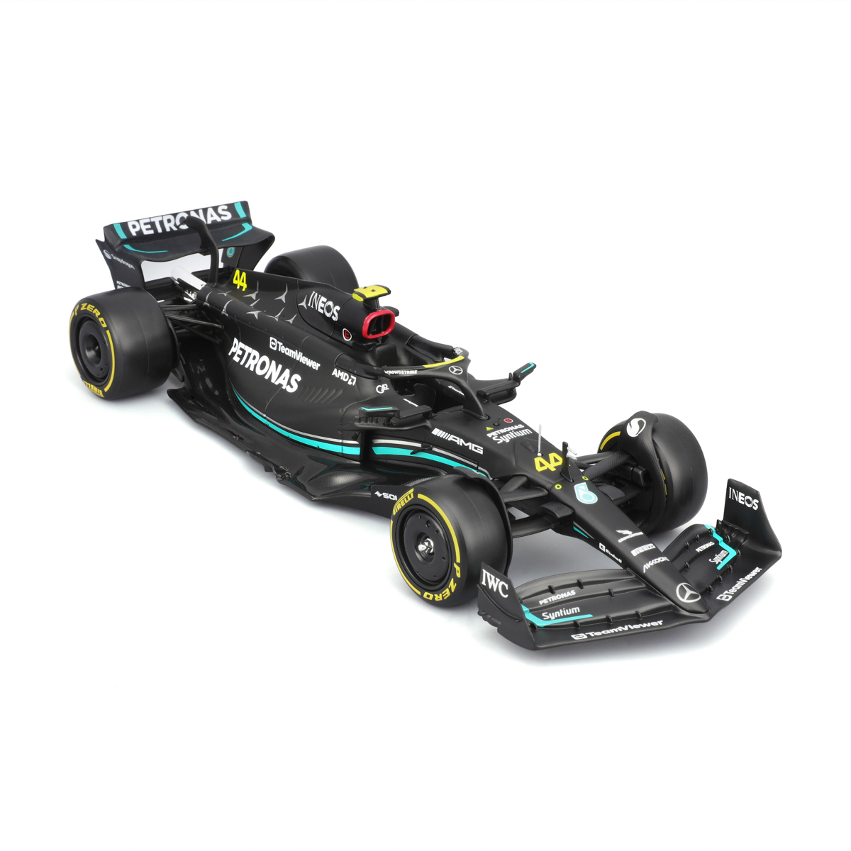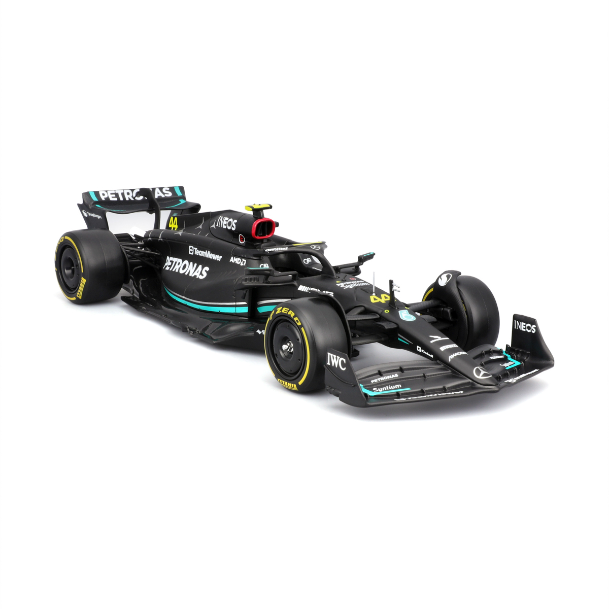 Bburago modely závodných vozidiel Formule 1 v mierke 1:24 z kolekcie RACE sú zbierkou krásneho designu s vysokým dôrazom na presnosť detailov. Súčasťou modelov je plastová figúrka jazdca F1 v majstrovskej póze. Modely F1 zo stajne Mercedes-AMG Petronas Team W14 E Performance (2023) sú vyrobené z liateho kovu s plastovými detailmi. Každý z modelov je v klasickom závodnom designe a so závodným číslom. Balené v krabičke. Nevhodné pre deti do 3 rokov. Rozmery balenia: 12,7 x 28 x 12,7 cm. Vek: 14+