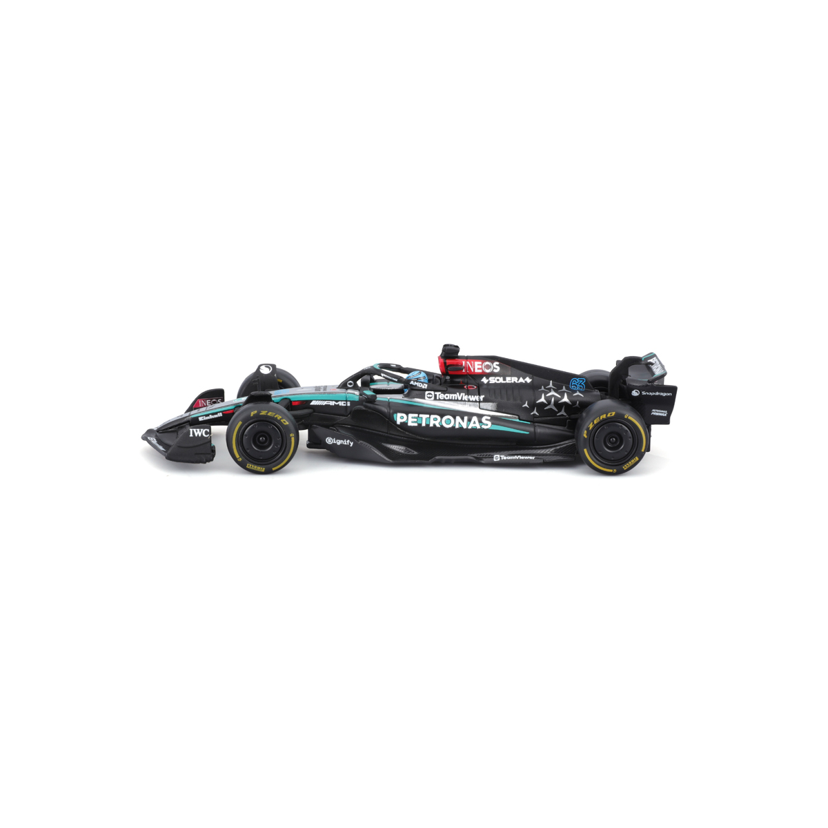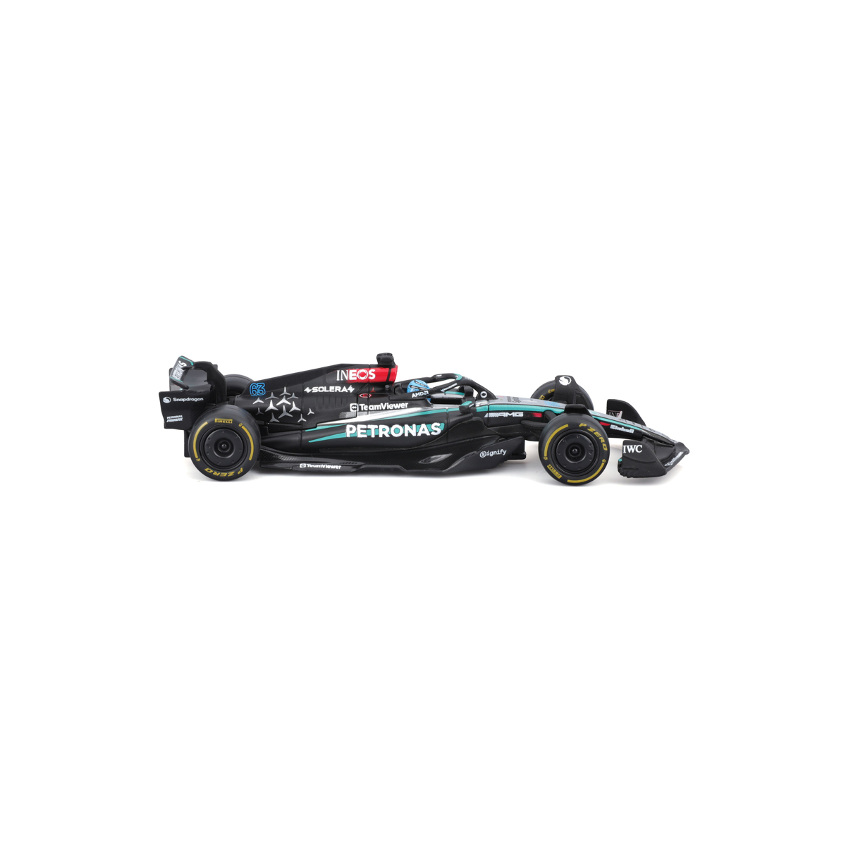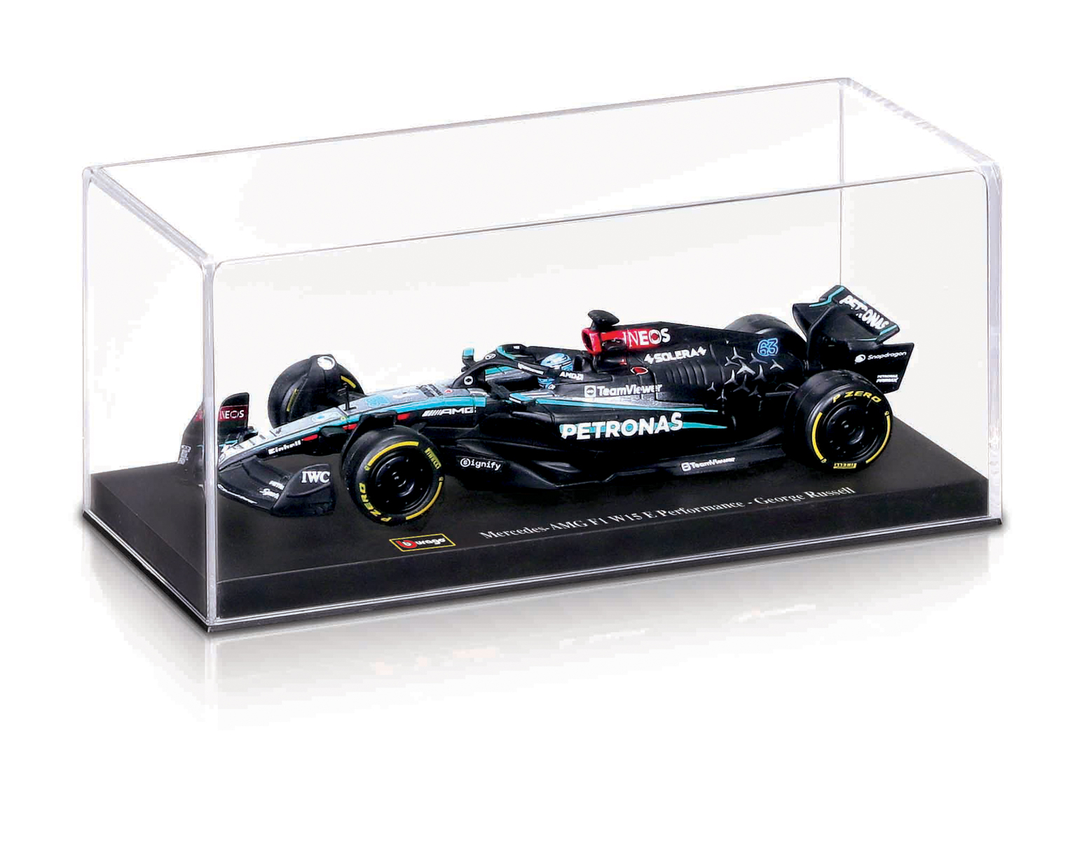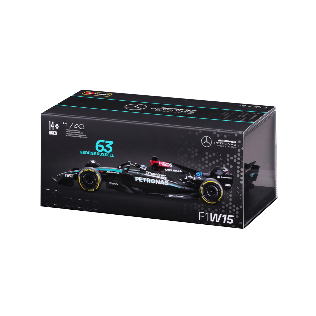 Bburago modely závodných vozidiel Formule 1 v mierke 1:43 z kolekcie RACE sú zbierkou krásneho dizajnu s vysokým dôrazom na presnosť detailov. Formula zo stajne Mercedes-AMG Petronas W15 (2024) s autentickými detailmi závodného vozidla a helmy jazdca. Modely sú vyrobené z liateho kovu s plastovými detailmi. Každý z modelov v klasickom závodnom dizajne je umiestnený v dekoratívnom akrylovom boxe. Vďaka dekoratívnemu boxu je tento model skvelým zberateľským kúskom a darčekom na každú príležitosť. Nevhodné pre deti do 3 rokov. Rozmery balenia: 6,7 x 14,7 x 7,5 cm. Vek: 14+