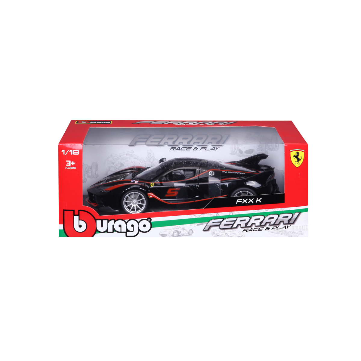 Modely automobilov Ferrari v mierke 1:18 z kolekcie RACE+PLAY sú zbierkou krásneho designu s vysokým dôrazom na presnosť detailov. Detailné prevedenie motorových priestorov, interiéru, kolies a odznakov. Modely sú vyrobené z liateho kovu s plastovými detailmi. Väčšina modelov z kolekcie má otváracie dvere, kufor alebo kapotu. Všetky modely v kolekcii majú plne funkčné riadenie a zavesenie všetkých kolies. Model je namontovaný na výstavnom stojane. Balené v krabičke. Nevhodné pre deti do 3 rokov. Rozmery balenia: 12,6 x 33,5 x 16,5 cm. Vek: 3+