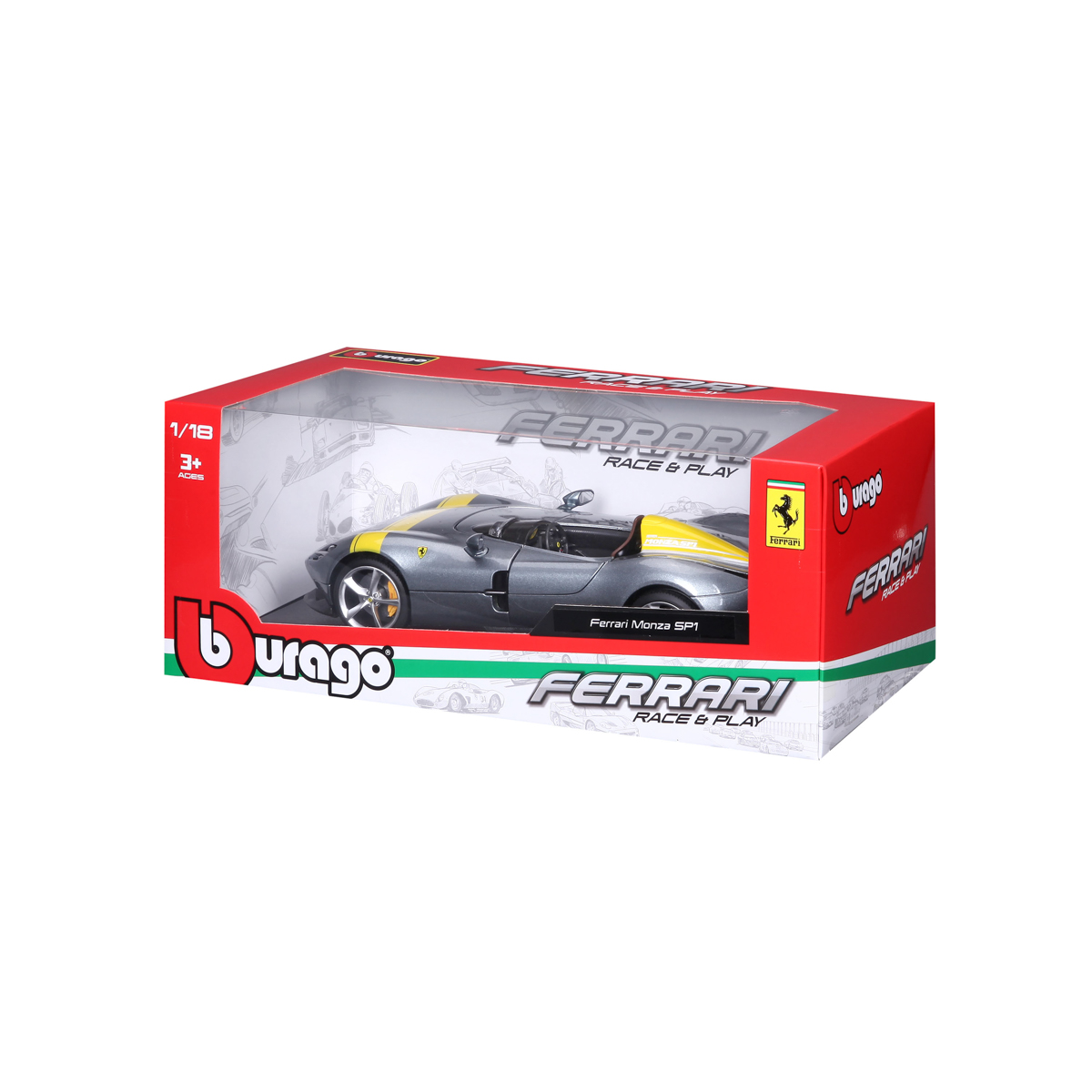 Modely automobilov Ferrari v mierke 1:18 z kolekcie RACE+PLAY sú zbierkou krásneho designu s vysokým dôrazom na presnosť detailov. Detailné prevedenie motorových priestorov, interiéru, kolies a odznakov. Modely sú vyrobené z liateho kovu s plastovými detailmi. Väčšina modelov z kolekcie má otváracie dvere, kufor alebo kapotu. Všetky modely v kolekcii majú plne funkčné riadenie a zavesenie všetkých kolies. Model je namontovaný na výstavnom stojane. Balené v krabičke. Nevhodné pre deti do 3 rokov. Rozmery balenia: 12,6 x 33,5 x 16,5 cm. Vek: 3+
