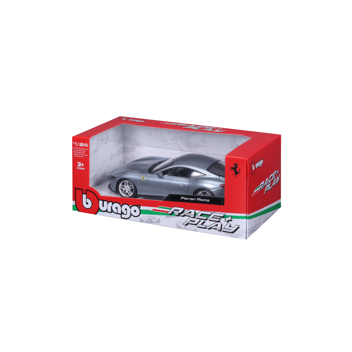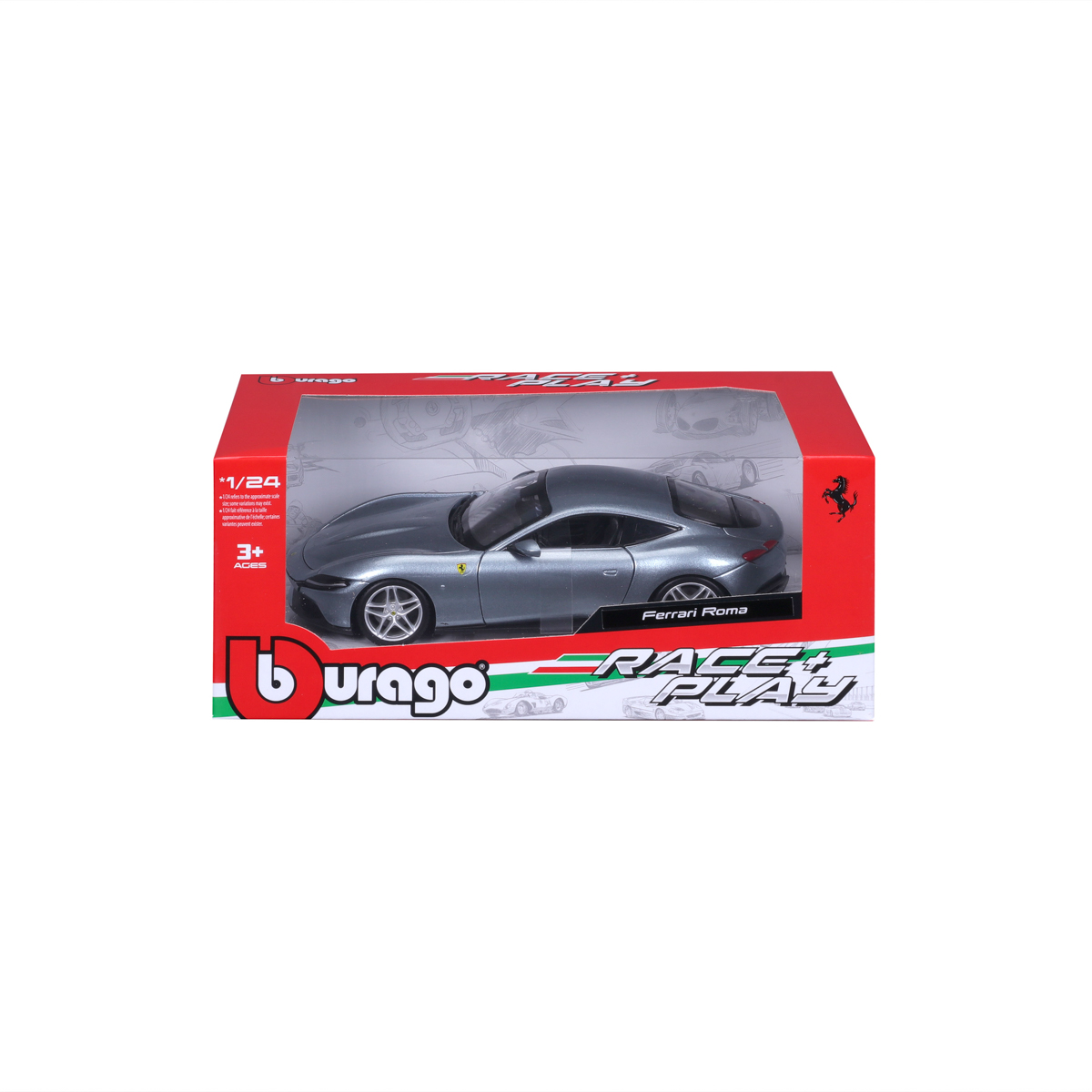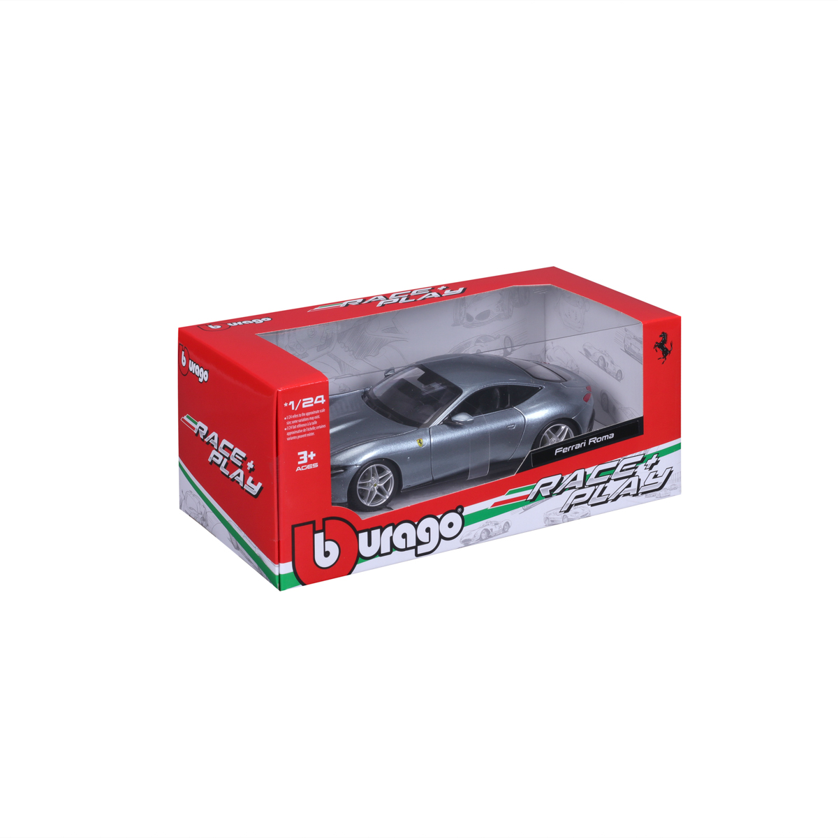 Modely automobilov Ferrari v mierke 1:24 z kolekcie RACE+PLAY sú zbierkou krásneho designu s vysokým dôrazom na presnosť detailov. Modely sú vyrobené z liateho kovu s plastovými detailmi. Väčšina modelov z kolekcie má otváracie dvere, kufor alebo kapotu. Niektoré z modelov majú pohyblivý volant. Balené v krabičke. Nevhodné pre deti do 3 rokov. Rozmery balenia: 10,3 x 25 x 12,6 cm. Vek: 3+