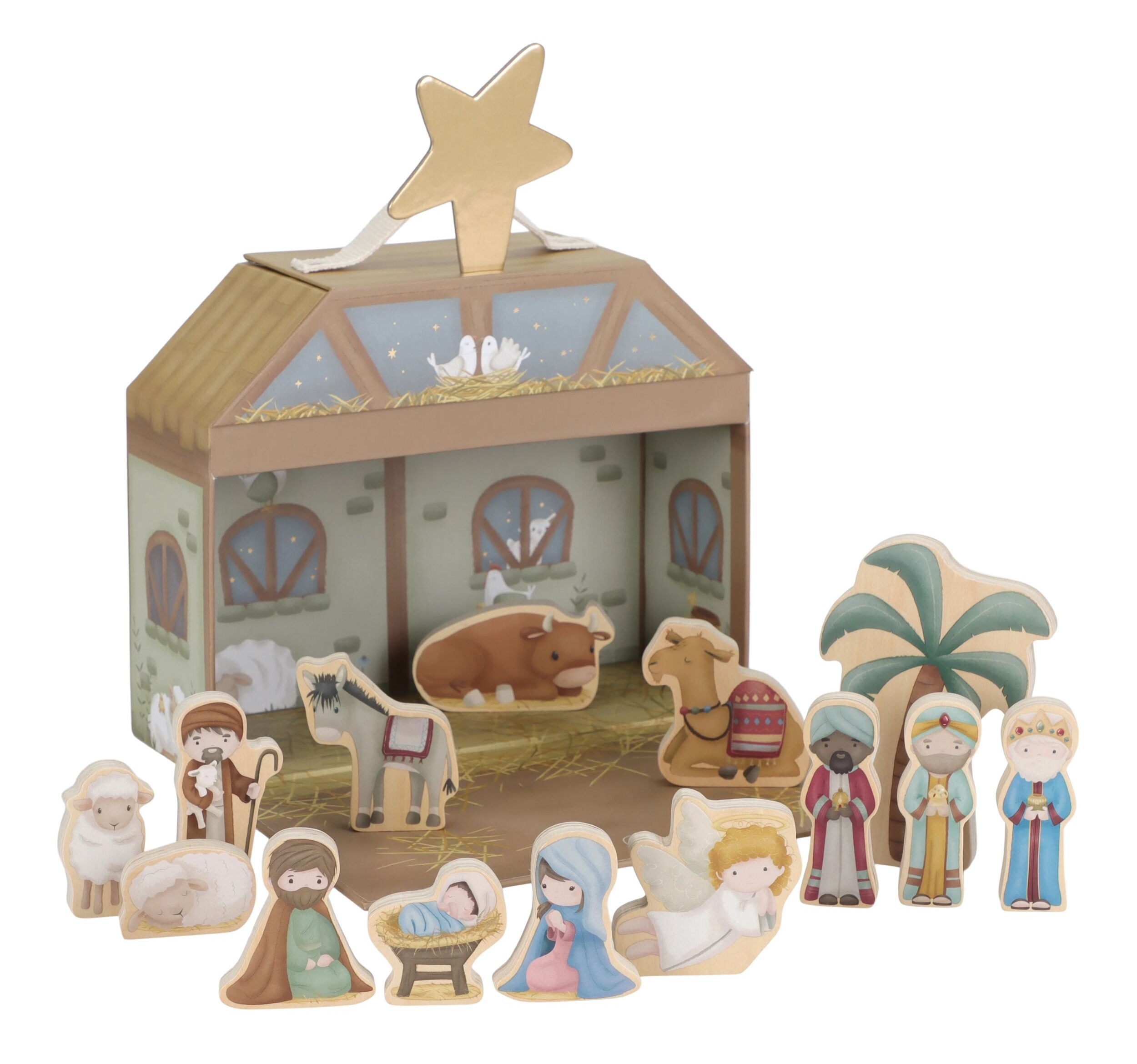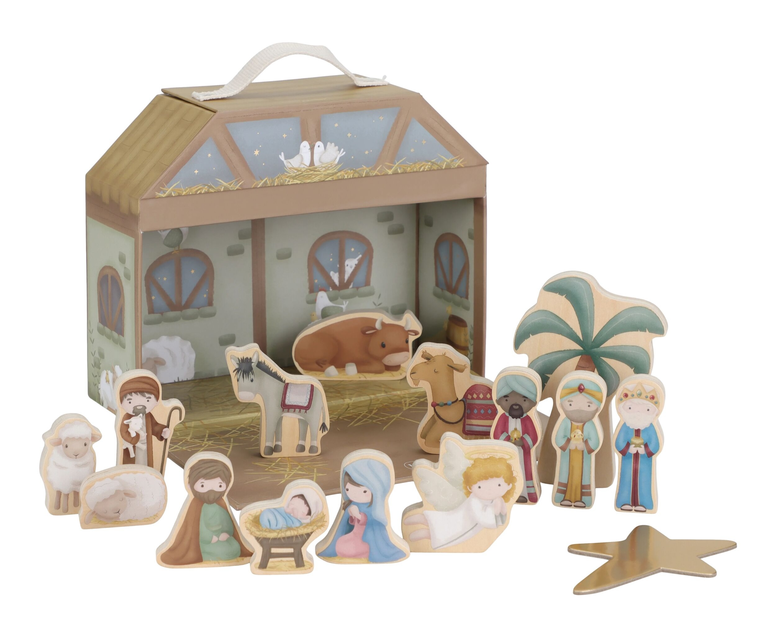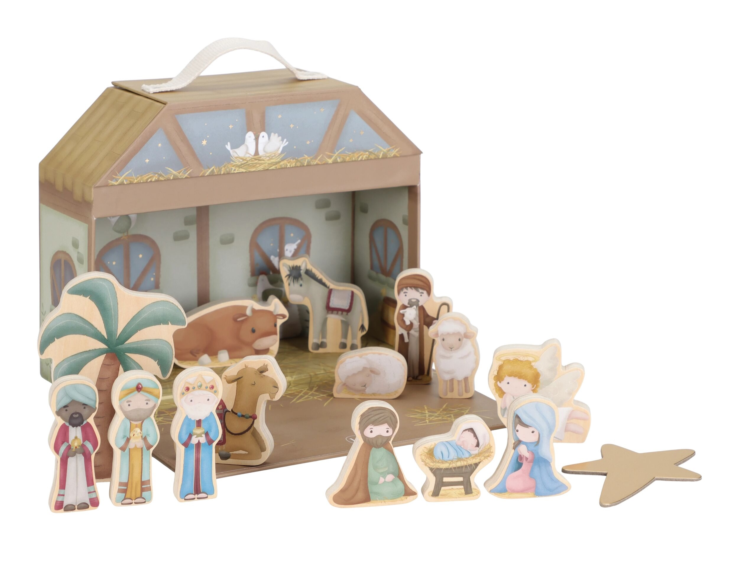 Krásny betlehem s postavami z tradičného vianočného príbehu poteší vás aj vaše deti každé Vianoce. 14 postavičiek je vyrobených z dreva, chliev z kvalitného pevného kartónu slúži aj ako prenosný a úložný kufrík.