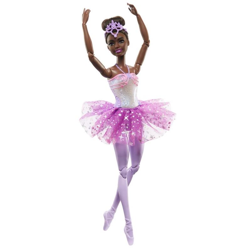 Táto Barbie® Svietiaca magická baletka s fialovou trblietavou sukienkou a čelenkou je vybavená kúzelnou svietiacou funkciou a kĺbovým telom pre inšpiratívne rozprávanie príbehov a tanečné hry. Bábika nevie samostatne stáť. Farby a vzhľad výrobku sa môžu líšiť.