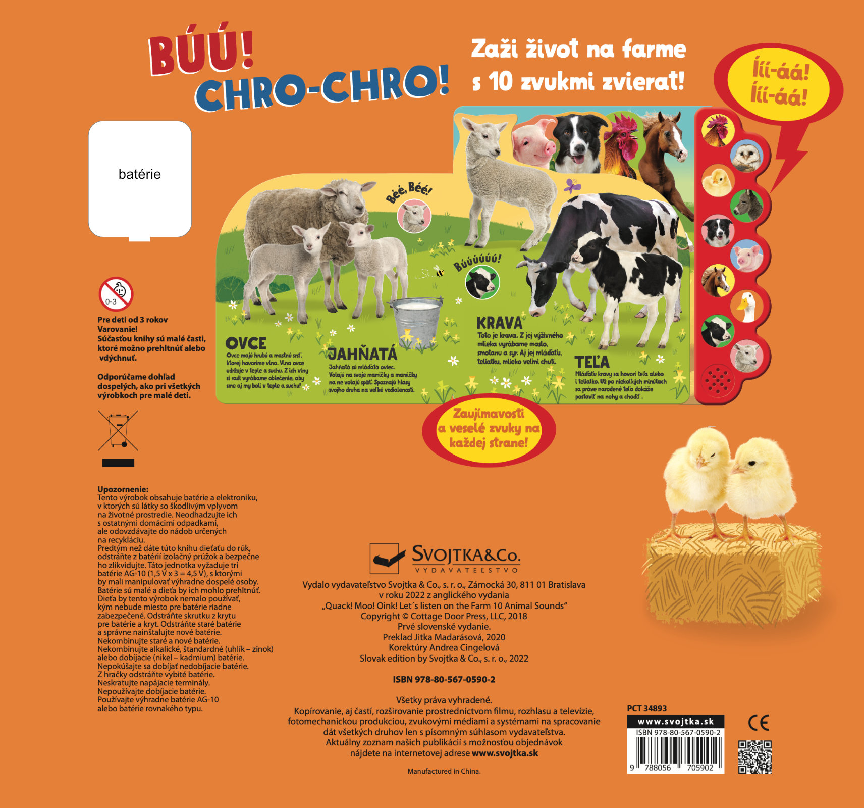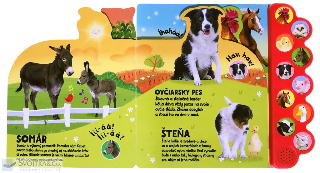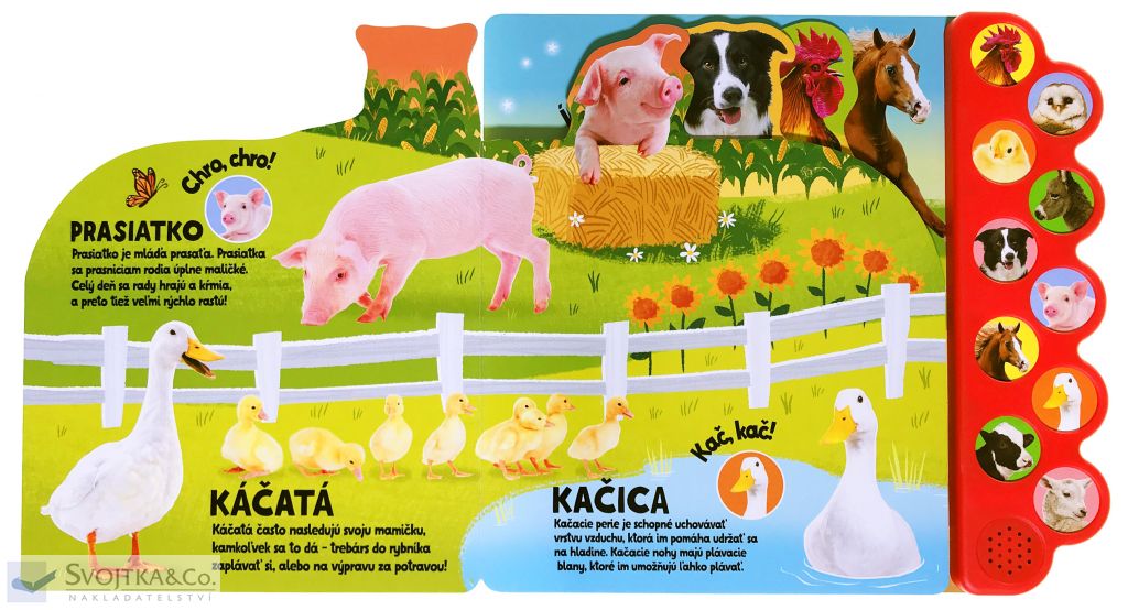 Zvuková knižka ponúka deťom možnosť spoznať zvieratá z farmy pomocou zvukov. Po stlačení tlačidla si dieťa vypočuje, aké rôzne zvuky zvieratá vydávajú, a zvuk si spojí s konkrétnym zvieraťom. Vďaka tomu si zviera lepšie zapamätá a ľahko rozozná medzi ostatnými. Kniha sa tak stáva skvelou pomôckou na rozširovanie základnej slovnej zásoby a spoznávanie sveta okolo seba. Vieš, ako robí kohút? A rozpoznáš podľa zvuku koňa od somára? Alebo kravu od prasaťa? Stačí stlačiť príslušný obrázok na okraji a farma doslova ožije pod tvojimi rukami. Kniha obsahuje tri výmenné batérie.
