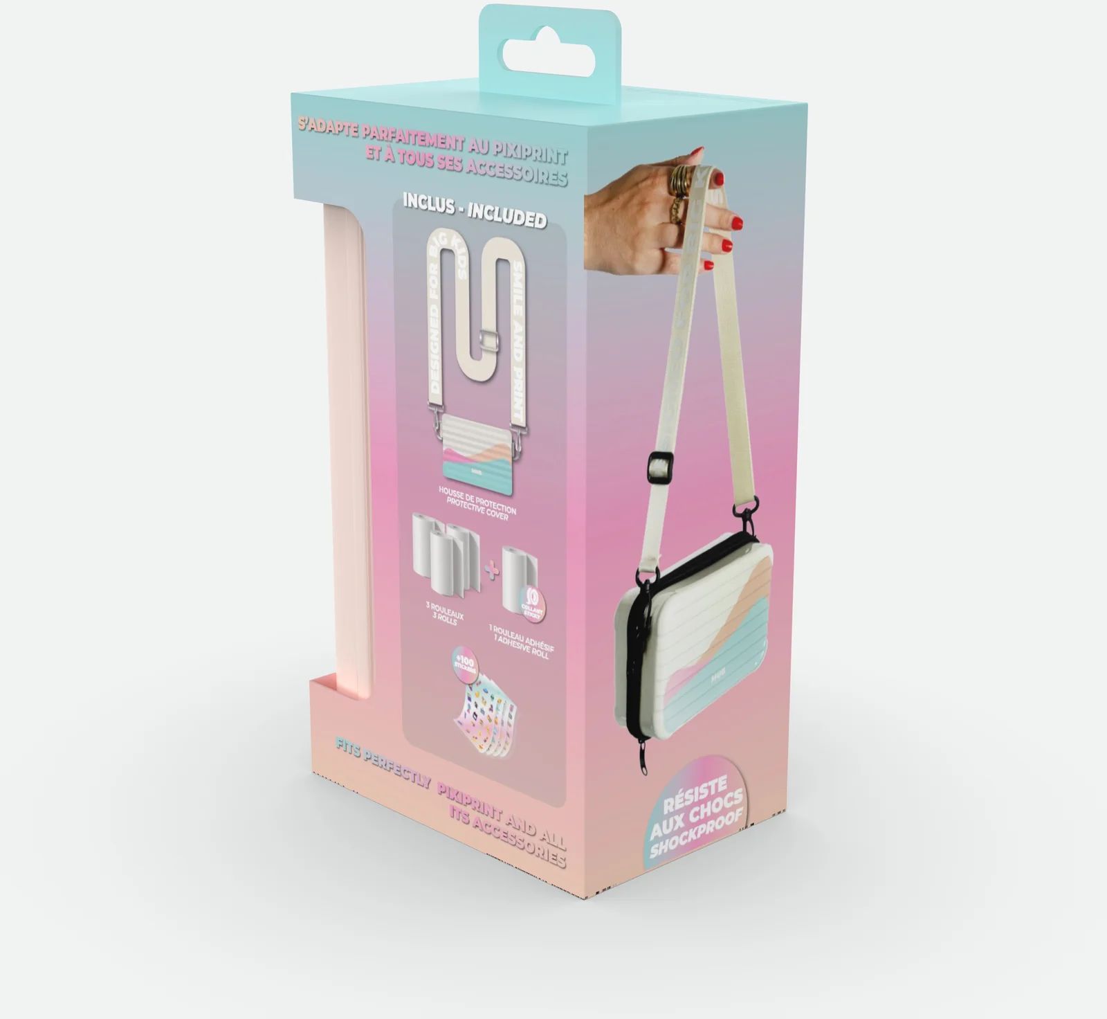Do puzdra sa zmestí foťák Pixiprint MOB, 6 roliek papiera a fixky, ktoré nie sú súčasťou tohto balenia. Puzdro sa dá zavesiť aj ako kabelka.