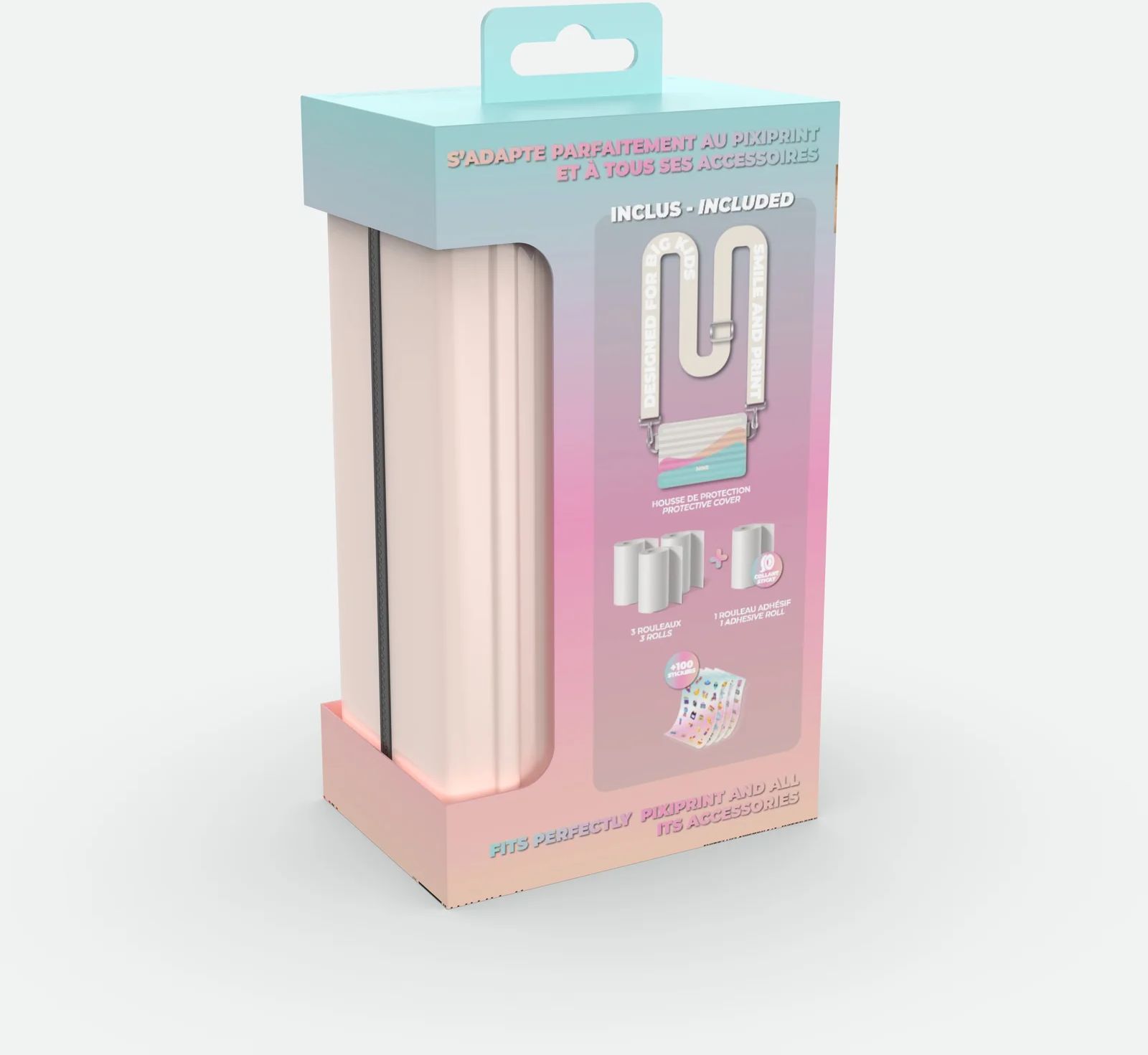 Cestovná doplnková sada k fotoaparátu Pixiprint MOB v menšej veľkosti so štyrmi ruličkami papiera, cestovným puzdrom a samolepkami na zdobenie.