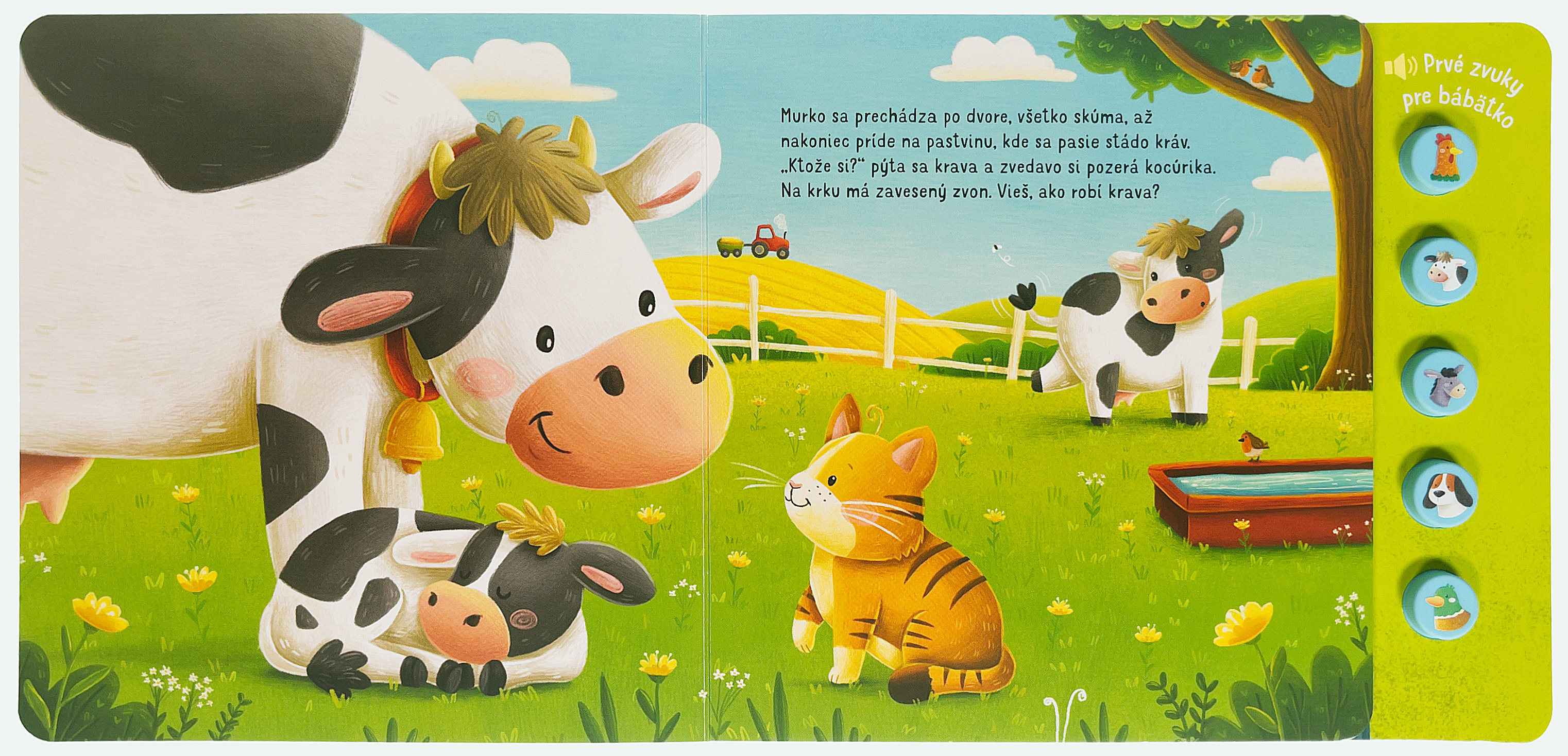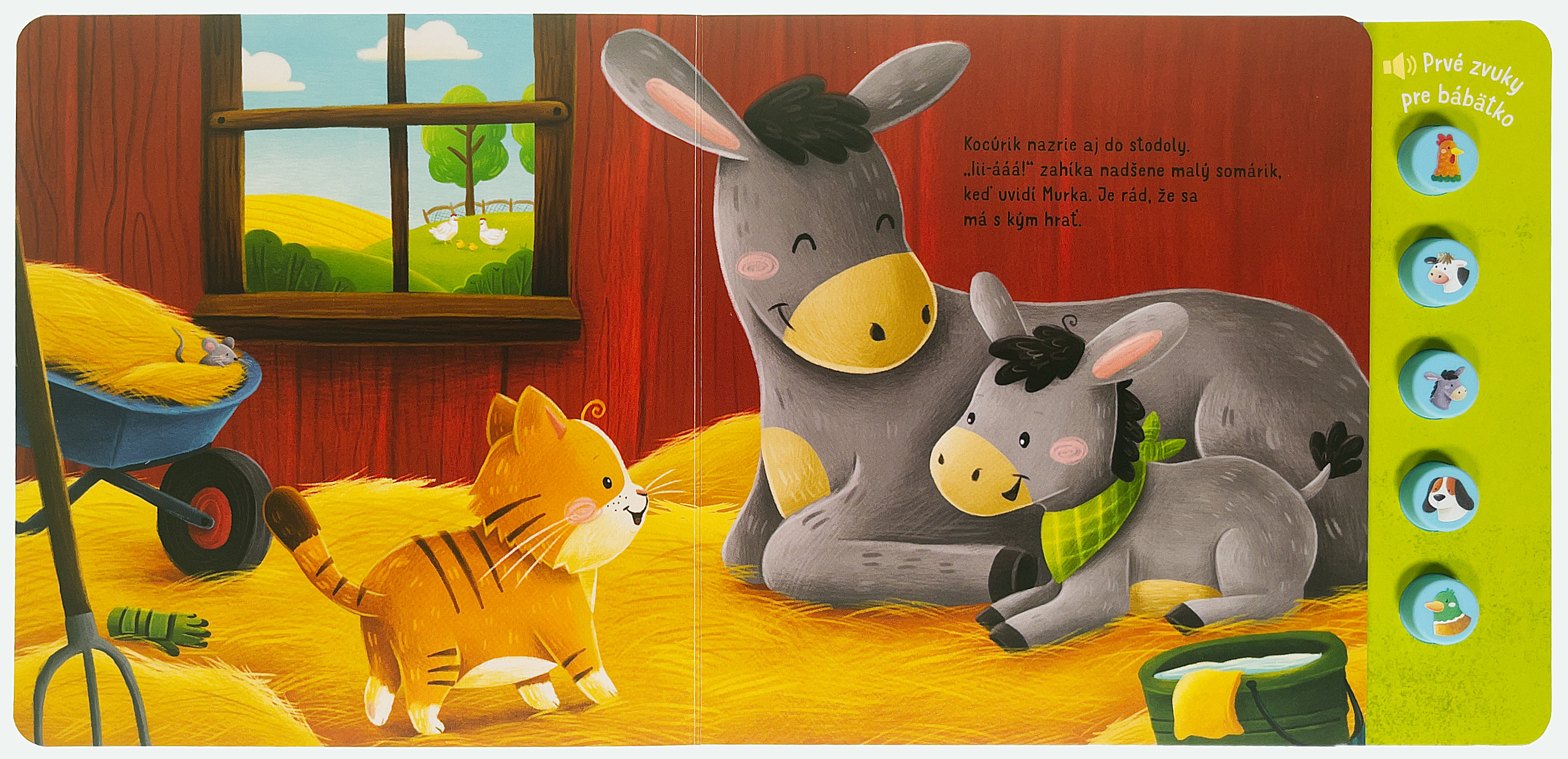 Vydaj sa spolu s ryšavým kocúrikom na prieskumnú prechádzku po statku a zoznám sa s rôznymi zvieratami, ktoré tam žijú. Vypočuj si kikiríkanie kohúta vítajúceho nový deň, veselé bučanie kravy a híkanie oslíka. Zvieratká zo statku sa na teba tešia! Vďaka vystúpeným gumovým tlačidlám a roztomilým ilustráciám s jednoduchým príbehom je kniha vhodná aj pre najmenšie deti.Počet strán: 12