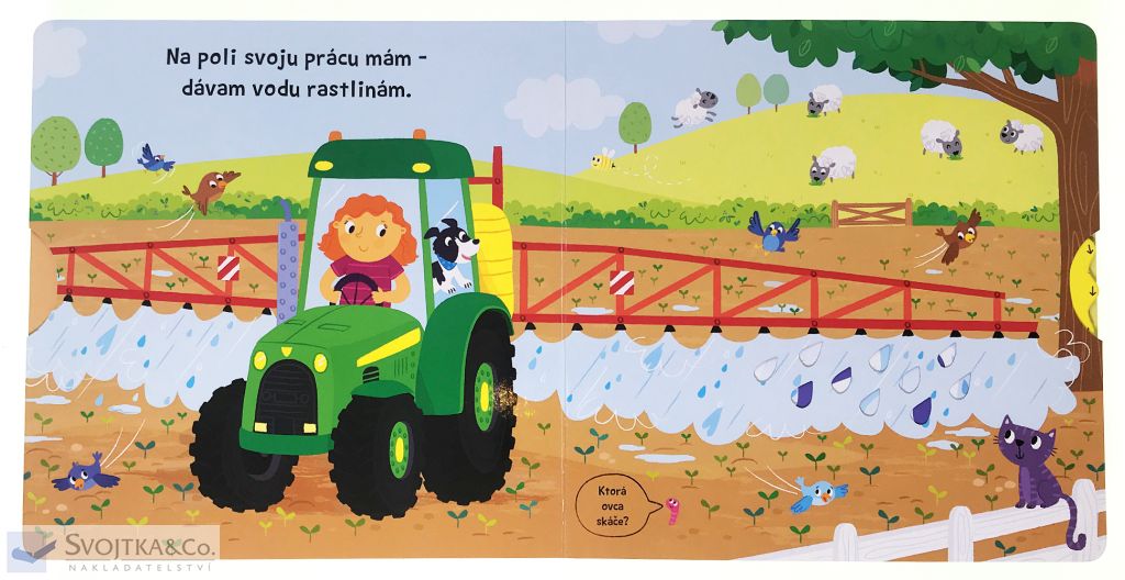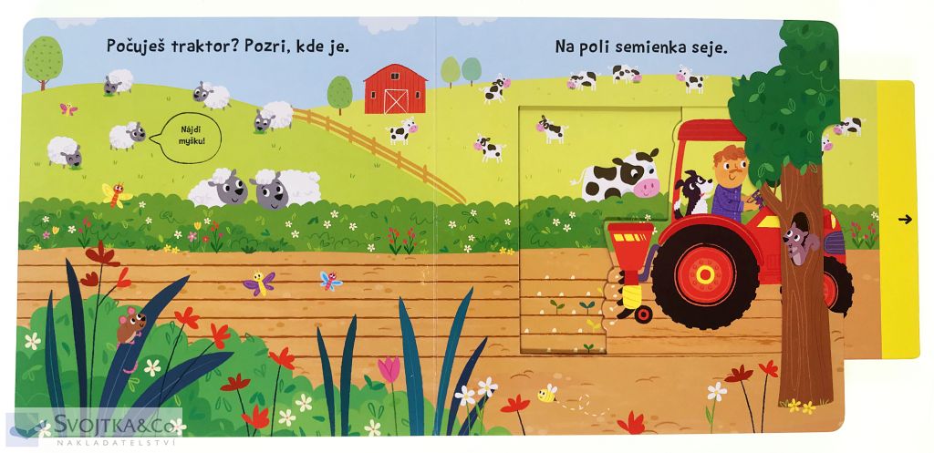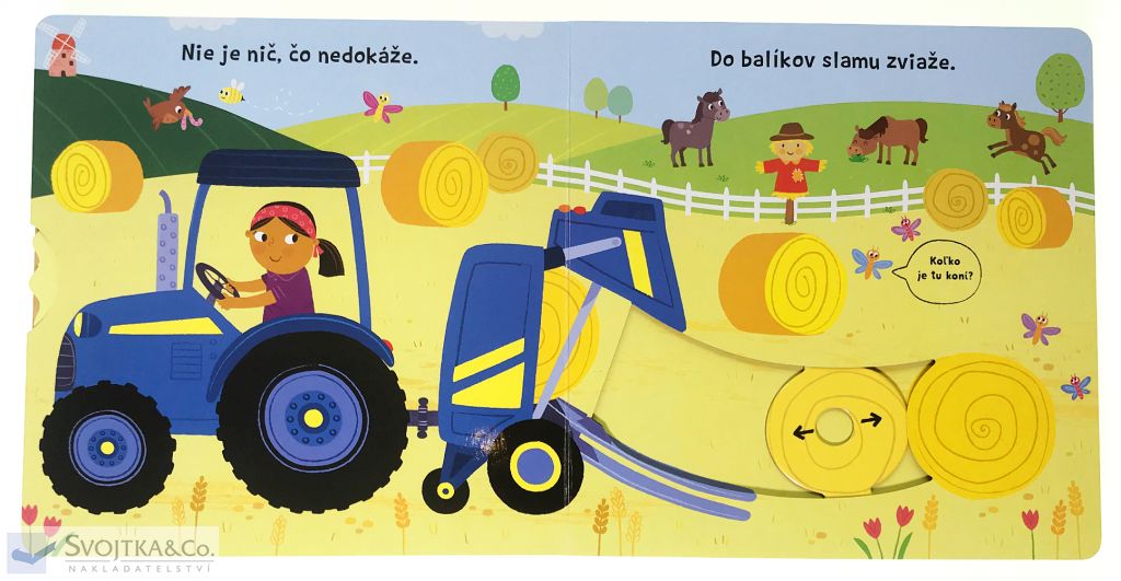 Traktor je náš superhrdina - vie toľko všelijakých vecí! Ale kde je? Tamto! Už ho vidíš? Na poli seje semienka. A keď z nich vyrastú rastliny, zalieva ich. Vie aj viazať slamu a zeleninu dovezie až na trh. Nie je nič, čo by traktor nezvládol! Toto veršované leporelo je určené deťom od jedného roka. Má pevné stránky s posuvnými a otočnými prvkami, a tak si dieťa pri prezeraní knižky súčasne precvičí jemnú motoriku – môže na jednotlivých stránkach posúvať, ťahať, otáčať. Objaví nové veci a môžete sa o nich spoločne rozprávať. Tak rýchlo, na poli je síce práca, ale aj veľa zábavy - poď sa na všetko pozrieť!