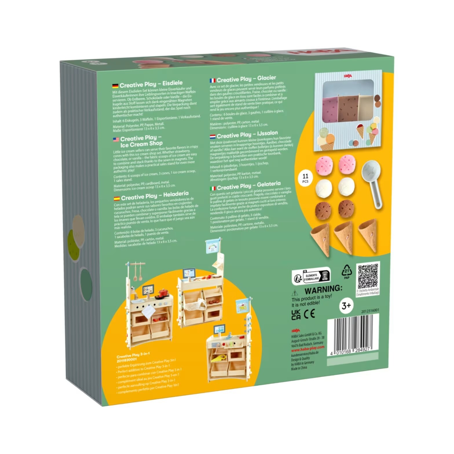 Sada Zmrzlináreň prináša deťom možnosť otvoriť si vlastnú malú zmrzlináreň plnú farieb a chutí. Malí zmrzlinári a zmrzlinárky môžu servírovať svoje obľúbené druhy v chrumkavých kornútikoch, čo robí z každej hry chutné a pestré dobrodružstvo. Sada obsahuje látkové kopčeky zmrzliny s príchuťami ako jahoda, čokoláda či vanilka, ktoré sa dajú vďaka všitým magnetom na seba detsky ľahko ukladať a kombinovať. Mimoriadne praktickým a autentickým prvkom je samotný obal, ktorý zároveň slúži ako predajný stánok. Táto hračka efektívne podporuje kreativitu, rozvoj jemnej motoriky pri manipulácii s kopčekmi a stimuluje slovnú zásobu počas komunikácie so "zákazníkmi". Ide o perfektný doplnok k hernej sade Creative Play 3 v 1. Vek: 3