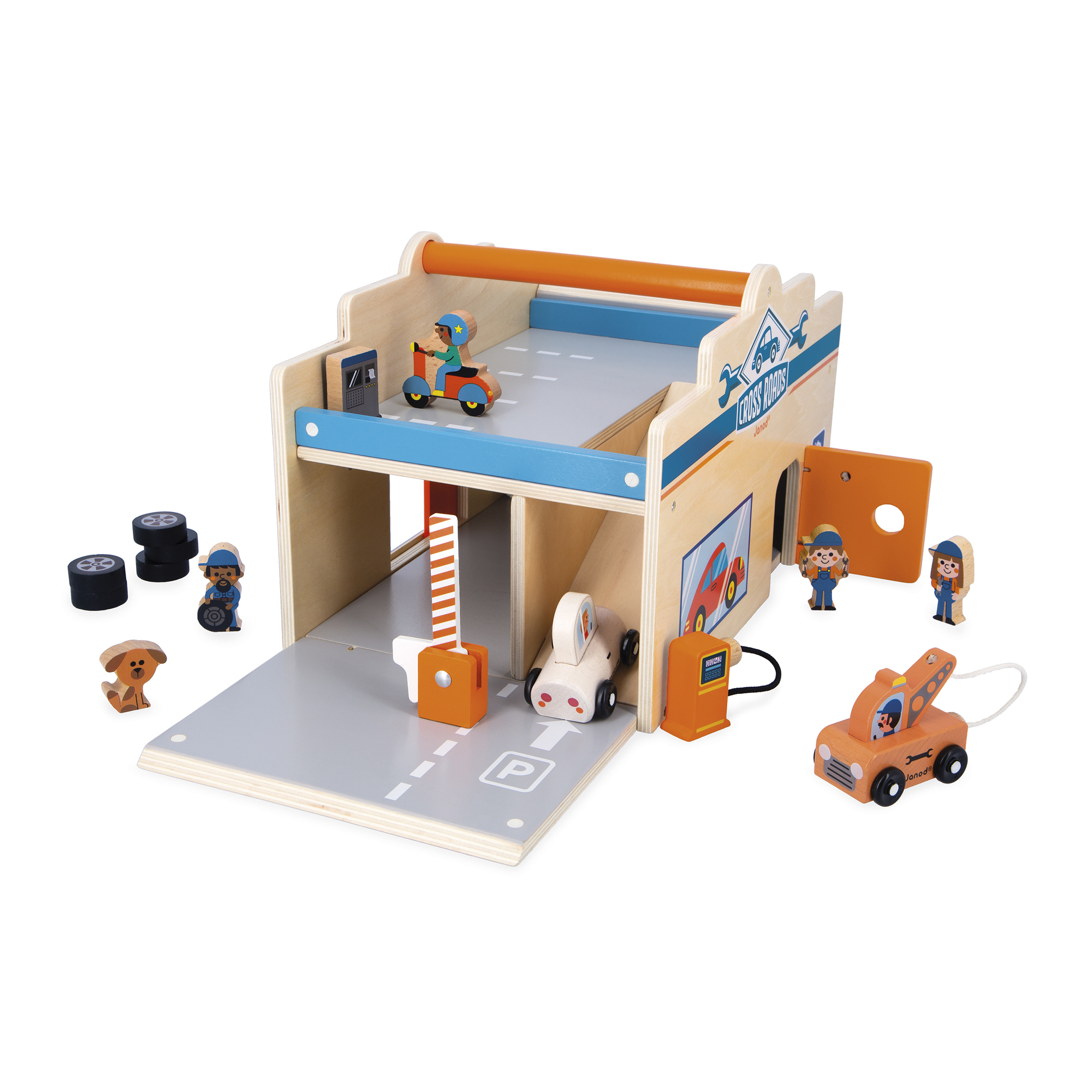 Máte defekt? Alebo vám došiel benzín? Ste na správnom mieste! V tejto veľkej garáži dokážu mechanici všetko opraviť a zároveň vám poriadne vyčistiť auto vďaka umývačke áut priamo v garáži! Táto úžasná drevená garáž obsahuje 15 doplnkov: 1 odťahovku, 1 auto, 5 pneumatík, 3 mechanikov, 1 osobu na kolobežke, 1 psa, 1 benzínovú pumpu, 1 parkovací automat a 1 odnímateľnú zábranu, ktorá umožňuje alebo blokuje prístup na horné parkovisko. Okrem všetkého tohto príslušenstva sa produkt môže pochváliť aj mnohými funkciami: mäkké kefy pre umývanie auta bez škrabancov, posuvné dvere, výklopné dvere s elastickými detailmi a rampa na prístup na parkovisko. A to nie je všetko... Magnetická odťahovka dokáže odtiahnuť pokazené vozidlo, rovnako ako skutočné! Pre ešte viac možností hry sa garáž otvára a zatvára na oboch stranách pomocou magnetického systému. Praktické: garáž má na vrchu rukoväť pre jednoduchú prepravu a všetky diely sa dajú bezpečne uložiť dovnútra. Táto drevená garáž je ideálna na podnecovanie detskej fantázie a vymýšľanie množstva príbehov. Hračka vyrobená z dreva FSCTM. Hračka na hranie pre deti od 2 rokov.