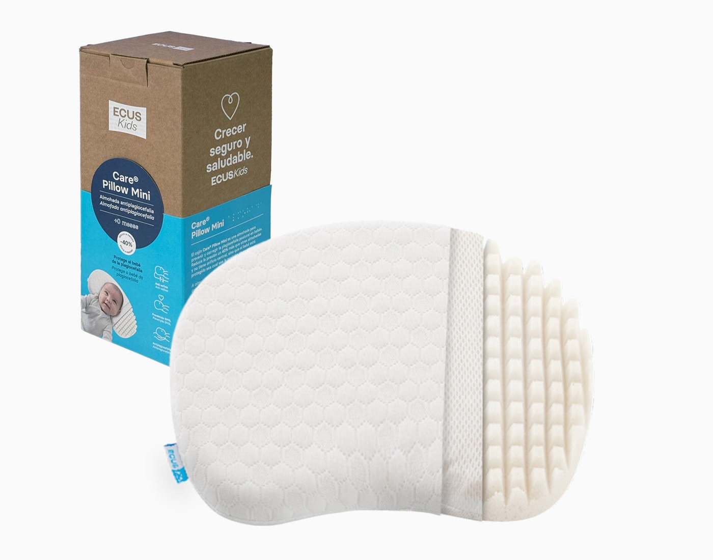 Dětský mini polštář Ecus Kids Care pomáhá předcházet zploštění hlavičky (plagiocefalii) u kojenců. Snižuje tlak o 40 % více než jiné polštáře a nemá středový otvor, takže chrání dítě bez ohledu na polohu jeho hlavy.