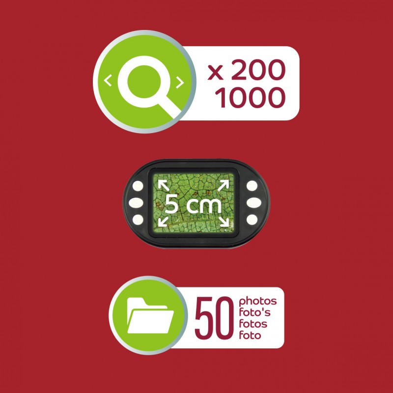 Vďaka nastaviteľnému zväčšeniu od 200× do 1000×, LED osvetleniu a presnému zaostrovaciemu systému získate vždy ostrý a jasný obraz. Pozorovanie je jednoduché vďaka zabudovanej 5 cm obrazovke, na ktorej môžete sledovať všetko priamo počas skúmania.