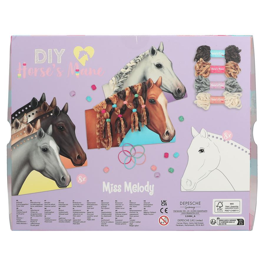 S touto DIY sadou od Miss Melody si zapletiete krásne hrivy. Sada obsahuje 8 kartónových konských hláv s dierkami, 4 bavlnky a farebné gumičky a sponky. Nádherný darček pre tvorivé slečny. Rozmery: 25x 20,5 x 4cm