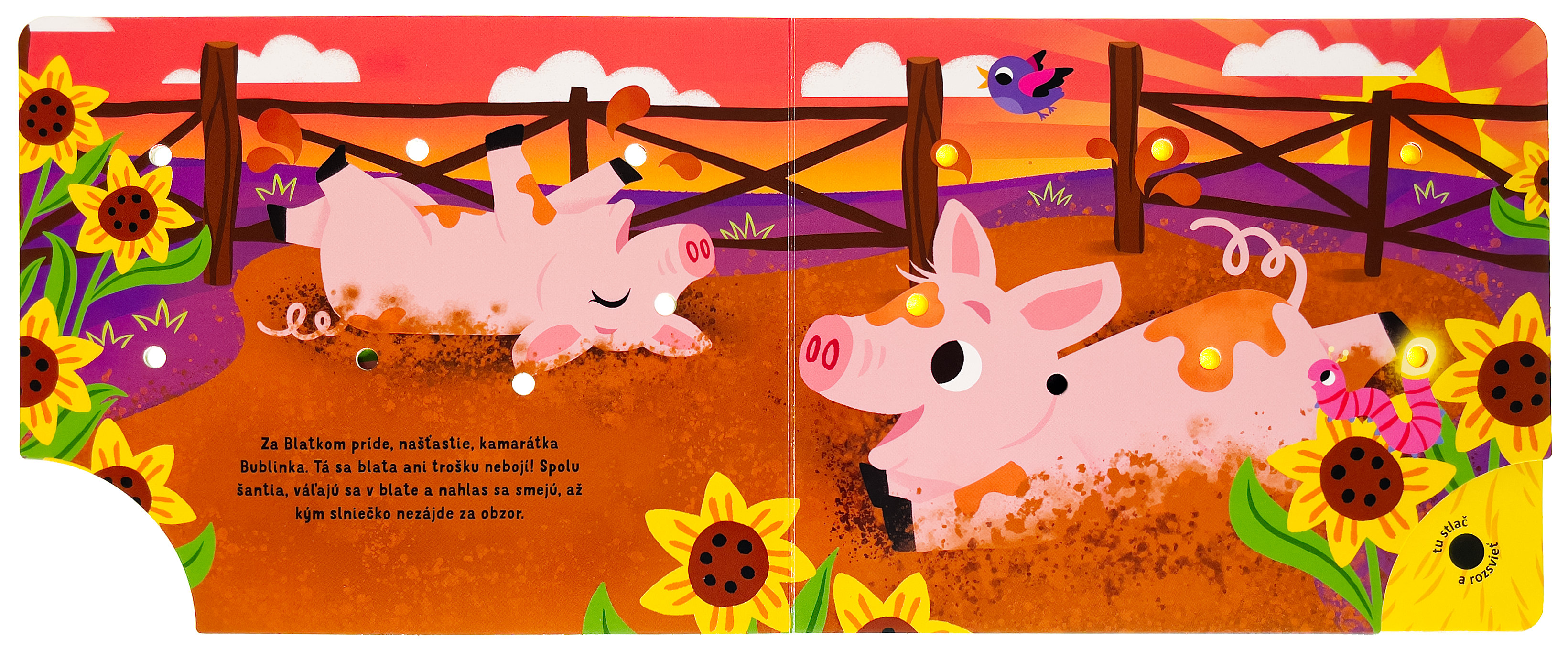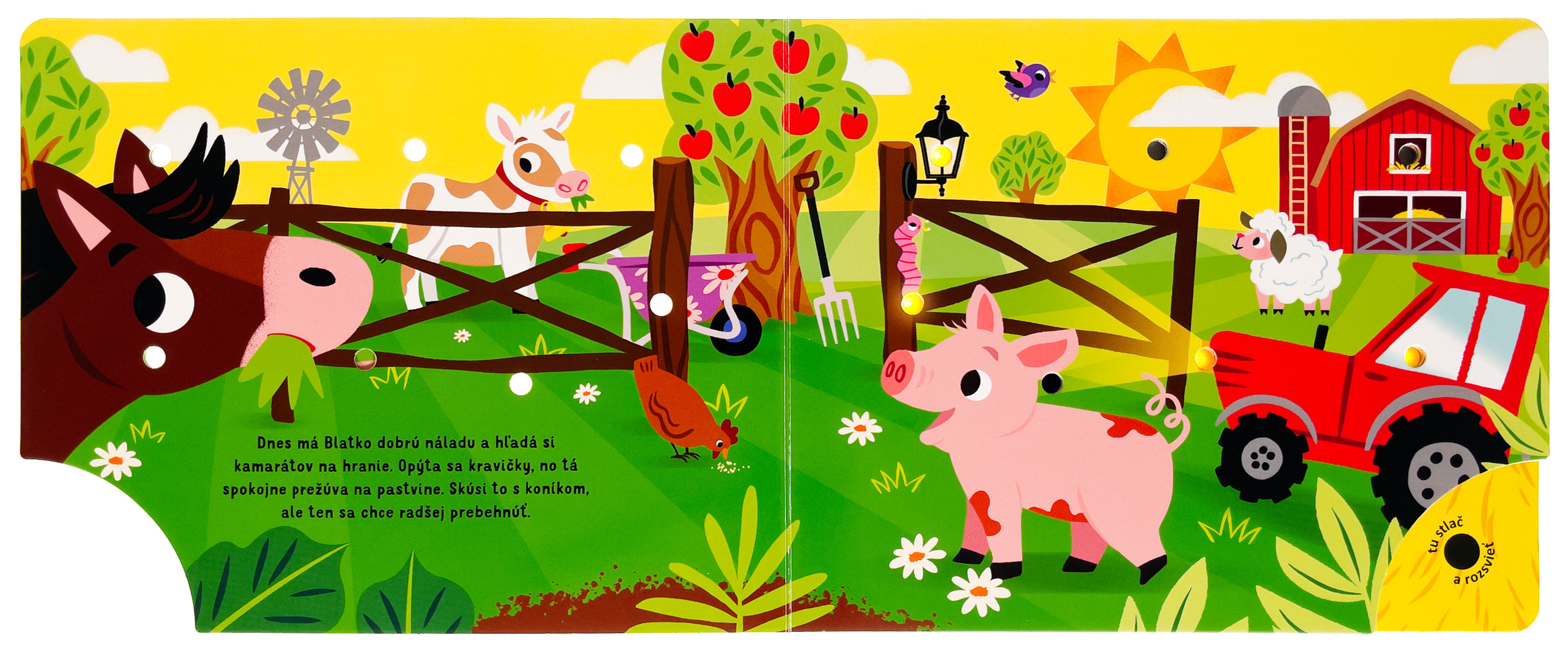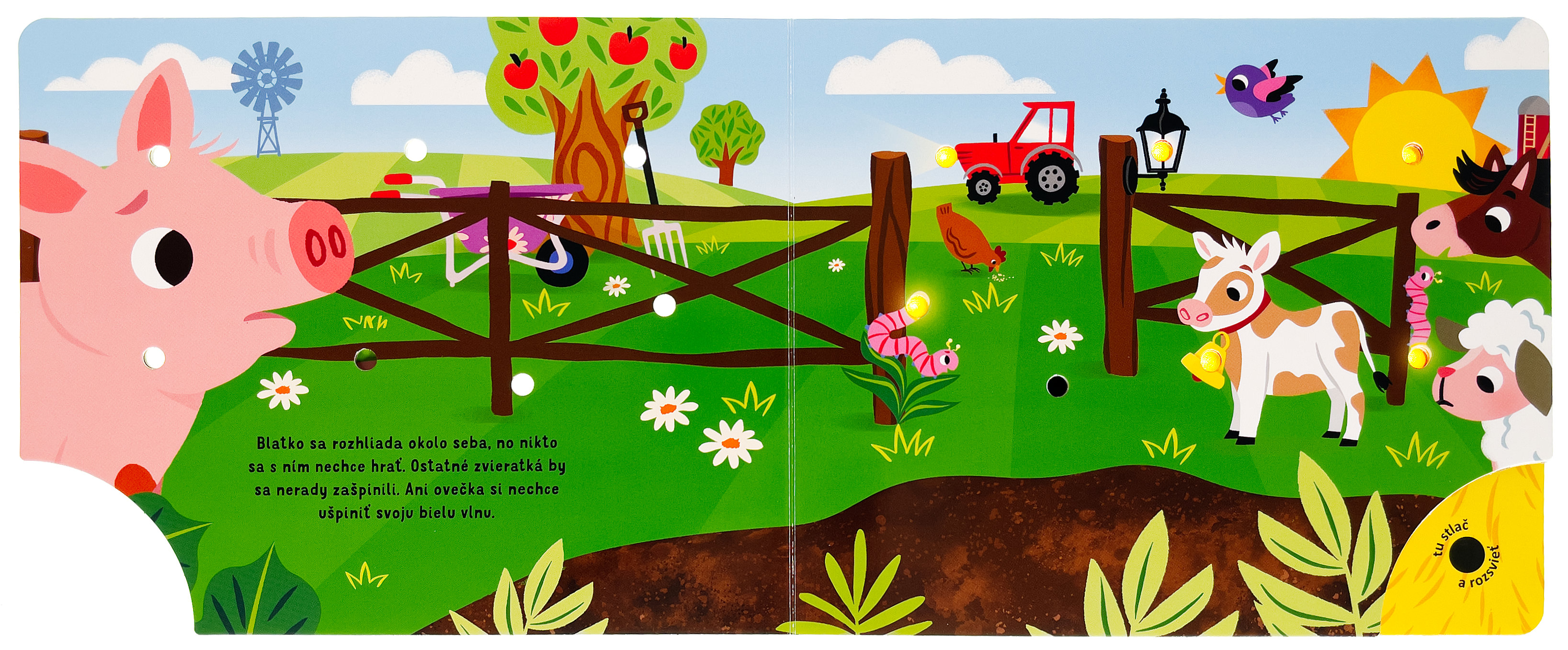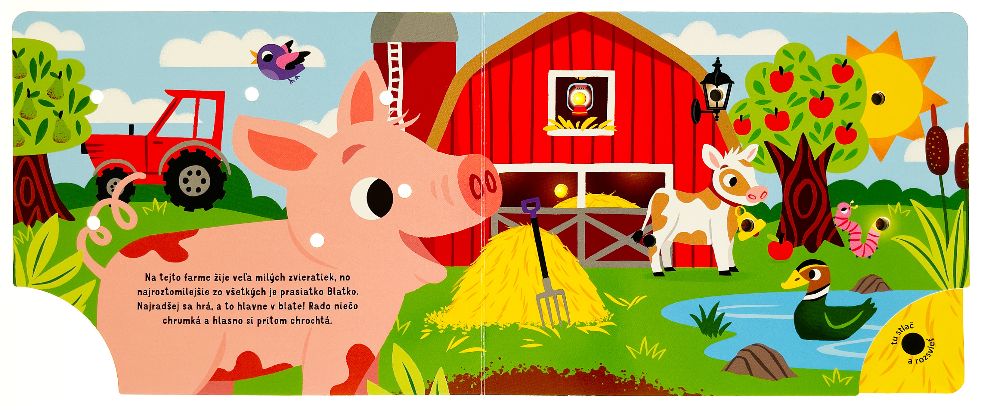 Prežite deň s jedným roztomilým teliatkom na farme v tomto leporele so svetielkami. Teliatko sa rado hrá s ostatnými zvieratami, ale po celom dni je unavené. Ulož ho do postieľky a fúknutím zhasni svetielka. Ako kniha funguje? Najprv stlač tlačidlo v pravom dolnom rohu a všetky svetlá na stránke sa rozsvietia. Potom fúkni do jediného otvoru, ktorý nesvieti, a všetky svetlá zhasnú. Ideálna knižka pred spaním.Počet strán: 10