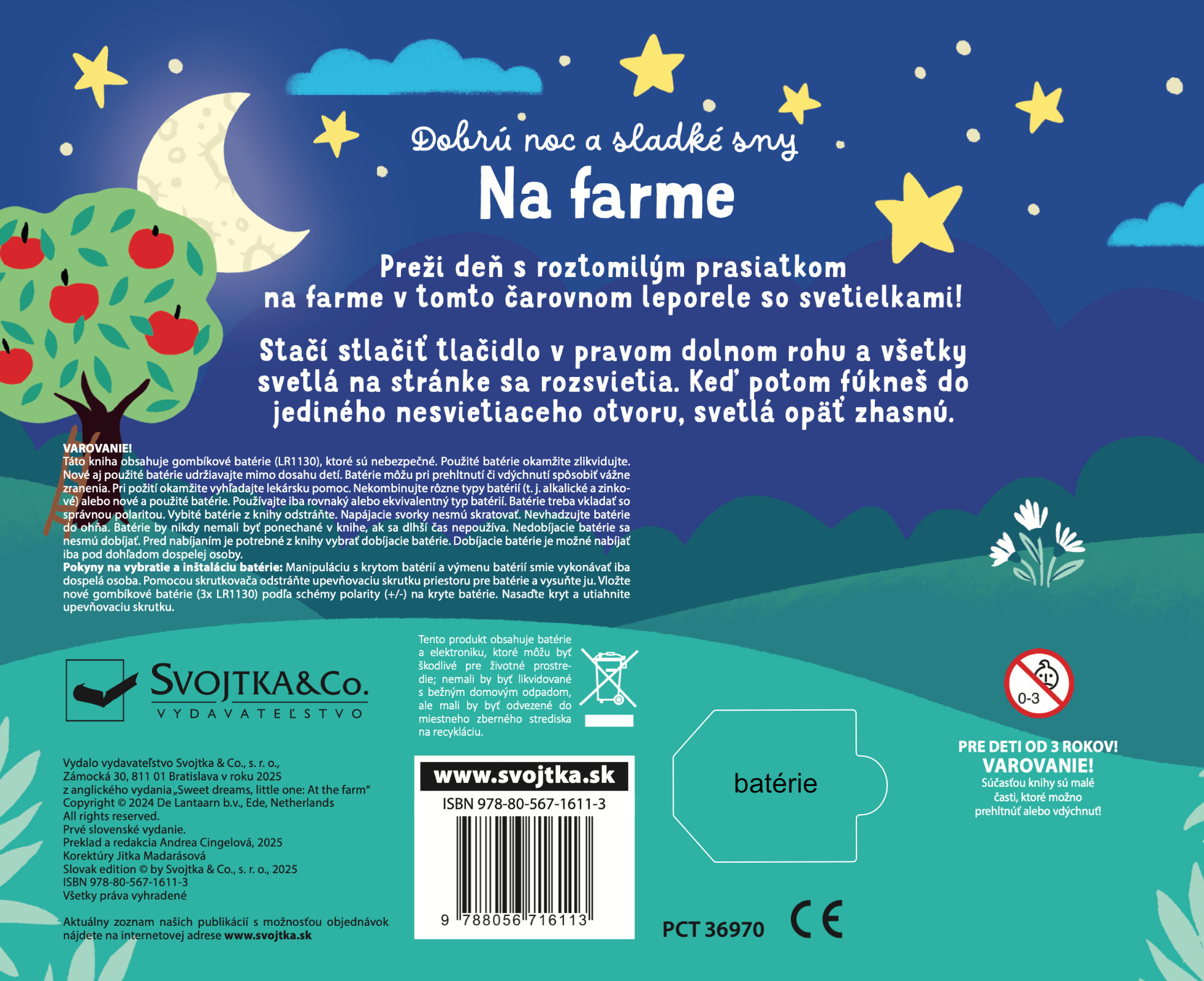 Šírka: 210Rozmery: 210 x 170 mmVäzba: Leporelo so svetielkamiExpedícia: 2025-10-31Vytlačené: ČínaTyp batérií: 3xAG10/LR1130Vek: 0-1, 1-2, 2-3Téma: farma, zvieratáTyp knihy: so svetielkami, pre chlapcov