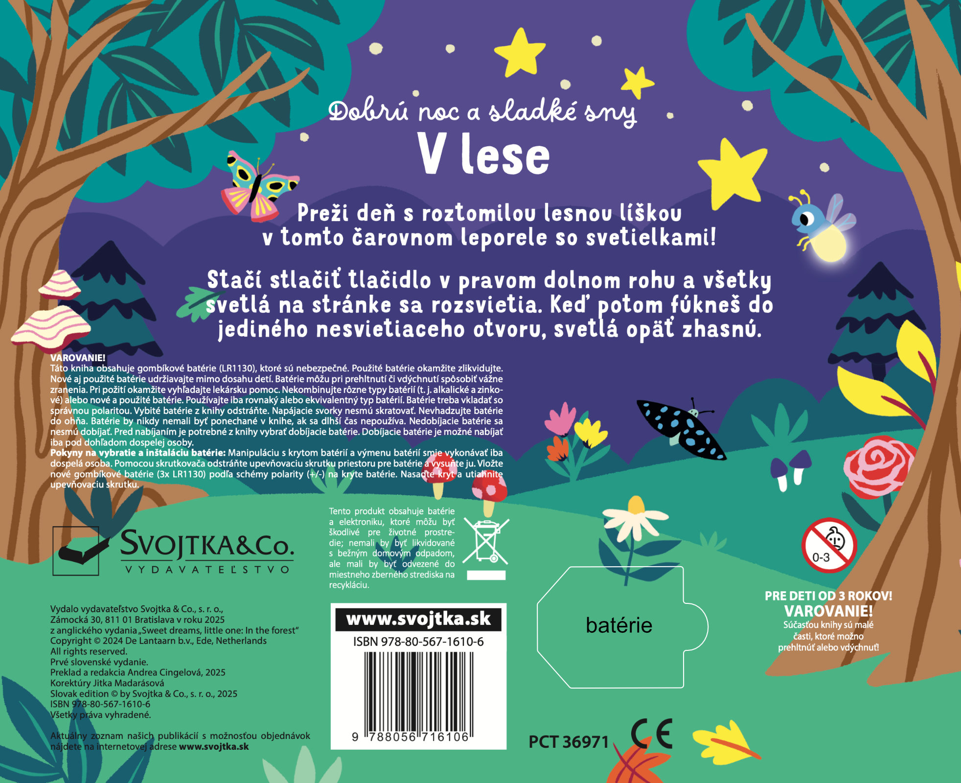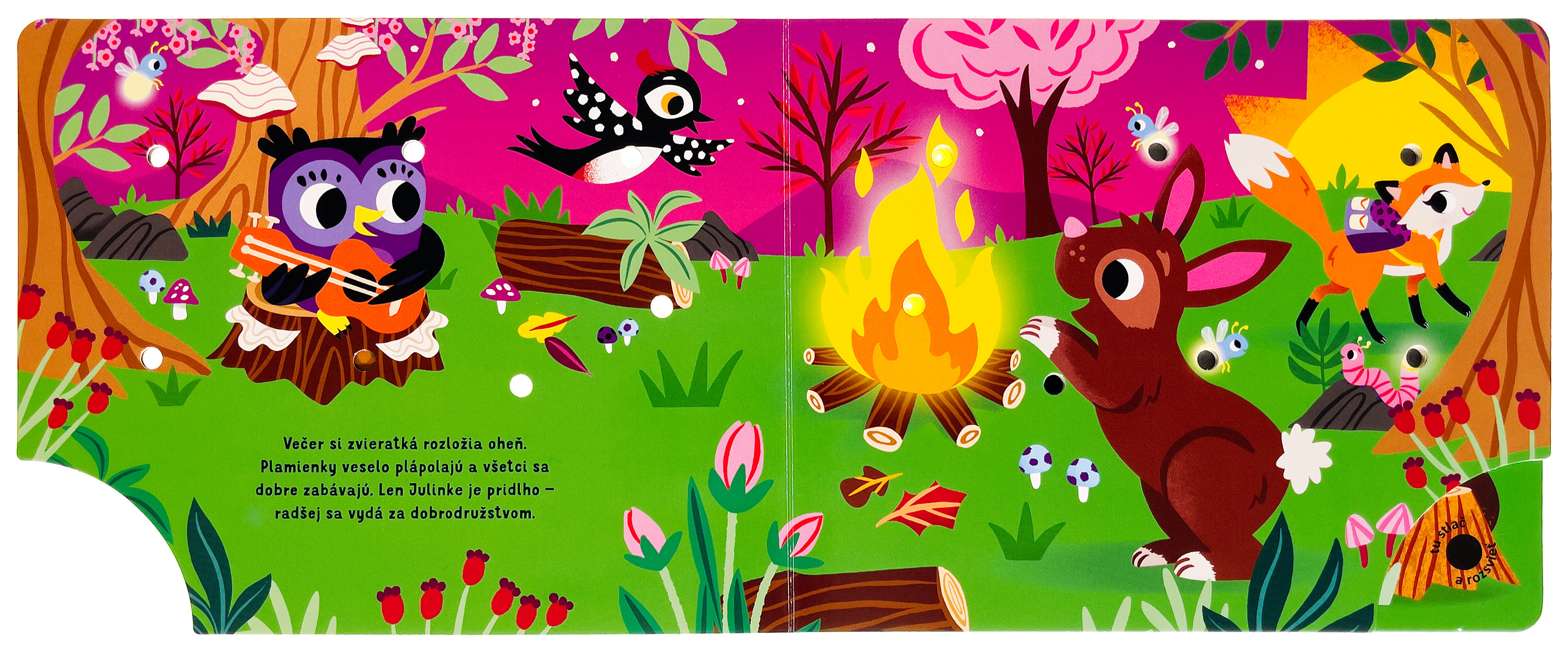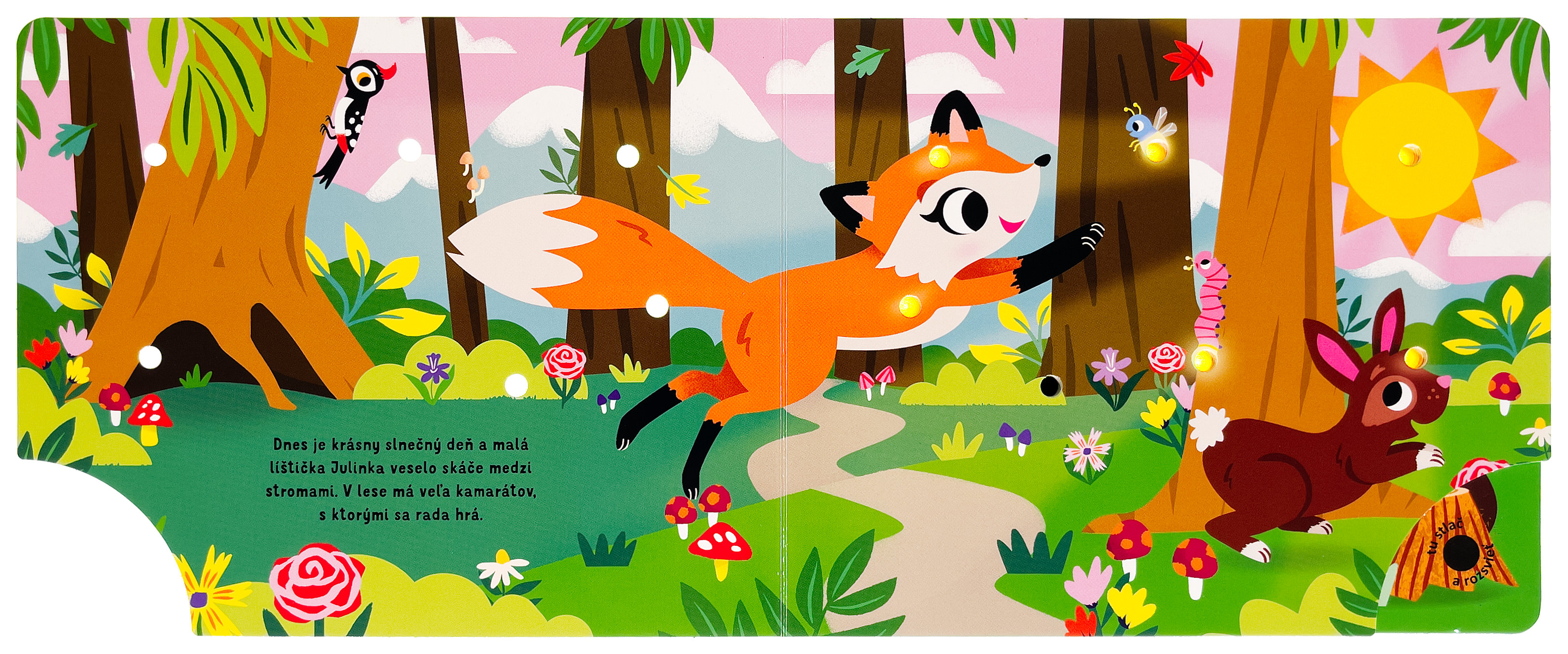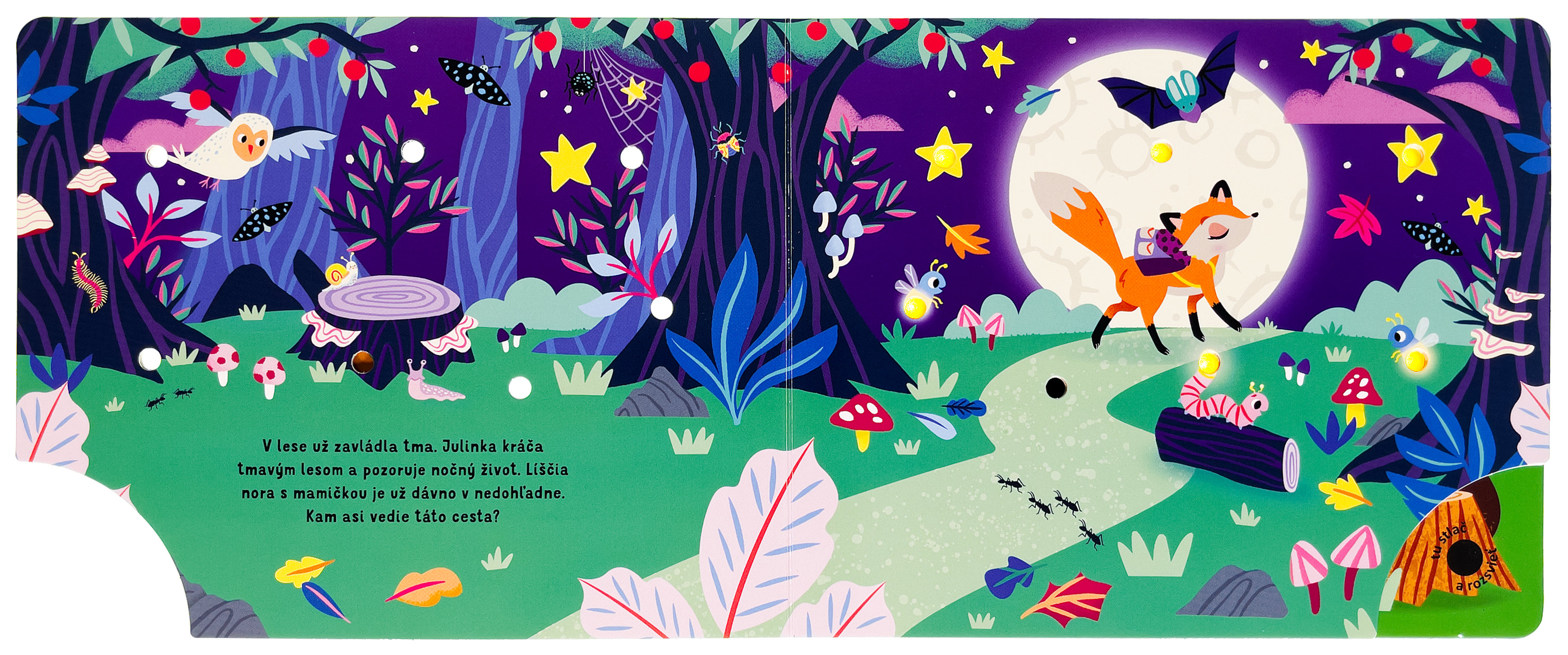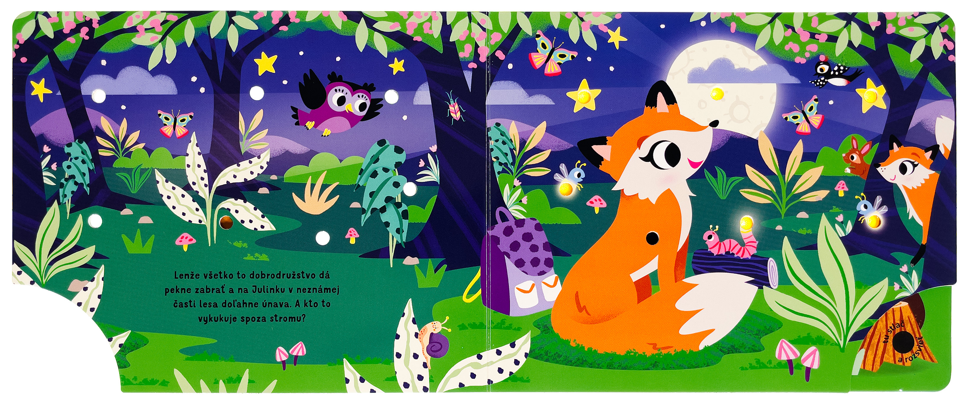 Prežite deň s jednou roztomilou líškou v tomto leporele so svetielkami. Malá líška Julinka sa vydáva na nočné dobrodružstvo lesom, ale zrazu na ňu doľahne únava. Ulož ju do postieľky v líščej nore a fúknutím zhasni svetielka. Ako kniha funguje? Najprv stlač tlačidlo v pravom dolnom rohu a všetky svetlá na stránke sa rozsvietia. Potom fúkni do jediného otvoru, ktorý nesvieti, a všetky svetlá zhasnú. Ideálna knižka pred spaním.Počet strán: 10