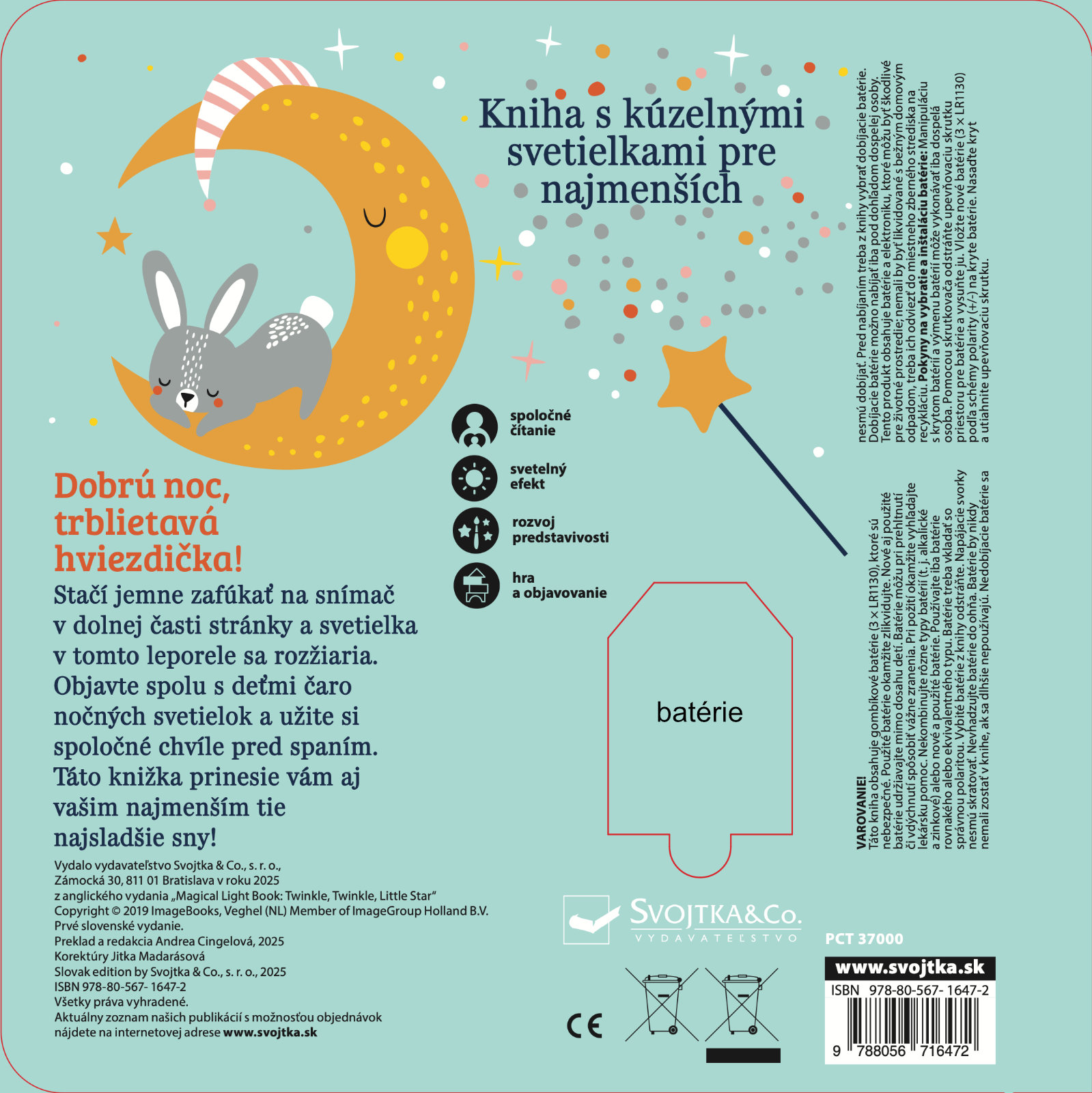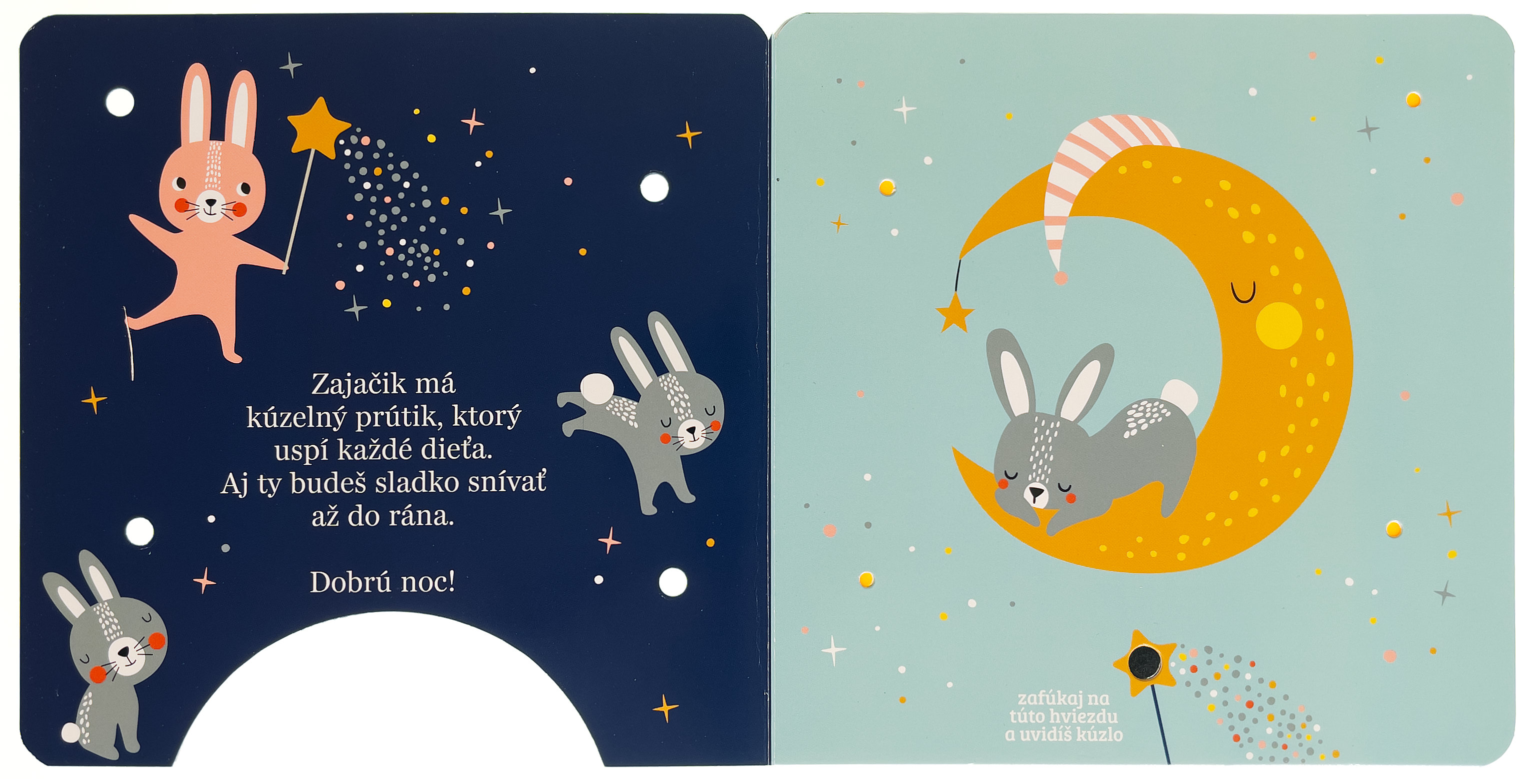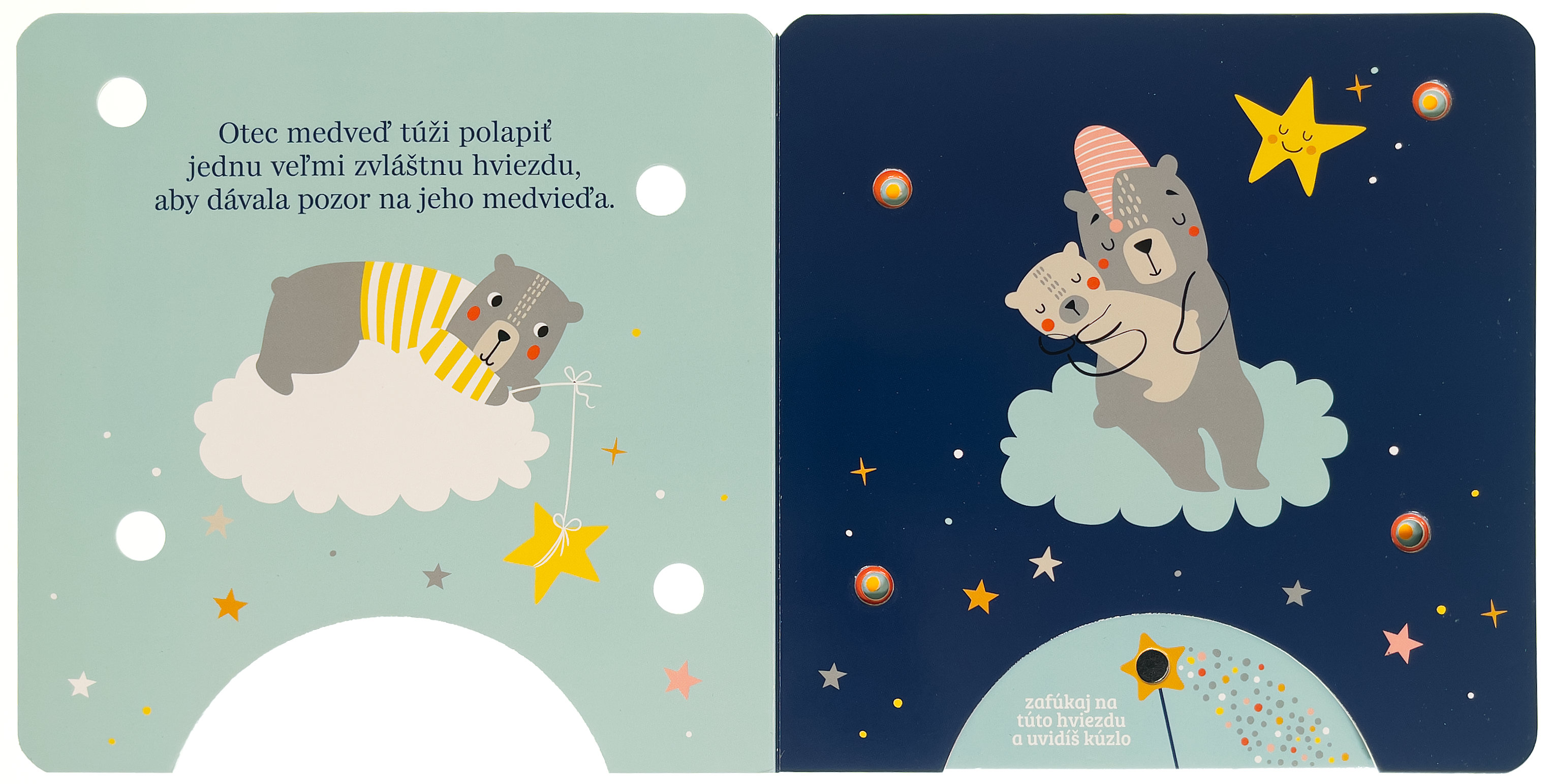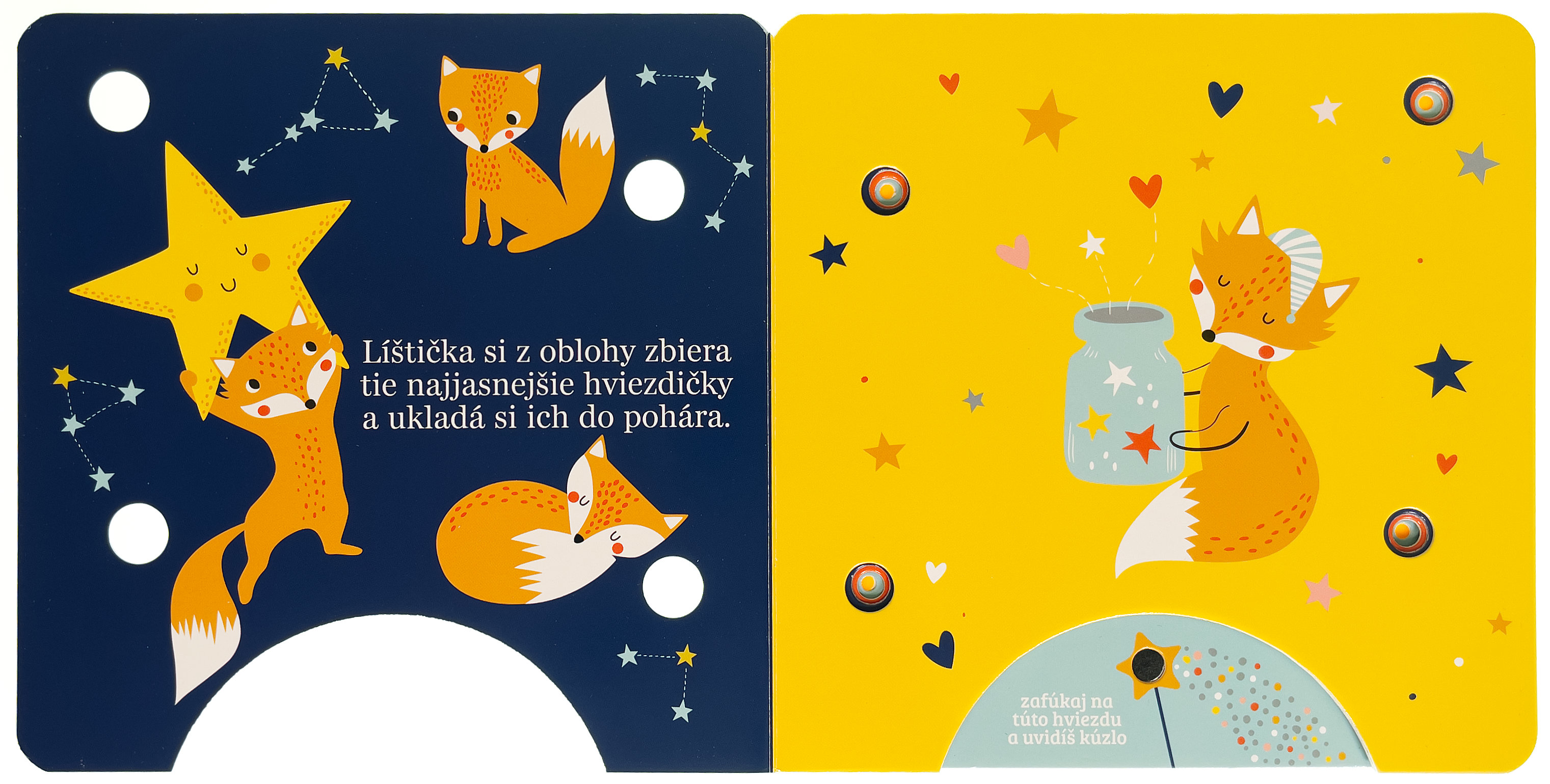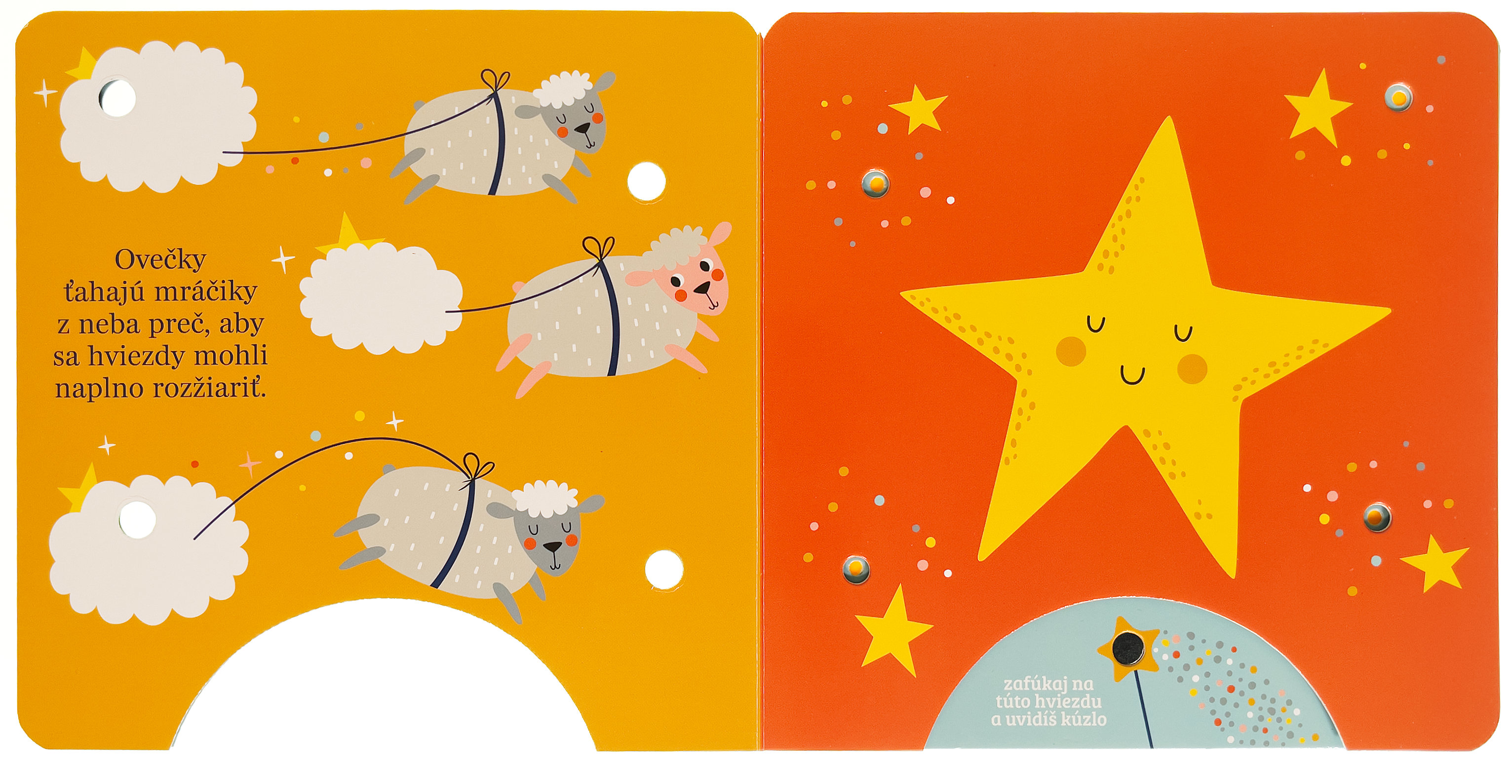 Stačí jemne zafúkať na snímač v dolnej časti knihy a rozžiaria sa kúzelné svetielka! Najmenšie deti sprevádza večerom líštička, medvedík, ovečka a zajačik, ktorí sa starajú o hviezdy na nočnej oblohe. Krátke nežné texty a svetelné efekty vytvárajú pokojnú atmosféru a podporujú spoločné čítanie pred spaním. Knižka rozvíja predstavivosť, podporuje spoločné čítanie a vďaka interaktívnemu prvku "fúkni a rozsvieť" prináša deťom radosť z objavovania aj pocit malého kúzla. Ideálny večerný rituál pre tie najsladšie sny.Počet strán: 8