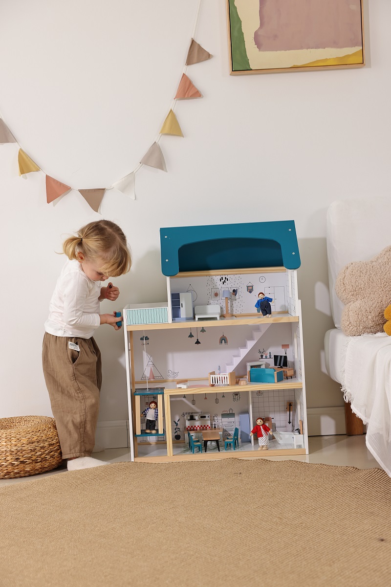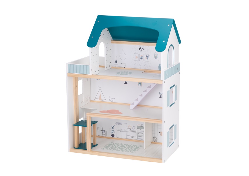 Rozmery balenia: 66,5x44,5x10 cm Rozmery domčeka: 61,5x80x29,5 cm Vek: 3+ Materiál: FSC® drevo, plast