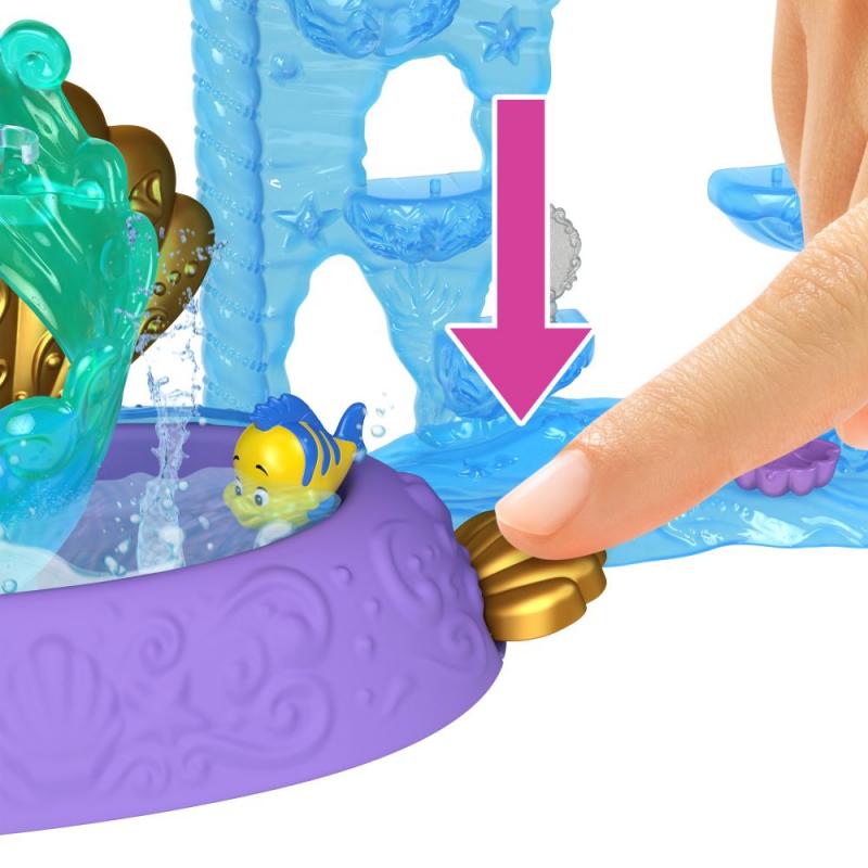 Herný set Malá bábika Ariel a kráľovský zámok obsahuje herné plochy pre hru na súši aj v mori a malú bábiku Ariel s plutvou, ktorá mení farbu! Dvojposchodový zámok ponúka poschodie s funkciou striekajúcej vody, ktorý predstavuje podmorský život morskej víly a poschodie s pohyblivým tanečným parketom predstavujúci Arielin život na súši. Nechýba ani jej verný kamarát Flounder a viac ako 10 rozprávkových herných dielikov pre kompletnú hru na morskú pannu a princeznú. Farby a vzhľad výrobku sa môžu líšiť.