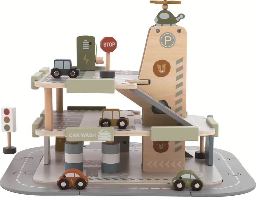 Všetkým automobilovým nadšencom sa rozžiaria oči, až uvidia garáž s cestou, výťahom a heliportom. Umiestnite dopravné značky, pripravte svoje autíčka a hra môže začať. Umyte svoje vozidlo v auto-umývačke. Natankujte pohonné hmoty pri stojane na prízemí. Máte elektro auto? Žiadny problém, vyvezte svoje vozidlo pomocou výťahu a pripojte ho k nabíjačke na druhom poschodí. Batéria je plná? Tak môžete vyraziť. Stala sa nehoda? Z heliportu na streche už štartuje vrtuľník. Táto edukatívna hračka motivuje deti ku kreatívnej a predstavivej hre. Rozvíja koordináciu ruka-oko, jemnú motoriku a zručnosť. Garáž s parkovacími plochami na troch úrovniach obsahuje aj cestu, 4 autíčka, helikoptéru a 3 dopravné značky. Hlavné vlastnosti: 3 podlažiagaráž s cestou, heliportom a výťahom, 4 autíčka, auto-umývačka, 2 tankovacie stojany (z toho 1 elektro), vrtuľník, 3 dopravné značkyinšpiruje ku kreatívnej a predstavivej hrerozvíja koordináciu ruka-oko, jemnú motoriku a zručnosťvhodné pre deti od 3 rokov
